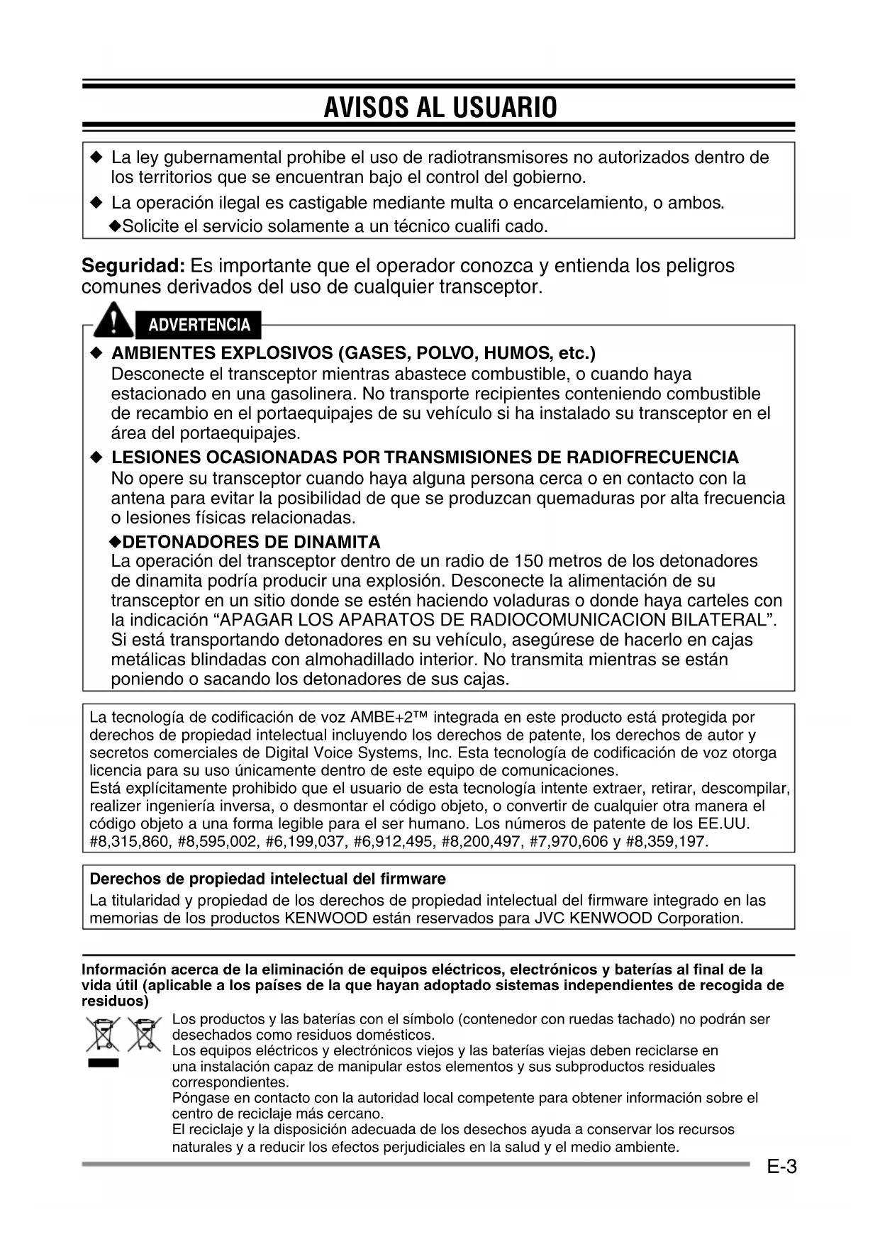 La operación del transceptor dentro de un radio de 150 metros de los detonadores de dinamita podría producir una explosión. Desconecte la alimentación de su transceptor en un sitio donde se estén haciendo voladuras o donde haya carteles con la indicación “APAGAR LOS APARATOS DE RADIOCOMUNICACION BILATERAL”. Si está transportando detonadores en su vehículo, asegúrese de hacerlo en cajas metálicas blindadas con almohadillado interior. No transmita mientras se están poniendo o sacando los detonadores de sus cajas. La tecnología de codificación de voz AMBE+2™ integrada en este producto está protegida por derechos de propiedad intelectual incluyendo los derechos de patente, los derechos de autor y secretos comerciales de Digital Voice Systems, Inc. Esta tecnología de codificación de voz otorga licencia para su uso únicamente dentro de este equipo de comunicaciones. Está explícitamente prohibido que el usuario de esta tecnología intente extraer, retirar, descompilar, realizer ingeniería inversa, o desmontar el código objeto, o convertir de cualquier otra manera el código objeto a una forma legible para el ser humano. Los números de patente de los EE.UU. #8,315,860, #8,595,002, #6,199,037, #6,912,495, #8,200,497, #7,970,606 y #8,359,197. Derechos de propiedad intelectual del firmware La titularidad y propiedad de los derechos de propiedad intelectual del firmware integrado en las memorias de los productos KENWOOD están reservados para JVC KENWOOD Corporation. Información acerca de la eliminación de equipos eléctricos, electrónicos y baterías al final de la vida útil (aplicable a los países de la que hayan adoptado sistemas independientes de recogida de residuos) Los productos y las baterías con el símbolo (contenedor con ruedas tachado) no podrán ser desechados como residuos domésticos. Los equipos eléctricos y electrónicos viejos y las baterías viejas deben reciclarse en una instalación capaz de manipular estos elementos y sus subproductos residuales correspondientes. Póngase en contacto con la autoridad local competente para obtener información sobre el centro de reciclaje más cercano. El reciclaje y la disposición adecuada de los desechos ayuda a conservar los recursos naturales y a reducir los efectos perjudiciales en la salud y el medio ambiente.E-4 PRECAUCIONES Observe las siguientes precauciones para evitar incendios, lesiones personales y daños al transceptor.