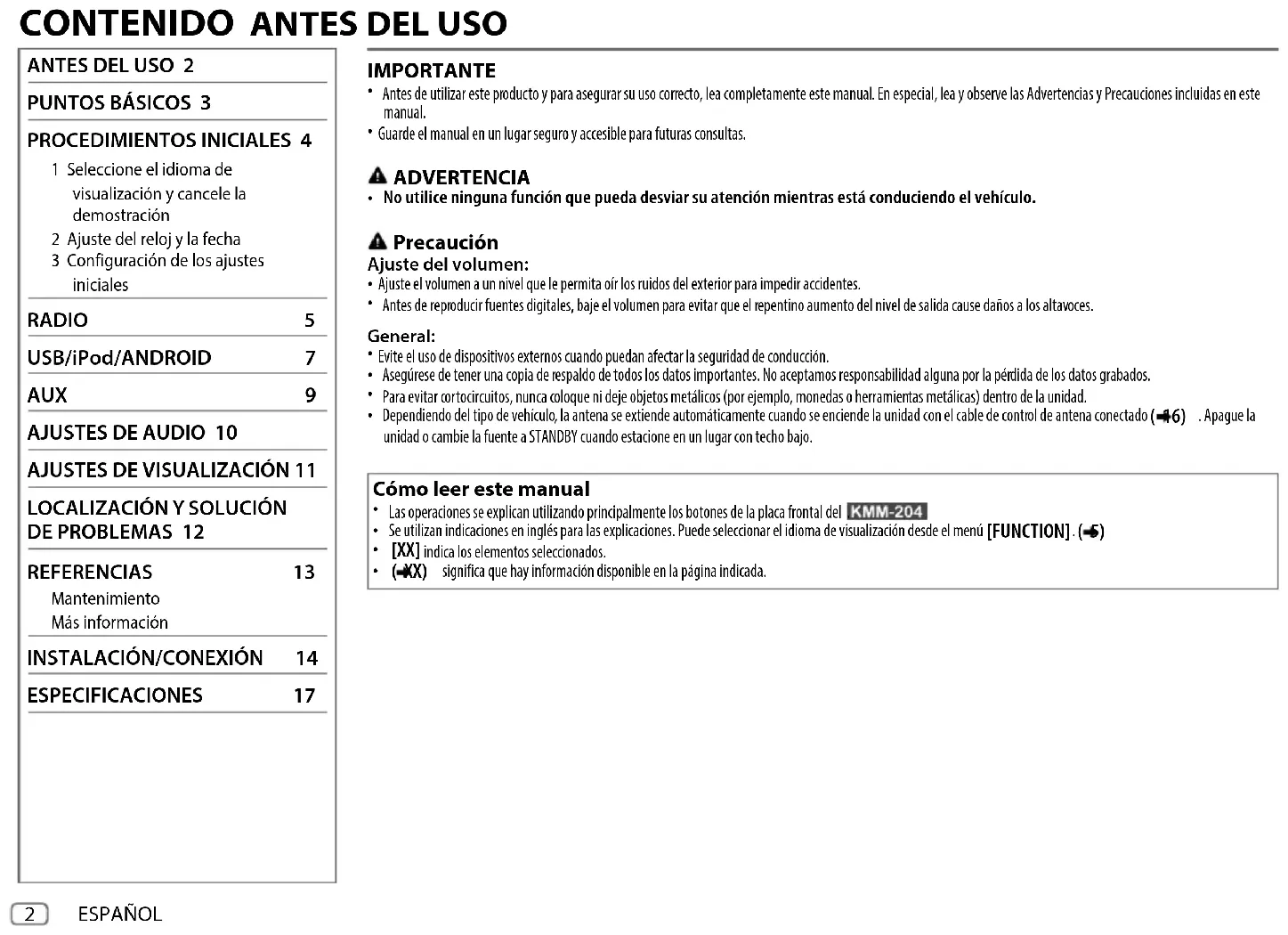 Respuesta de frecuencia (±1 dB) 20Hz—20kHz Relación señal a ruido (1 kHz) 105 dB Gama dinámica 88dB Separación de canales 90dB MP3 decodificado Compatible con MPEG-1/2 Audio Layer-3 WMA decodificado Compatible con Windows Media Audio WAV decodificado PCM lineal FLAC decodificado Archivo FLAC (Hasta 48kHz/16bits) Audio Potencia de salida máxima 50W×4 Potencia en todo el ancho de banda 22W×4 (a menos del 1 % THD) Impedancia del altavoz 4—8 Acción tonal Graves 100 Hz ±8 dB Registro medio 1,0kHz ±8 dB Agudos 12,5kHz ±8 dB Nivel de salida de preamplificador/carga (USB) 2 500 mV/10k Impedancia de salida de preamplificador ≤600 Auxiliar Respuesta de frecuencia (±3 dB) 20 Hz — 20 kHz Voltaje de entrada máximo 1 000mV Impedancia de entrada 30k General Voltaje de trabajo 14,4 V (10,5 V —16 V admisibles) Consumo de corriente máxima 10A Gama de temperaturas de funcionamiento –10°C—+60°C Tamaño de instalación (An×Al× F) 182mm×53mm×100mm Peso neto (incluyendo placa embellecedora, manguito de montaje) 0,6kg Sujeto a cambios sin previo aviso. JS_KWD_KMM_204_EN_SP.indd 17JS_KWD_KMM_204_EN_SP.indd 17 24/8/2017 3:19:14 PM24/8/2017 3:19:14 PMJS_KWD_KMM_204_EN_SP.indd 18JS_KWD_KMM_204_EN_SP.indd 18 24/8/2017 3:19:14 PM24/8/2017 3:19:14 PMJS_KWD_KMM_204_EN_SP.indd 19JS_KWD_KMM_204_EN_SP.indd 19 24/8/2017 3:19:14 PM24/8/2017 3:19:14 PMData Size: B6L (182 mm x 128 mm) Book Size: B6L (182 mm x 128 mm) JS_KWD_KMM_204_EN_C01.indd 2JS_KWD_KMM_204_EN_C01.indd 2 20/6/2017 9:27:06 AM20/6/2017 9:27:06 AM