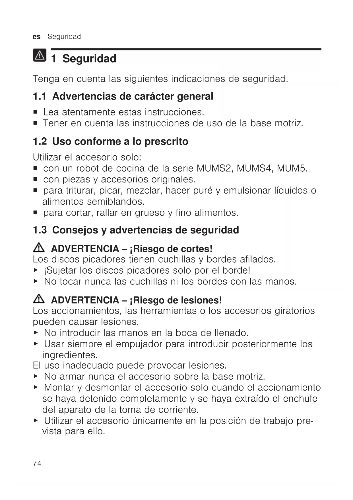 1 Seguridad Tenga en cuenta las siguientes indicaciones de seguridad. 1.1 Advertencias de carácter general ¡ Lea atentamente estas instrucciones. ¡ Tener en cuenta las instrucciones de uso de la base motriz. 1.2 Uso conforme a lo prescrito Utilizar el accesorio solo: ¡ con un robot de cocina de la serie MUMS2, MUMS4, MUM5. ¡ con piezas y accesorios originales. ¡ para triturar, picar, mezclar, hacer puré y emulsionar líquidos o alimentos semiblandos. ¡ para cortar, rallar en grueso y fino alimentos. 1.3 Consejos y advertencias de seguridad ADVERTENCIA‒¡Riesgo de cortes! Los discos picadores tienen cuchillas y bordes afilados. ▶ ¡Sujetar los discos picadores solo por el borde! ▶ No tocar nunca las cuchillas ni los bordes con las manos. ADVERTENCIA‒¡Riesgo de lesiones! Los accionamientos, las herramientas o los accesorios giratorios pueden causar lesiones. ▶ No introducir las manos en la boca de llenado. ▶ Usar siempre el empujador para introducir posteriormente los ingredientes. El uso inadecuado puede provocar lesiones. ▶ No armar nunca el accesorio sobre la base motriz. ▶ Montar y desmontar el accesorio solo cuando el accionamiento se haya detenido completamente y se haya extraído el enchufe del aparato de la toma de corriente. ▶ Utilizar el accesorio únicamente en la posición de trabajo pre- vista para ello.Evitar daños materiales es