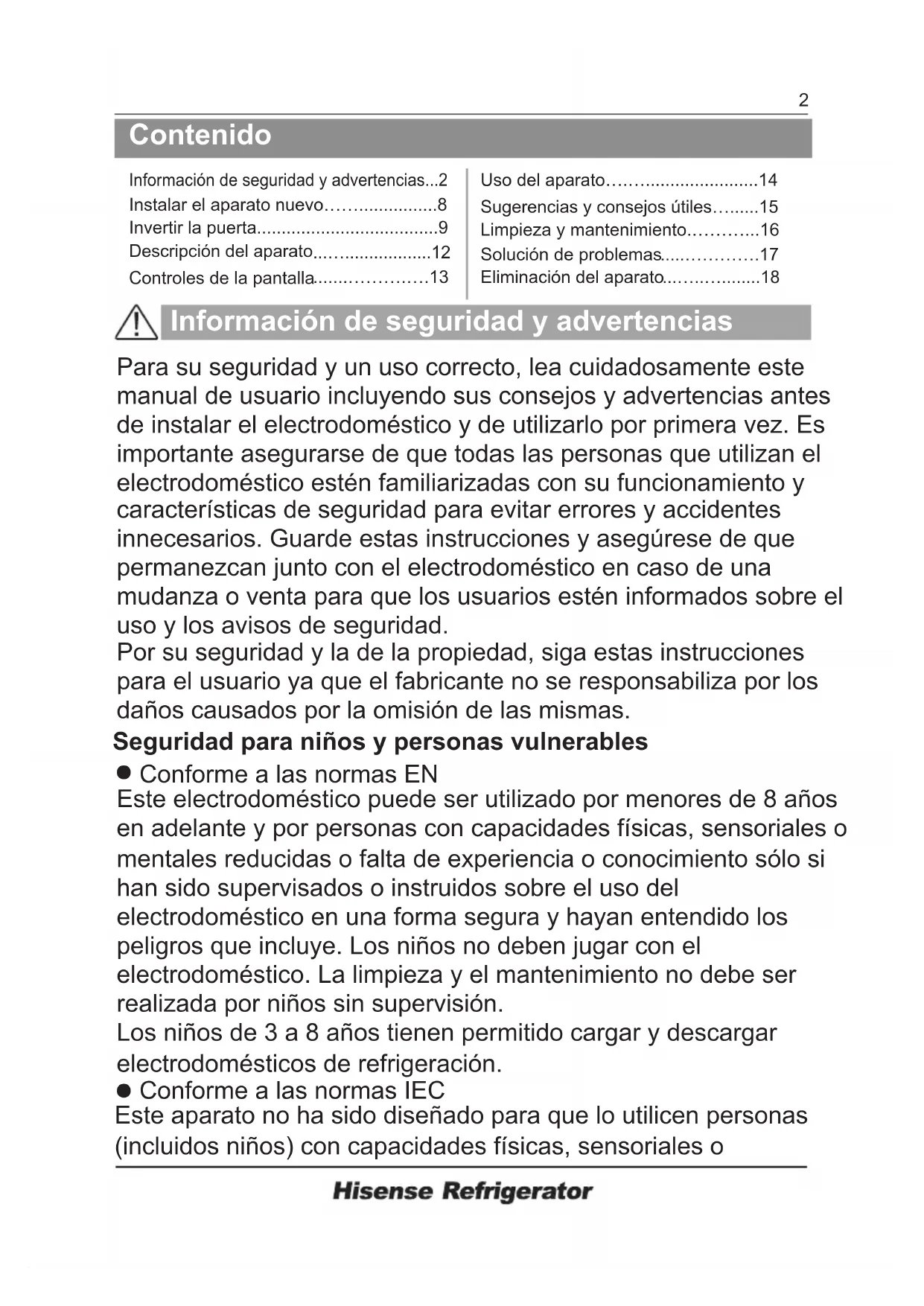 Antes de utilizar esta unidad, lea detenidamente este manual y consérvelo para consultas futuras2 Conforme a las normas EN Conforme a las normas IEC Para su seguridad y un uso correcto, lea cuidadosamente este manual de usuario incluyendo sus consejos y advertencias antes de instalar el electrodoméstico y de utilizarlo por primera vez. Es importante asegurarse de que todas las personas que utilizan el electrodoméstico estén familiarizadas con su funcionamiento y características de seguridad para evitar errores y accidentes innecesarios. Guarde estas instrucciones y asegúrese de que permanezcan junto con el electrodoméstico en caso de una mudanza o venta para que los usuarios estén informados sobre el uso y los avisos de seguridad. Por su seguridad y la de la propiedad, siga estas instrucciones para el usuario ya que el fabricante no se responsabiliza por los daños causados por la omisión de las mismas. Este electrodoméstico puede ser utilizado por menores de 8 años en adelante y por personas con capacidades físicas, sensoriales o mentales reducidas o falta de experiencia o conocimiento sólo si han sido supervisados o instruidos sobre el uso del electrodoméstico en una forma segura y hayan entendido los peligros que incluye. Los niños no deben jugar con el electrodoméstico. La limpieza y el mantenimiento no debe ser realizada por niños sin supervisión. Los niños de 3 a 8 años tienen permitido cargar y descargar electrodomésticos de refrigeración. Este aparato no ha sido diseñado para que lo utilicen personas (incluidos niños) con capacidades físicas, sensoriales o Seguridad para niños y personas vulnerables