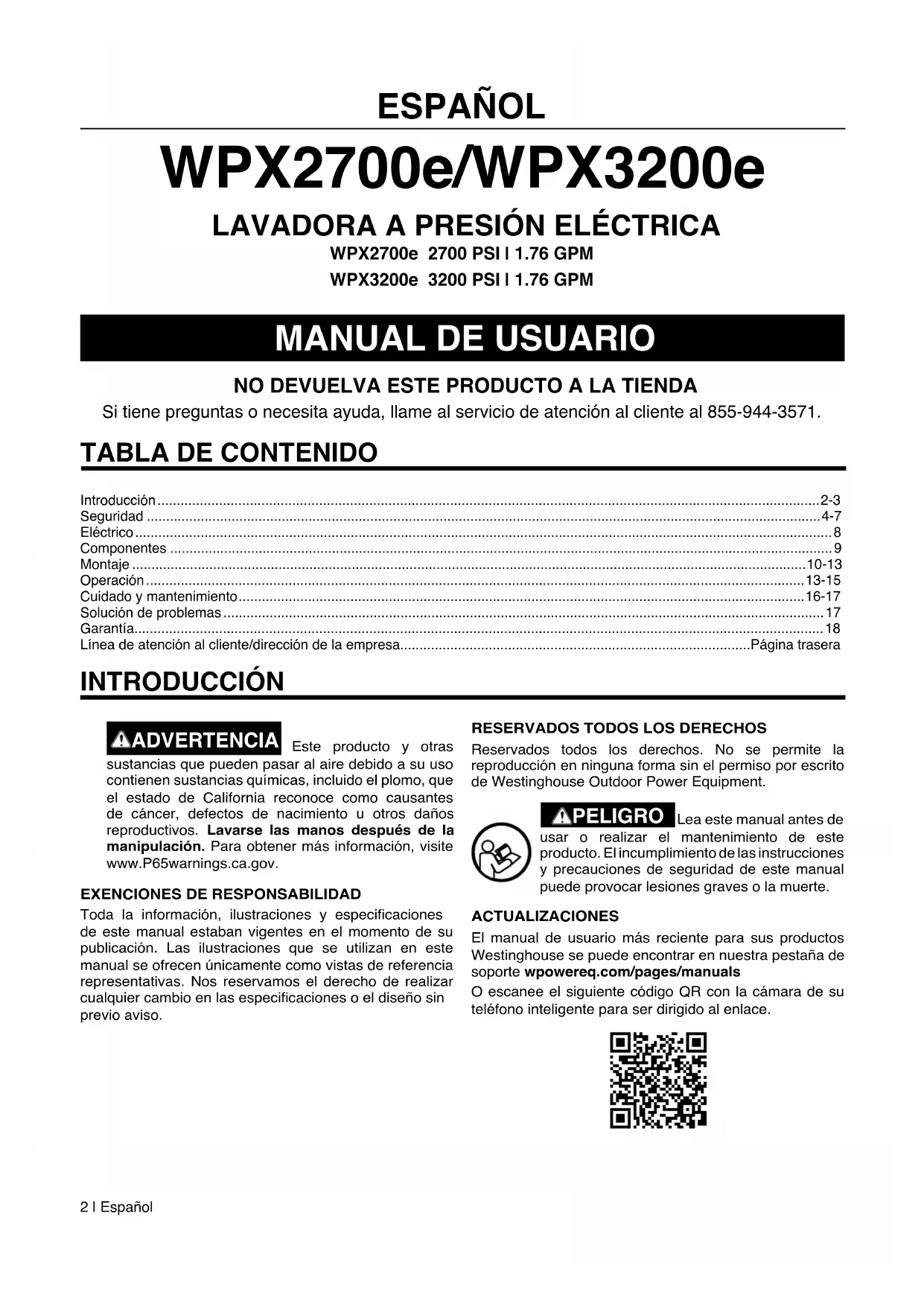 Garantía...................................................................................................................................................................................18 Línea de atención al cliente/dirección de la empresa...........................................................................................Página trasera3 | Español ESPECIFICACIONES (WPX3200e) Temperatura del agua.......................................Solo agua fríaPresión máxima ........................................................3200 PSIPresión máxima nominal ..........................................2800 PSICaudal máximo de agua.................. 1,76 US GPM (6,7 LPM)Caudal de agua nominal.................. 1,1 US GPM (4,16 LPM)Fase............................................................................... ÚnicoEntrada ...........................120 V, solo CA, 60 Hz, 13 amperios AVISO ¡Gracias por elegir Westinghouse! POR FAVOR LEA ANTES DE DEVOLVER ESTE PRODUCTO POR CUALQUIER MOTIVO.Si tiene alguna pregunta o experimenta un problema con su compra de Westinghouse, llámenos al 1-855-944-3571 para hablar con un agente. GUARDE ESTE MANUAL PARA FUTURAS CONSULTAS. ADVERTENCIA NUNCA rocíe directamente sobre una persona, un animal, un dispositivo eléctrico o la unidad misma. El incumplimiento de esta advertencia podría provocar lesiones graves, descargas eléctricas o la muerte. AVISO NUNCA permita que la bomba de la lavadora a presión funcione durante más de un minuto después de haber cerrado el suministro de agua. Esto puede hacer que el motor y la bomba se sobrecalienten y fallen. SIEMPRE desenrolle completamente la manguera de jardín y retire cualquier objeto que pueda estar restringiendo o impidiendo el ujo de agua a la máquina. ¿TIENE PREGUNTAS? Envíenos un correo electrónico a service@wpowereq.com o llame al 1-855-944-3571 INTRODUCTION