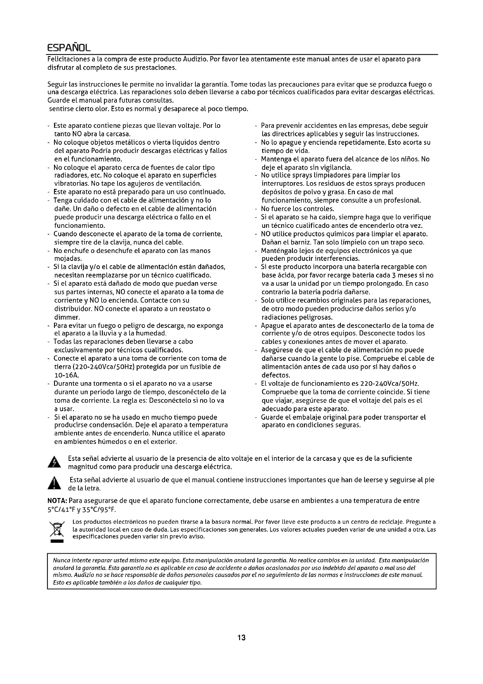 Wiedergabe zu steuern.13 Felicitaciones a la compra de este producto Audizio. Por favor lea atentamente este manual antes de usar el aparato para disfrutar al completo de sus prestaciones. Seguir las instrucciones le permite no invalidar la garantía. Tome todas las precauciones para evitar que se produzca fuego o una descarga eléctrica. Las reparaciones solo deben llevarse a cabo por técnicos cualificados para evitar descargas eléctricas. Guarde el manual para futuras consultas. sentirse cierto olor. Esto es normal y desaparece al poco tiempo. - Este aparato contiene piezas que llevan voltaje. Por lo tanto NO abra la carcasa. - No coloque objetos metálicos o vierta líquidos dentro del aparato Podría producir descargas eléctricas y fallos en el funcionamiento. - No coloque el aparato cerca de fuentes de calor tipo radiadores, etc. No coloque el aparato en superficies vibratorias. No tape los agujeros de ventilación. - Este aparato no está preparado para un uso continuado. - Tenga cuidado con el cable de alimentación y no lo dañe. Un daño o defecto en el cable de alimentación puede producir una descarga eléctrica o fallo en el funcionamiento. - Cuando desconecte el aparato de la toma de corriente, siempre tire de la clavija, nunca del cable. - No enchufe o desenchufe el aparato con las manos mojadas. - Si la clavija y/o el cable de alimentación están dañados, necesitan reemplazarse por un técnico cualificado. - Si el aparato está dañado de modo que puedan verse sus partes internas, NO conecte el aparato a la toma de corriente y NO lo encienda. Contacte con su distribuidor. NO conecte el aparato a un reostato o dimmer. - Para evitar un fuego o peligro de descarga, no exponga el aparato a la lluvia y a la humedad. - Todas las reparaciones deben llevarse a cabo exclusivamente por técnicos cualificados. - Conecte el aparato a una toma de corriente con toma de tierra (220-240Vca/50Hz) protegida por un fusible de 10-16A. - Durante una tormenta o si el aparato no va a usarse durante un periodo largo de tiempo, desconéctelo de la toma de corriente. La regla es: Desconéctelo si no lo va a usar. - Si el aparato no se ha usado en mucho tiempo puede producirse condensación. Deje el aparato a temperatura ambiente antes de encenderlo. Nunca utilice el aparato en ambientes húmedos o en el exterior. - Para prevenir accidentes en las empresas, debe seguir las directrices aplicables y seguir las instrucciones. - No lo apague y encienda repetidamente. Esto acorta su tiempo de vida. - Mantenga el aparato fuera del alcance de los niños. No deje el aparato sin vigilancia. - No utilice sprays limpiadores para limpiar los interruptores. Los residuos de estos sprays producen depósitos de polvo y grasa. En caso de mal funcionamiento, siempre consulte a un profesional. - No fuerce los controles. - Si el aparato se ha caído, siempre haga que lo verifique un técnico cualificado antes de encenderlo otra vez. - NO utilice productos químicos para limpiar el aparato. Dañan el barniz. Tan solo límpielo con un trapo seco. - Manténgalo lejos de equipos electrónicos ya que pueden producir interferencias. - Si este producto incorpora una batería recargable con base ácida, por favor recarge bateria cada 3 meses si no va a usar la unidad por un tiempo prolongado. En caso contrario la batería podría dañarse. - Solo utilice recambios originales para las reparaciones, de otro modo pueden producirse daños serios y/o radiaciones peligrosas. - Apague el aparato antes de desconectarlo de la toma de corriente y/o de otros equipos. Desconecte todos los cables y conexiones antes de mover el aparato. - Asegúrese de que el cable de alimentación no puede dañarse cuando la gente lo pise. Compruebe el cable de alimentación antes de cada uso por si hay daños o defectos. - El voltaje de funcionamiento es 220-240Vca/50Hz. Compruebe que la toma de corriente coincide. Si tiene que viajar, asegúrese de que el voltaje del país es el adecuado para este aparato. - Guarde el embalaje original para poder transportar el aparato en condiciones seguras. Esta señal advierte al usuario de la presencia de alto voltaje en el interior de la carcasa y que es de la suficiente magnitud como para producir una descarga eléctrica. Esta señal advierte al usuario de que el manual contiene instrucciones importantes que han de leerse y seguirse al pie de la letra. NOTA: Para asegurarse de que el aparato funcione correctamente, debe usarse en ambientes a una temperatura de entre 5°C/41°F y 35°C/95°F. Los productos electrónicos no pueden tirarse a la basura normal. Por favor lleve este producto a un centro de reciclaje. Pregunte a la autoridad local en caso de duda. Las especificaciones son generales. Los valores actuales pueden variar de una unidad a otra. Las especificaciones pueden variar sin previo aviso.