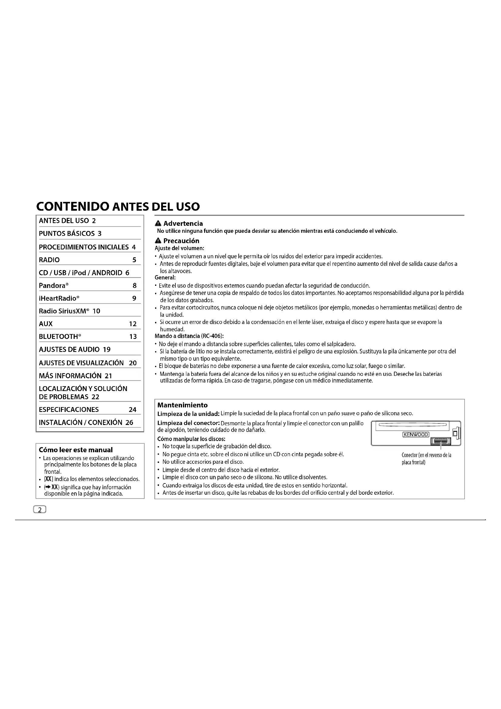 Vuelva a iniciar el dispositivo Android. Pandora “ADDERROR” / “SEARCHERROR” Fracasó la creación de la nueva emisora. “CHECKDEVICE” Verifique la aplicación Pandora en su dispositivo. “NO SKIPS” Se ha llegado al límite de saltos. “NO STATIONS” No se pueden encontrar emisoras. “STATIONLIMIT” Se alcanzó el número límite de emisoras registradas. Vuelva a intentarlo después de eliminar emisoras que no necesite de su dispositivo. “CONNECT ERROR” La comunicación es inestable. “RATING ERROR” El registro con el pulgar arriba/abajo ha fracasado. “LICENSE ERROR” Está intentando acceder desde un país donde Pandora no está disponible. iHeartRadio No se pudo seleccionar iHeartRadio. Si se marca “Explicit Content” en [Account Settings] en la versión web de iHeartRADIO, las emisoras personalizadas no estarán disponibles. “CANNOT CREATE” Fracasó la creación del nombre de la emisora personalizada. “CANNOT SAVE” Fracasó la adición a la categoría de favoritos. “DISCONNECTED” Verifique la conexión con el dispositivo. “NO SKIPS” Se ha llegado al límite de saltos. Vuelva a intentar más tarde. JS_KWD_KDC_X599_KW_SP.indd 23JS_KWD_KDC_X599_KW_SP.indd 23 8/25/2014 9:10:17 AM8/25/2014 9:10:17 AM24 Data Size: B6L (182 mm x 128 mm) Book Size: B6L (182 mm x 128 mm) ESPECIFICACIONES Sintonizador FM Gama de frecuencias 87,9MHz—107,9MHz (espacio 200 kHz) Sensibilidad útil (Relación señal/ruido = 26dB) 8,2 dBf (0,71V/75) Sensibilidad de silenciamiento (DIN S/N = 46dB) 17,2 dBf (2,0V/75) Respuesta de frecuencia (±3 dB) 30Hz—15kHz Relación señal a ruido (MONO) 64dB Separación estéreo (1 kHz) 40dB AM Gama de frecuencias 530kHz — 1700kHz (espacio 10kHz) Sensibilidad útil (Relación señal/ruido = 20dB) 29 dBµ (28,2 µV) Reproductor de CD Diodo láser GaAIAs Filtro digital (D/A) 8 veces sobremuestreo Velocidad de giro 500rpm — 200rpm (CLV) Fluctuación y trémolo Por debajo del límite medible Respuesta de frecuencia (±1 dB) 20Hz—20kHz Distorsión armónica total (1 kHz) 0,01% Relación señal a ruido (1 kHz) : 110dB Otros modelos: 105 dB Gama dinámica 90dB Separación de canales 85dB Síntoma Solución Bluetooth® No se detecta ningún dispositivo Bluetooth.