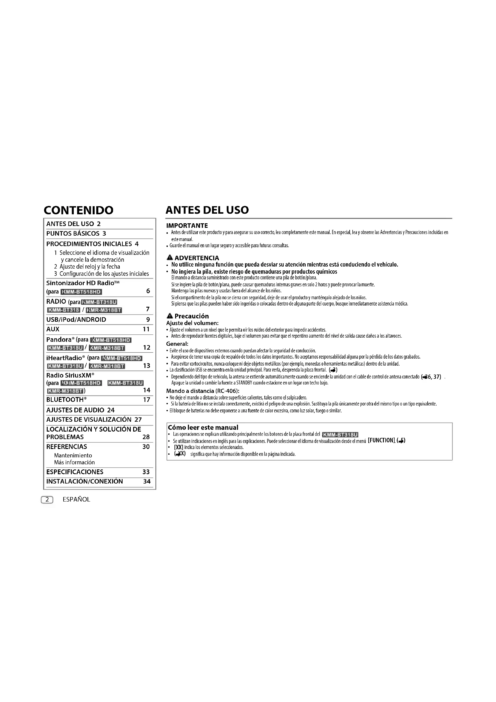 For your records Record the serial number, found on the back of the unit, in the spaces designated on the warranty card, and in the space provided below. Refer to the model and serial numbers whenever you call upon your Kenwood dealer for information or service on the product. Model KMM-BT518HD/KMM-BT318U/KMM-BT318/KMR-M318BT Serial number US Residents Only Register Online Register your Kenwood product at http://www.kenwood.com/usa/ B5A-1343-10 (KN)© 2016 JVC KENWOOD Corporation KMR-M318BT JS_KWD_KMM_BT518HD_KN_C_5.indd 1JS_KWD_KMM_BT518HD_KN_C_5.indd 1 11/3/2016 2:15:22 PM11/3/2016 2:15:22 PMi Data Size: B6L (182 mm x 128 mm) Book Size: B6L (182 mm x 128 mm) Información acerca de la eliminación de equipos eléctricos y electrónicos al final de la vida útil (aplicable a los países que hayan adoptado sistemas independientes de recogida de residuos) Los productos con el símbolo de un contenedor con ruedas tachado no podrán ser desechados como residuos domésticos. Los equipos eléctricos y electrónicos al final de la vida útil, deberán ser reciclados en instalaciones que puedan dar el tratamiento adecuado a estos productos y a sus subproductos residuales correspondientes. Póngase en contacto con su administración local para obtener información sobre el punto de recogida más cercano. Un tratamiento correcto del reciclaje y la eliminación de residuos ayuda a conservar los recursos y evita al mismo tiempo efectos perjudiciales en la salud y el medio ambiente.