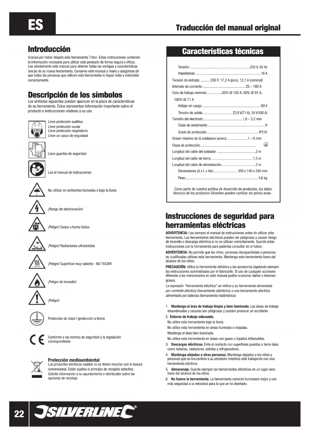 Características técnicas Tensión: ...................................................................230 V, 50 Hz Impedancia: ......................................................................... 16 A Tensión de entrada: .......... 230 V: 17,2 A (pico), 12,1 A (nominal) Intervalo de corriente: ................................................25 – 100 A Ciclo de trabajo nominal:.................50% @ 100 A, 60% @ 91 A, 100% @ 71 A Voltaje sin carga:.................................................................. 60 V Tensión de salida: ................................ 22,8 V(71 A), 24 V(100 A) Tamaño del electrodo: ............................................1,6 – 3,2 mm Clase de aislamiento: ................................................................ H Grado de protección: ..........................................................IP21S Grosor máximo de la soldadura (acero): .......................1 – 6 mm Clase de protección: ............................................................. Longitud del cable del soldador: ...........................................2 m Longitud del cable de tierra: ..............................................1,5 m Longitud del cable de alimentación: ......................................2 m Dimensiones (A x L x An): ........................... 350 x 140 x 240 mm Peso: ................................................................................. 4,6 kg Como parte de nuestra política de desarrollo de productos, los datos técnicos de los productos Silverline pueden cambiar sin previo aviso. Instrucciones de seguridad para herramientas eléctricas ADVERTENCIA: Lea siempre el manual de instrucciones antes de utilizar esta herramienta. Las herramientas eléctricas pueden ser peligrosas y causar riesgo de incendio o descarga eléctrica si no se utilizan correctamente. Guarde estas instrucciones con la herramienta para poderlas consultar en el futuro.ADVERTENCIA: No permita que los niños, personas discapacitadas o personas no cualificadas utilicen esta herramienta. Mantenga esta herramienta fuera del alcance de los niños.PRECAUCIÓN: Utilice la herramienta eléctrica y los accesorios siguiendo siempre las instrucciones suministradas por el fabricante. El uso de cualquier accesorio diferente a los mencionados en este manual podría ocasionar daños o lesiones graves.La expresión “herramienta eléctrica” se refiere a su herramienta alimentada por corriente eléctrica (herramienta alámbrica) o una herramienta eléctrica alimentada por baterías (herramienta inalámbrica).
