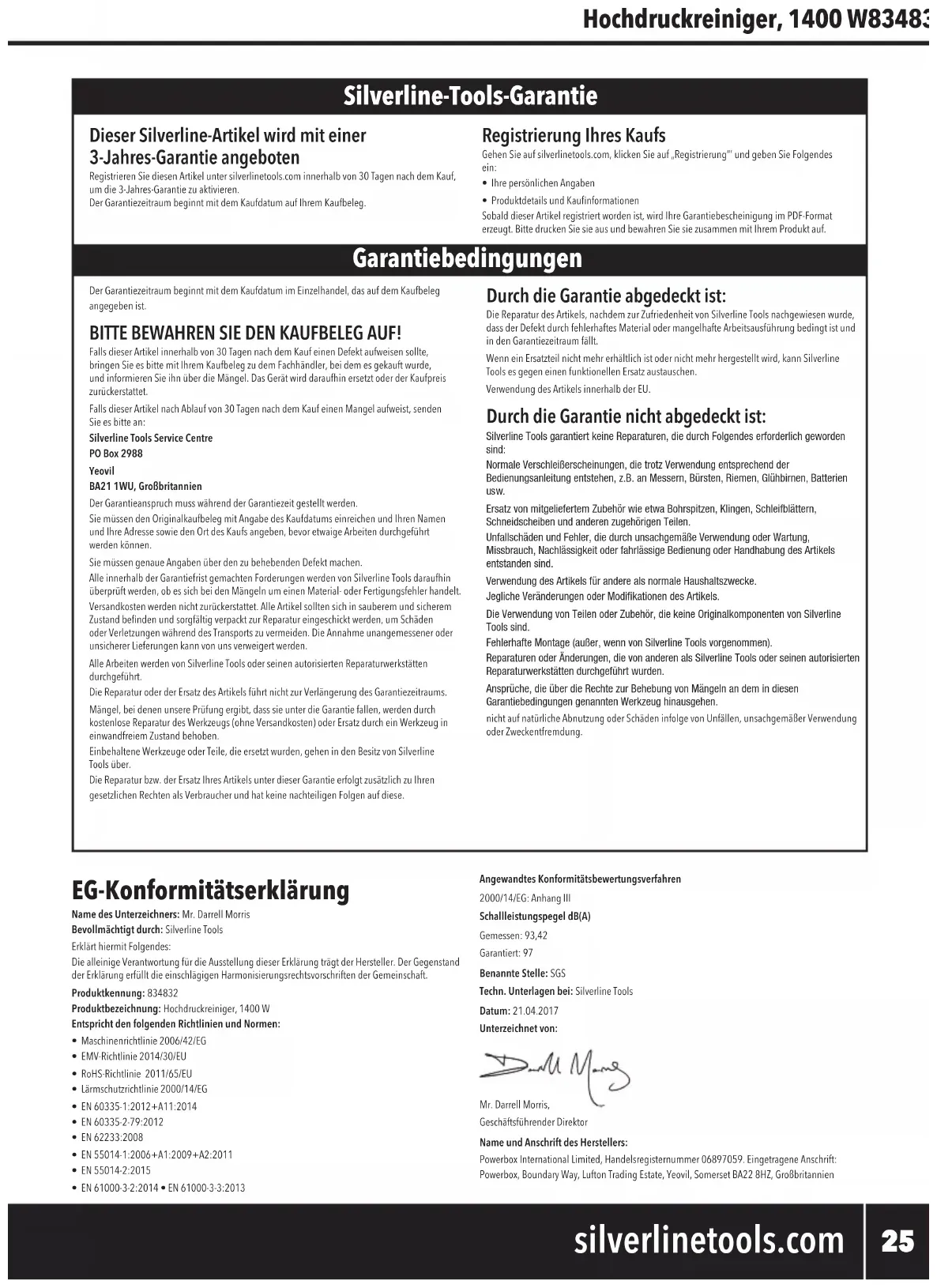 Sielproductosehaaveriadoantesdequetranscurran30díasdesdelafechadecompra,deberádevolverloasulugardecompra,juntoconelrecibodecompraylosdetallesdelaavería.Eneste caso, le sustituiremos el producto o le reembolsaremos el importe.Sielproductosehaaveriadodespuésdequetranscurran30díasdesdelafechadecompra,devuélvaloa:Servicio Técnico Silverline ToolsPO Box 2988YeovilBA21 1WU, Reino Unido.Lareclamaciónsiempredebepresentarseduranteelperiododegarantía.Antesdepoderrealizarcualquiertrabajodereparación,deberáentregarelrecibodecompraoriginalenelqueseindicalafechadecompra,sunombre,direcciónyellugardondeloadquirió.Tambiéndeberáindicarclaramentelosdetallesdelfalloareparar.LasreclamacionespresentadasdentrodelperiododegarantíadeberánservericadasporSilverlineToolsparaaveriguarsilasdecienciassonconsecuenciadelosmaterialesodelamano de obra del producto.Los gastos de transporte no son reembolsables. Los productos enviados deben estar limpios y enbuenascondicionesparasureparación,deberánempaquetarsecuidadosamenteconelndeevitarqueseproduzcandañosduranteeltransporte.SilverlineToolssereservaelderechoarechazarenvíosincorrectosoinseguros.TodaslasreparacionesseránrealizadasporSilverlineToolsoporunserviciotécnicoautorizado.Lareparaciónosustitucióndelproductonoprolongaráelperiododegarantía.Silaaveríaestácubiertaporlagarantía,laherramientaseráreparadasincargoalguno(salvolosgastosdeenvío),obienlasustituiremosporunaherramientaenperfectoestadodefuncionamiento.LasherramientasopiezasquehayansidosustituidasseránpropiedaddeSilverlineTools.Lareparaciónosustitucióndelproductobajogarantíaaportabeneciosadicionalesasusderechos legales como consumidor, sin afectarlos. Qué está cubierto: SilverlineToolsdeberácomprobarsilasdecienciassedebenamaterialesomanodeobradefectuososdentrodelperiododegarantía.Encasodequecualquierpiezanoestuvieradisponibleoestuvierafueradefabricación,SilverlineToolslasustituiráporunapiezafuncionalconlasmismascaracterísticas.Uso del producto en la Unión Europea. Qué no está cubierto: SilverlineToolsnogarantizalasreparacionescausadaspor:Desgaste normal por uso adecuado de la herramienta, por ejemplo hojas, escobillas, correas, bombillas,baterías,etc...Lasustitucióndecualquieraccesoriosuministrado:brocas,hojas,papeldelija,discosdecortey otras piezas relacionadas. Dañoaccidental,averíasdebidasausoocuidadonegligente,usoincorrecto,negligencia,funcionamiento o manejo indebido del producto. Utilizardelproductoparaunanalidaddistinta.Cualquiercambioomodicacióndelproducto.ElusodepiezasyaccesoriosquenoseanrecambiosoriginalesdeSilverlineTools.Instalaciónincorrecta(exceptosifuerealizadaporSilverlineTools).ReparacionesoalteracionesrealizadasporserviciostécnicosnoautorizadosporSilverlineTools.Lasreclamacionesdistintasalasindicadasenlaspresentescondicionesdegarantíanoestaráncubiertas. Declaración de conformidad CE El abajo rmante: Mr Darrell MorrisAutorizado por:SilverlineTools Declaraqueelproducto:La presente declaración de conformidad se expide bajo la exclusiva responsabilidad del Fabricante. El objeto de la declaración descrita anteriormente es conforme a la legislación comunitaria de armonización pertinente.Código de identicación: 834832Descripción: Hidrolimpiadora 1400 WEstá en conformidad con las directivas:• Directivademáquinas2006/42/CE• Compatibilidadelectromagnética2014/30/UE• DirectivaRoHS2011/65/UE• Directivadeemisionessonorasdebidasalasmáquinasdeusoalairelibre2000/14/CE• EN 60335-1:2012+A11:2014• EN 60335-2-79:2012• EN 62233:2008• EN 55014-1:2006+A1:2009+A2:2011• EN 55014-2:2015• EN 61000-3-2:2014• EN 61000-3-3:2013Método de evaluación conforme:2000/14/CE: Anexo IIINivel de potencia acústica dB(A)Medido: 93,42Garantizado: 97Organismo noticado: SGSLa documentación técnica se conserva en: SilverlineToolsFecha: 21/04/17Firma:Mr Darrell MorrisDirector GeneralNombre y dirección del fabricante: Powerbox International Limited, Nº de registro: 06897059. Dirección legal: Powerbox,BoundaryWay,LuftonTradingEstate,Yeovil,SomersetBA228HZ,ReinoUnido. 834832_Manual.indd 31 31/05/2017 10:35IT