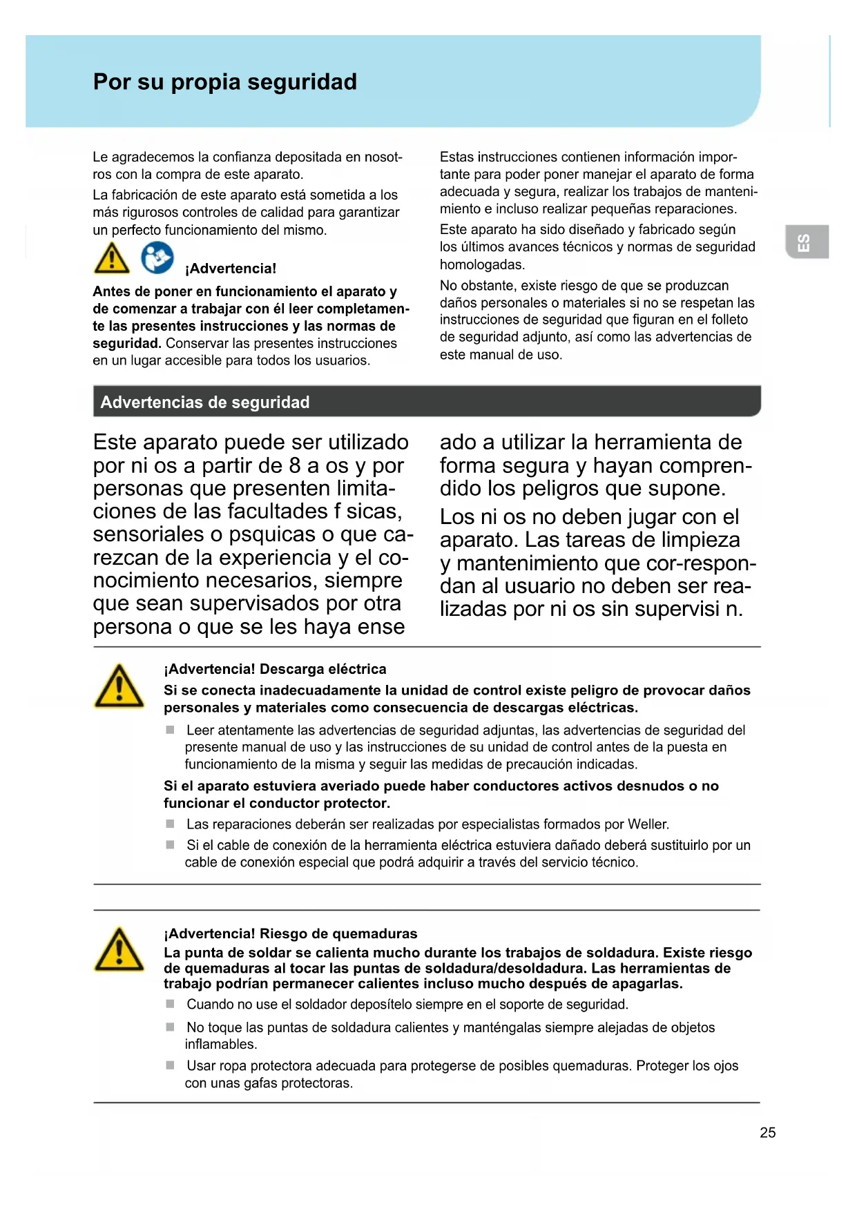 Por su propia seguridad Leagradecemoslaconanzadepositadaennosot- ros con la compra de este aparato. Lafabricacióndeesteaparatoestásometidaalos másrigurososcontrolesdecalidadparagarantizar un perfecto funcionamiento del mismo. ¡Advertencia! Antes de poner en funcionamiento el aparato y de comenzar a trabajar con él leer completamen- te las presentes instrucciones y las normas de seguridad. Conservar las presentes instrucciones en un lugar accesible para todos los usuarios. Estas instrucciones contienen información impor- tante para poder poner manejar el aparato de forma adecuadaysegura,realizarlostrabajosdemanteni- miento e incluso realizar pequeñas reparaciones. Esteaparatohasidodiseñadoyfabricadosegún losúltimosavancestécnicosynormasdeseguridad homologadas. No obstante, existe riesgo de que se produzcan daños personales o materiales si no se respetan las instruccionesdeseguridadqueguranenelfolleto deseguridadadjunto,asícomolasadvertenciasde este manual de uso. Advertencias de seguridad Este aparato puede ser utilizado porniosapartirde8aosypor personas que presenten limita- ciones de las facultades f sicas, sensoriales o psquicas o que ca- rezcandelaexperienciayelco- nocimiento necesarios, siempre que sean supervisados por otra personaoqueseleshayaense ado a utilizar la herramienta de formasegurayhayancompren- dido los peligros que supone. Los ni os no deben jugar con el aparato. Las tareas de limpieza ymantenimientoquecor-respon- dan al usuario no deben ser rea- lizadas por ni os sin supervisi n. ¡Advertencia! Descarga eléctrica Si se conecta inadecuadamente la unidad de control existe peligro de provocar daños personales y materiales como consecuencia de descargas eléctricas. Leer atentamente las advertencias de seguridad adjuntas, las advertencias de seguridad del presentemanualdeusoylasinstruccionesdesuunidaddecontrolantesdelapuestaen funcionamientodelamismayseguirlasmedidasdeprecauciónindicadas. Si el aparato estuviera averiado puede haber conductores activos desnudos o no funcionar el conductor protector. LasreparacionesdeberánserrealizadasporespecialistasformadosporWeller. Sielcabledeconexióndelaherramientaeléctricaestuvieradañadodeberásustituirloporun cabledeconexiónespecialquepodráadquiriratravésdelserviciotécnico. ¡Advertencia! Riesgo de quemaduras La punta de soldar se calienta mucho durante los trabajos de soldadura. Existe riesgo de quemaduras al tocar las puntas de soldadura/desoldadura. Las herramientas de trabajo podrían permanecer calientes incluso mucho después de apagarlas. Cuandonouseelsoldadordeposítelosiempreenelsoportedeseguridad. Notoquelaspuntasdesoldaduracalientesymanténgalassiemprealejadasdeobjetos inamables. Usar ropa protectora adecuada para protegerse de posibles quemaduras. Proteger los ojos con unas gafas protectoras.26