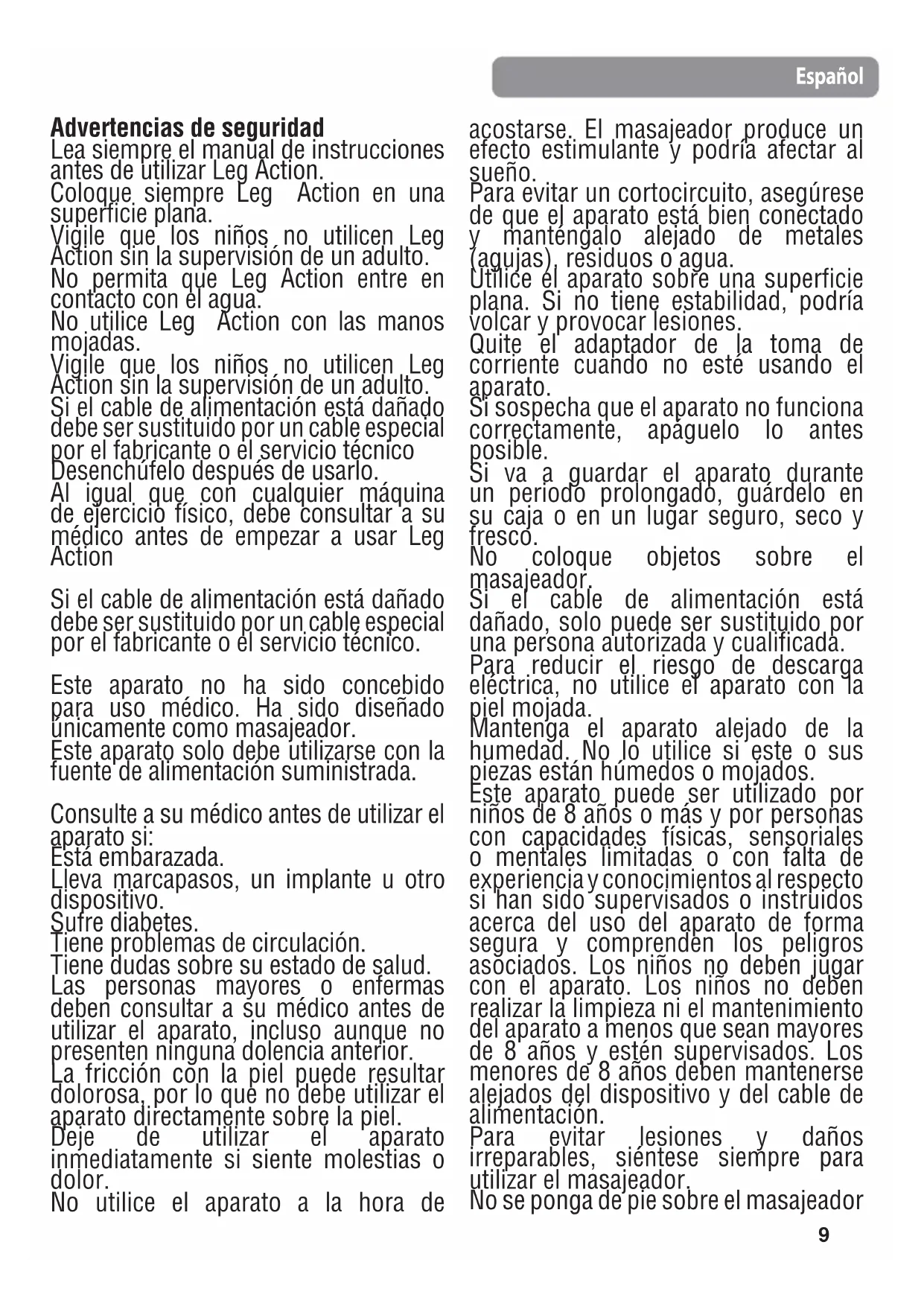 A symbol of a crossed-out wheeled bin means you should nd out about and follow local regulations about disposing of this kind of products. Do not dispose of this product as you would other household waste. Dispose of this device in accordance with the corresponding local regulations. Electrical and electronic devices contain hazardous substances that can have harmful effects on the environment and/or human health and should be recycled properly. Made in China.9 Advertencias de seguridad Lea siempre el manual de instrucciones antes de utilizar Leg Action. Coloque siempre Leg Action en una superficie plana. Vigile que los niños no utilicen Leg Action sin la supervisión de un adulto. No permita que Leg Action entre en contacto con el agua. No utilice Leg Action con las manos mojadas. Vigile que los niños no utilicen Leg Action sin la supervisión de un adulto. Si el cable de alimentación está dañado debe ser sustituido por un cable especial por el fabricante o el servicio técnico Desenchúfelo después de usarlo. Al igual que con cualquier máquina de ejercicio físico, debe consultar a su médico antes de empezar a usar Leg Action Si el cable de alimentación está dañado debe ser sustituido por un cable especial por el fabricante o el servicio técnico. Este aparato no ha sido concebido para uso médico. Ha sido diseñado únicamente como masajeador. Este aparato solo debe utilizarse con la fuente de alimentación suministrada. Consulte a su médico antes de utilizar el aparato si: Está embarazada. Lleva marcapasos, un implante u otro dispositivo. Sufre diabetes. Tiene problemas de circulación. Tiene dudas sobre su estado de salud. Las personas mayores o enfermas deben consultar a su médico antes de utilizar el aparato, incluso aunque no presenten ninguna dolencia anterior. La fricción con la piel puede resultar dolorosa, por lo que no debe utilizar el aparato directamente sobre la piel. Deje de utilizar el aparato inmediatamente si siente molestias o dolor. No utilice el aparato a la hora de acostarse. El masajeador produce un efecto estimulante y podría afectar al sueño. Para evitar un cortocircuito, asegúrese de que el aparato está bien conectado y manténgalo alejado de metales (agujas), residuos o agua. Utilice el aparato sobre una superficie plana. Si no tiene estabilidad, podría volcar y provocar lesiones. Quite el adaptador de la toma de corriente cuando no esté usando el aparato. Si sospecha que el aparato no funciona correctamente, apáguelo lo antes posible. Si va a guardar el aparato durante un periodo prolongado, guárdelo en su caja o en un lugar seguro, seco y fresco. No coloque objetos sobre el masajeador. Si el cable de alimentación está dañado, solo puede ser sustituido por una persona autorizada y cualificada. Para reducir el riesgo de descarga eléctrica, no utilice el aparato con la piel mojada. Mantenga el aparato alejado de la humedad. No lo utilice si este o sus piezas están húmedos o mojados. Este aparato puede ser utilizado por niños de 8 años o más y por personas con capacidades físicas, sensoriales o mentales limitadas o con falta de experiencia y conocimientos al respecto si han sido supervisados o instruidos acerca del uso del aparato de forma segura y comprenden los peligros asociados. Los niños no deben jugar con el aparato. Los niños no deben realizar la limpieza ni el mantenimiento del aparato a menos que sean mayores de 8 años y estén supervisados. Los menores de 8 años deben mantenerse alejados del dispositivo y del cable de alimentación. Para evitar lesiones y daños irreparables, siéntese siempre para utilizar el masajeador. No se ponga de pie sobre el masajeador Español10 ni lo fuerce para evitar lesiones. No intente desmontar ni reparar el aparato. Las reparaciones solo pueden ser realizadas por técnicos debidamente cualificados. Descripción producto: