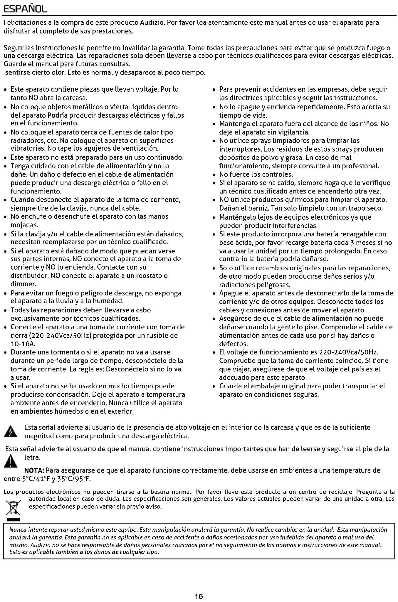 Wenn Sie die Taste EQ auf der Fernbedienung drücken, wird die aktuelle Moduseinstellung angezeigt. Um zu einem anderen Modus zu wechseln, drücken Sie wiederholt die Taste EQ MODE, bis der gewünschte Klangmodus erscheint ("CLASSIC, POPS, JAZZ, ROCK").16 Felicitaciones a la compra de este producto Audizio. Por favor lea atentamente este manual antes de usar el aparato para disfrutar al completo de sus prestaciones. Seguir las instrucciones le permite no invalidar la garantía. Tome todas las precauciones para evitar que se produzca fuego o una descarga eléctrica. Las reparaciones solo deben llevarse a cabo por técnicos cualificados para evitar descargas eléctricas. Guarde el manual para futuras consultas. sentirse cierto olor. Esto es normal y desaparece al poco tiempo.
