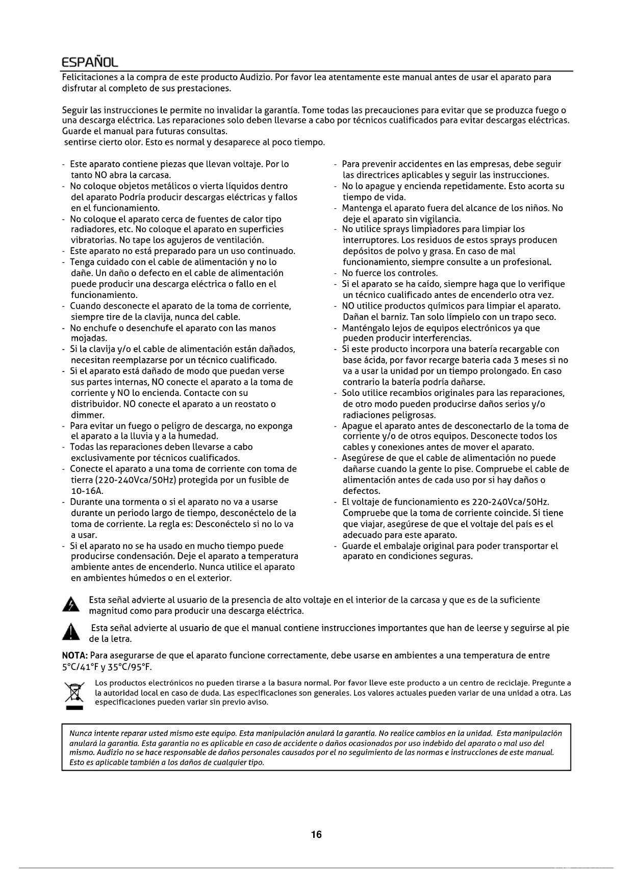 120, 90, 60, 45, 30, 20, 10" in Schritten mit jedem Drücken. Der Wert des Sleep-Timers blinkt auf dem Display. 2. Lassen Sie die Taste los, wenn die gewünschte Schlafzeit auf dem Display erscheint. Der Sleep-Timer ist nun aktiviert. Auf dem Display wird "10" angezeigt, was die "10 Minuten" Schlafzeit anzeigt usw. Wenn die Ruhezeit Null erreicht, schaltet sich das Gerät aus. Um die Schlaffunktion abzubrechen, drücken Sie erneut [SLEEP]. Die Schlaffunktion wird abgebrochen.16 Felicitaciones a la compra de este producto Audizio. Por favor lea atentamente este manual antes de usar el aparato para disfrutar al completo de sus prestaciones. Seguir las instrucciones le permite no invalidar la garantía. Tome todas las precauciones para evitar que se produzca fuego o una descarga eléctrica. Las reparaciones solo deben llevarse a cabo por técnicos cualificados para evitar descargas eléctricas. Guarde el manual para futuras consultas. sentirse cierto olor. Esto es normal y desaparece al poco tiempo. - Este aparato contiene piezas que llevan voltaje. Por lo tanto NO abra la carcasa. - No coloque objetos metálicos o vierta líquidos dentro del aparato Podría producir descargas eléctricas y fallos en el funcionamiento. - No coloque el aparato cerca de fuentes de calor tipo radiadores, etc. No coloque el aparato en superficies vibratorias. No tape los agujeros de ventilación. - Este aparato no está preparado para un uso continuado. - Tenga cuidado con el cable de alimentación y no lo dañe. Un daño o defecto en el cable de alimentación puede producir una descarga eléctrica o fallo en el funcionamiento. - Cuando desconecte el aparato de la toma de corriente, siempre tire de la clavija, nunca del cable. - No enchufe o desenchufe el aparato con las manos mojadas. - Si la clavija y/o el cable de alimentación están dañados, necesitan reemplazarse por un técnico cualificado. - Si el aparato está dañado de modo que puedan verse sus partes internas, NO conecte el aparato a la toma de corriente y NO lo encienda. Contacte con su distribuidor. NO conecte el aparato a un reostato o dimmer. - Para evitar un fuego o peligro de descarga, no exponga el aparato a la lluvia y a la humedad. - Todas las reparaciones deben llevarse a cabo exclusivamente por técnicos cualificados. - Conecte el aparato a una toma de corriente con toma de tierra (220-240Vca/50Hz) protegida por un fusible de 10-16A. - Durante una tormenta o si el aparato no va a usarse durante un periodo largo de tiempo, desconéctelo de la toma de corriente. La regla es: Desconéctelo si no lo va a usar. - Si el aparato no se ha usado en mucho tiempo puede producirse condensación. Deje el aparato a temperatura ambiente antes de encenderlo. Nunca utilice el aparato en ambientes húmedos o en el exterior. - Para prevenir accidentes en las empresas, debe seguir las directrices aplicables y seguir las instrucciones. - No lo apague y encienda repetidamente. Esto acorta su tiempo de vida. - Mantenga el aparato fuera del alcance de los niños. No deje el aparato sin vigilancia. - No utilice sprays limpiadores para limpiar los interruptores. Los residuos de estos sprays producen depósitos de polvo y grasa. En caso de mal funcionamiento, siempre consulte a un profesional. - No fuerce los controles. - Si el aparato se ha caído, siempre haga que lo verifique un técnico cualificado antes de encenderlo otra vez. - NO utilice productos químicos para limpiar el aparato. Dañan el barniz. Tan solo límpielo con un trapo seco. - Manténgalo lejos de equipos electrónicos ya que pueden producir interferencias. - Si este producto incorpora una batería recargable con base ácida, por favor recarge bateria cada 3 meses si no va a usar la unidad por un tiempo prolongado. En caso contrario la batería podría dañarse. - Solo utilice recambios originales para las reparaciones, de otro modo pueden producirse daños serios y/o radiaciones peligrosas. - Apague el aparato antes de desconectarlo de la toma de corriente y/o de otros equipos. Desconecte todos los cables y conexiones antes de mover el aparato. - Asegúrese de que el cable de alimentación no puede dañarse cuando la gente lo pise. Compruebe el cable de alimentación antes de cada uso por si hay daños o defectos. - El voltaje de funcionamiento es 220-240Vca/50Hz. Compruebe que la toma de corriente coincide. Si tiene que viajar, asegúrese de que el voltaje del país es el adecuado para este aparato. - Guarde el embalaje original para poder transportar el aparato en condiciones seguras. Esta señal advierte al usuario de la presencia de alto voltaje en el interior de la carcasa y que es de la suficiente magnitud como para producir una descarga eléctrica. Esta señal advierte al usuario de que el manual contiene instrucciones importantes que han de leerse y seguirse al pie de la letra. NOTA: Para asegurarse de que el aparato funcione correctamente, debe usarse en ambientes a una temperatura de entre 5°C/41°F y 35°C/95°F. Los productos electrónicos no pueden tirarse a la basura normal. Por favor lleve este producto a un centro de reciclaje. Pregunte a la autoridad local en caso de duda. Las especificaciones son generales. Los valores actuales pueden variar de una unidad a otra. Las especificaciones pueden variar sin previo aviso.