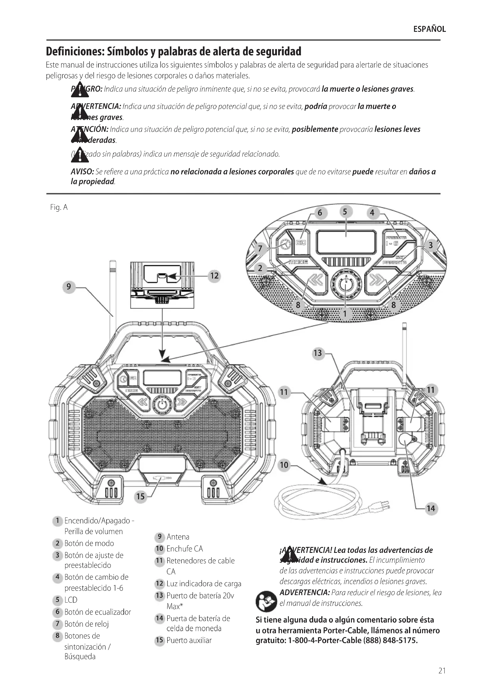 ADVERTENCIA: Nunca modifique el cargador, radio o ninguna parte de éste. Podría resultar en daño o lesiones personales. Consulte la Fig. A al inicio de este manual respecto a una lista completa de componentes. USO PRETENDIDO Este cargador / radio está diseñado para transmitir la recepción de radio, reproducir/transmitir audio a través de una conexión alámbrica a un teléfono celular u otro dispositivo de audio, y para cargar baterías PORTER-CABLE. nO use bajo condiciones húmedas o en presencia de líquidos o gases inflamables. nO permita que niños estén en contacto con la herramienta. Se requiere supervisión cuando operadores sin experiencia operen esta herramienta. OPERACIÓN Para instalar la batería de celda de moneda (Fig. B) Su radio está equipado con capacidad de memoria para guardar la hora preestablecida. Cuando el radio esté en la posición OFF, esta capacidad de memoria es energizada por una batería de celda de moneda que se incluye con el radio. nOTA: Para el primer uso, retire la lengüeta de protección debajo de la puerta de la batería para activar la batería de celda de moneda.
