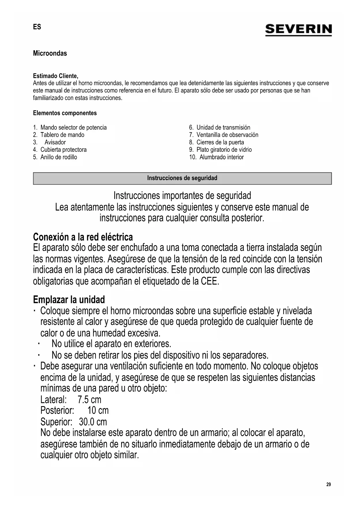 Instrucciones de seguridad Instrucciones importantes de seguridad Lea atentamente las instrucciones siguientes y conserve este manual de instrucciones para cualquier consulta posterior. Conexión a la red eléctrica El aparato sólo debe ser enchufado a una toma conectada a tierra instalada según las normas vigentes. Asegúrese de que la tensión de la red coincide con la tensión indicada en la placa de características. Este producto cumple con las directivas obligatorias que acompañan el etiquetado de la CEE. Emplazar la unidad ∙ Coloque siempre el horno microondas sobre una supercie estable y nivelada resistente al calor y asegúrese de que queda protegido de cualquier fuente de calor o de una humedad excesiva. ∙ No utilice el aparato en exteriores. ∙ No se deben retirar los pies del dispositivo ni los separadores. ∙ Debe asegurar una ventilación suciente en todo momento. No coloque objetos encima de la unidad, y asegúrese de que se respeten las siguientes distancias mínimas de una pared u otro objeto: Lateral: 7.5 cm Posterior: 10 cm Superior: 30.0 cm No debe instalarse este aparato dentro de un armario; al colocar el aparato, asegúrese también de no situarlo inmediatamente debajo de un armario o de cualquier otro objeto similar.30 142 x 208 mm Notas importantes ∙ Cuidado: Cierto tipo de alimentos puede tener una tendencia a prender fuego. No deje el aparato sin vigilar durante su funcionamiento. ∙ Este microondas sólo está diseñado para descongelar, recalentar y cocer comida. Precaución: Si intenta secar alimentos o comida, calentar una bolsa térmica, unas zapatillas, una esponja, un paño de cocina mojado, etc. podría sufrir lesiones por combustión o incendio. ∙ No se acepta responsabilidad alguna si hay averías a consecuencia del uso incorrecto del aparato o si estas instrucciones no han sido observadas debidamente. ∙ Solo debe utilizarse vajilla adecuada para microondas. Los recipientes metálicos no son aptos para calentar alimentos ni bebidas en modo microondas. Puede consultar información más detallada en la sección ‚Emplee siempre utensilios de cocina apropiados‘. ∙ El aparato no debe ser utilizado con un temporizador externo ni un sistema de mando a distancia. ∙ Este aparato podrá ser utilizado por niños (mayores de 8 años) y personas con reducidas facultades físicas, sensoriales o mentales, o sin experiencia ni conocimiento del producto, siempre que hayan recibido la supervisión o instrucciones referentes al uso del aparato y entiendan por completo el peligro y las precauciones de seguridad. ∙ Los niños no deben jugar con el aparato. ∙ No se debe permitir que los niños realicen ningún trabajo de limpieza o mantenimiento del aparato a menos que estén bajo vigilancia. ∙ El aparato y su cable eléctrico siempre se deben mantener fuera del alcance de niños menores de 8 años. ∙ Para evitar riesgo de electrocución, no limpie la unidad con agua ni la sumerja. ∙ El aparato no debe limpiarse con un limpiador a vapor. ∙ Apague y desenchufe siempre el aparato: - antes de la limpieza, - en caso de avería. - después de cada utilización. ∙ Cuando se desenchufa la clavija de la pared, nunca tirar del cable de alimentación. No toque el enchufe con las manos mojadas.
