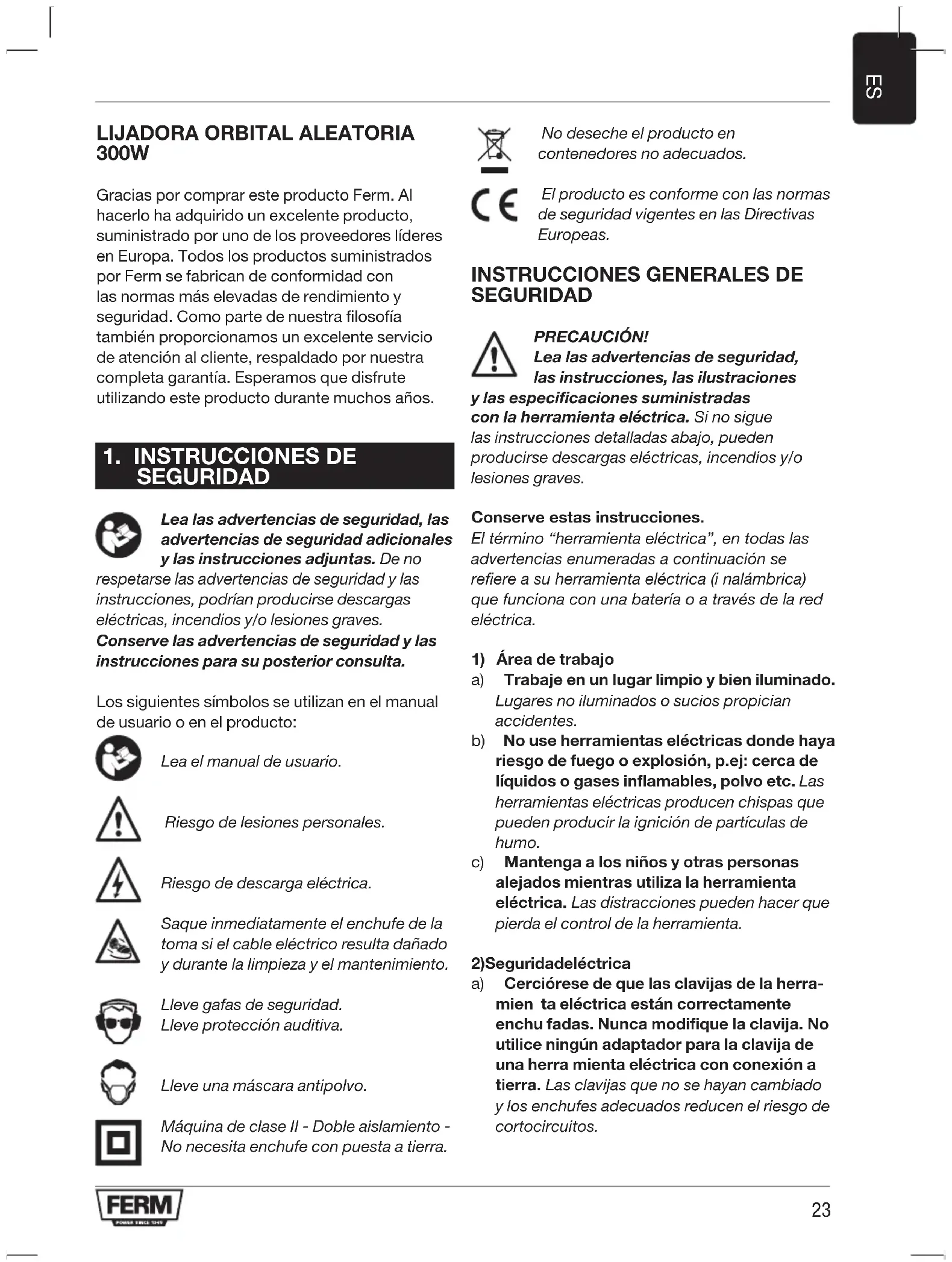 SEGURIDAD Lea las advertencias de seguridad, las advertencias de seguridad adicionales y las instrucciones adjuntas. De no respetarse las advertencias de seguridad y las instrucciones, podrían producirse descargas eléctricas, incendios y/o lesiones graves. Conserve las advertencias de seguridad y las instrucciones para su posterior consulta. Los siguientes símbolos se utilizan en el manual de usuario o en el producto: Lea el manual de usuario. Riesgo de lesiones personales. Riesgo de descarga eléctrica. Saque inmediatamente el enchufe de la toma si el cable eléctrico resulta dañado y durante la limpieza y el mantenimiento. Lleve gafas de seguridad. Lleve protección auditiva. Lleve una máscara antipolvo. Máquina de clase II - Doble aislamiento - No necesita enchufe con puesta a tierra. No deseche el producto en contenedores no adecuados. El producto es conforme con las normas de seguridad vigentes en las Directivas Europeas.