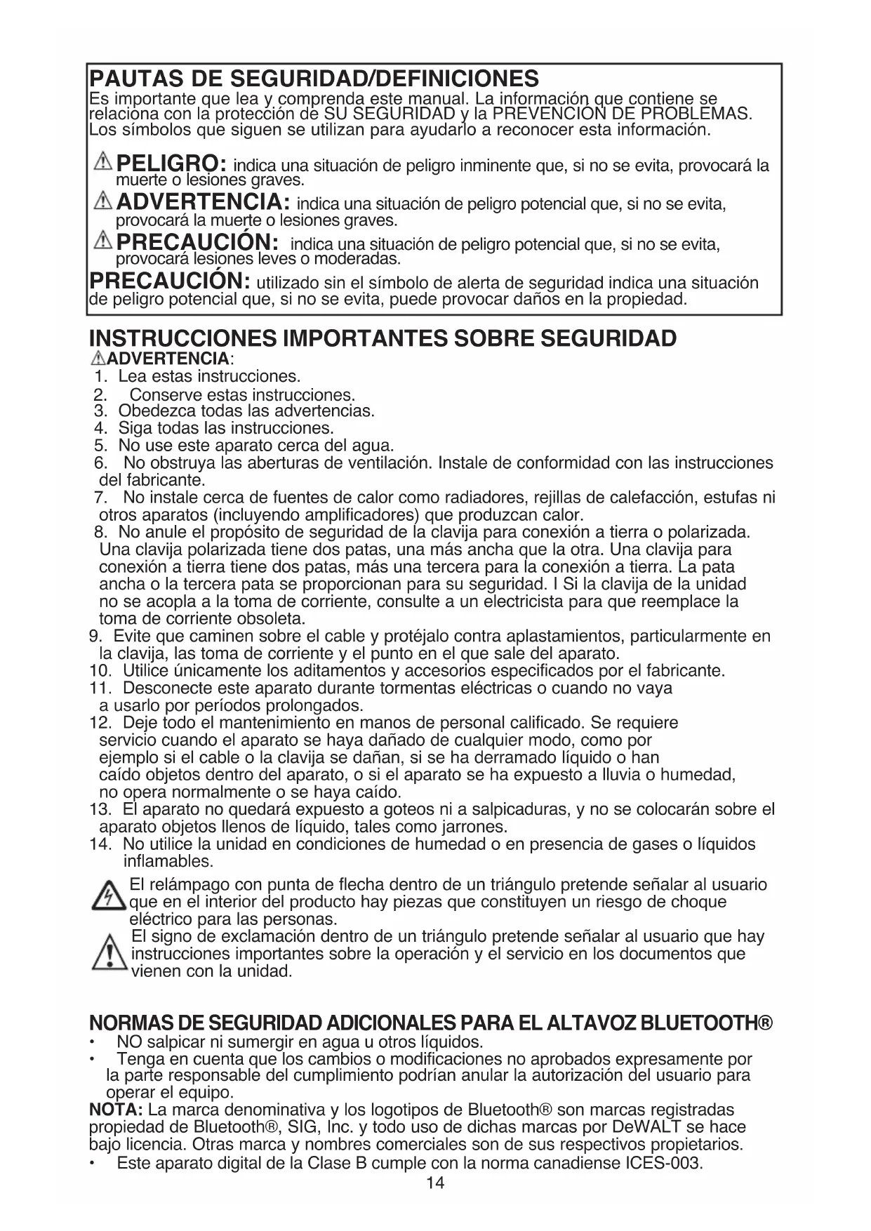 - Tengaencuentaqueloscambiosomodificacionesnoaprobadosexpresamentepor la parte responsable del cumplimiento podrían anular la autorización del usuario para operar el equipo. NOTA: La marca denominativa y los logotipos de Bluetooth® son marcas registradas propiedad de Bluetooth®, SIG, Inc. y todo uso de dichas marcas por DeWALT se hace bajo licencia. Otras marca y nombres comerciales son de sus respectivos propietarios.