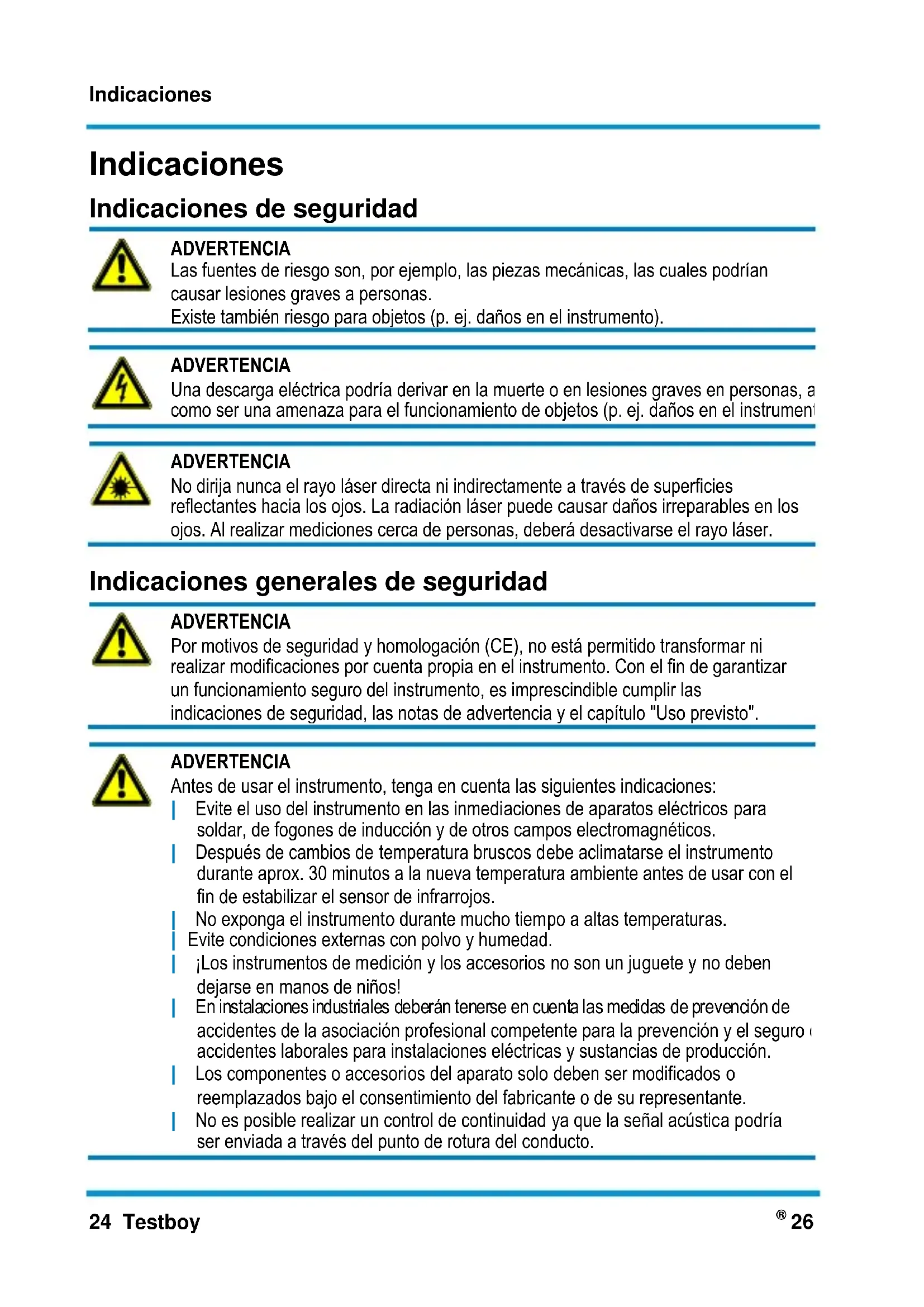 ADVERTENCIA Antes de usar el instrumento, tenga en cuenta las siguientes indicaciones: | Evite el uso del instrumento en las inmediaciones de aparatos eléctricos para soldar, de fogones de inducción y de otros campos electromagnéticos. | Después de cambios de temperatura bruscos debe aclimatarse el instrumento durante aprox. 30 minutos a la nueva temperatura ambiente antes de usar con el fin de estabilizar el sensor de infrarrojos. | No exponga el instrumento durante mucho tiempo a altas temperaturas. | Evite condiciones externas con polvo y humedad. | ¡Los instrumentos de medición y los accesorios no son un juguete y no deben dejarse en manos de niños! | En instalaciones industriales deberán tenerse en cuenta las medidas de prevención de accidentes de la asociación profesional competente para la prevención y el seguro de accidentes laborales para instalaciones eléctricas y sustancias de producción. | Los componentes o accesorios del aparato solo deben ser modificados o reemplazados bajo el consentimiento del fabricante o de su representante. | No es posible realizar un control de continuidad ya que la señal acústica podría ser enviada a través del punto de rotura del conducto.Indicaciones Testboy