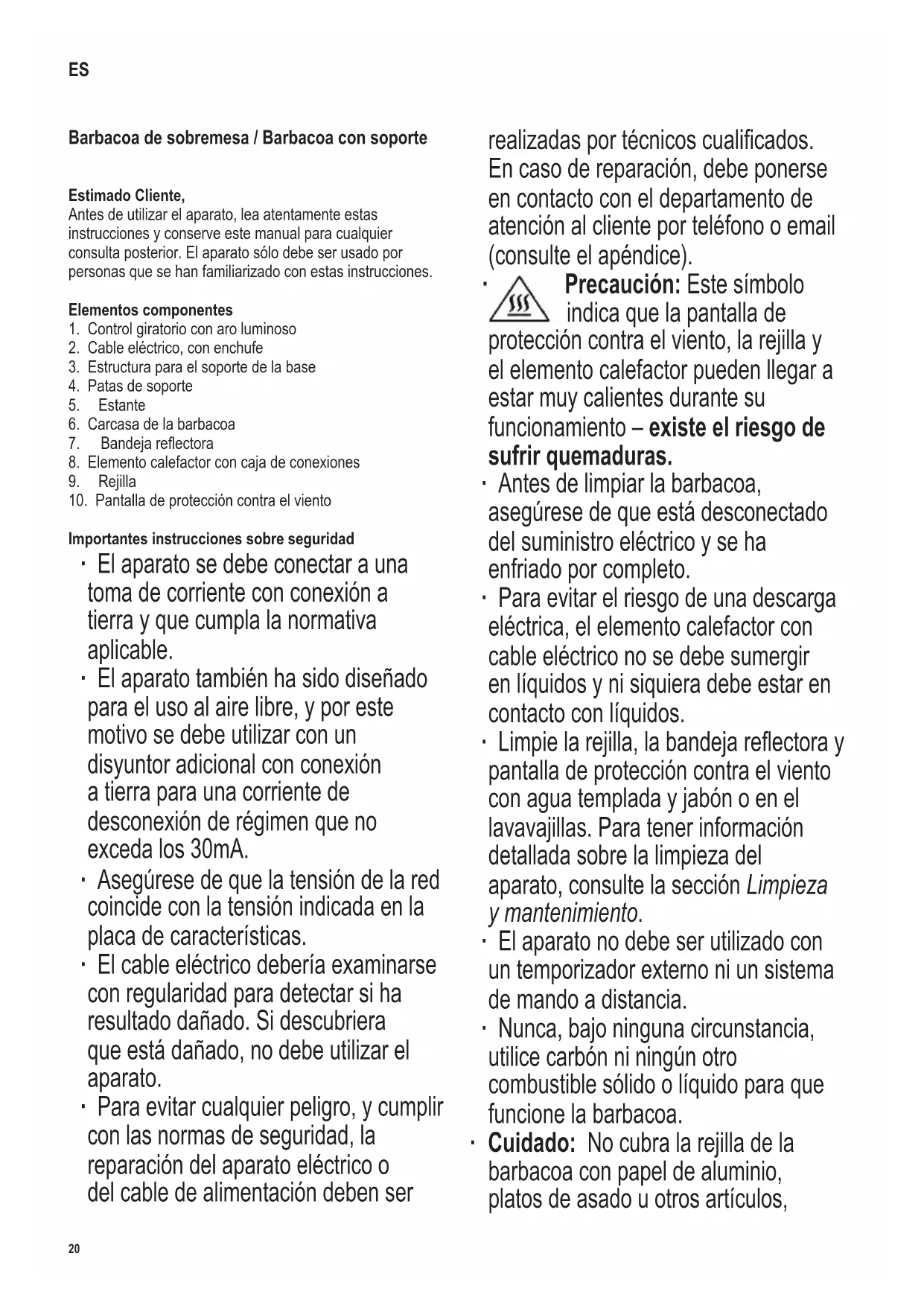 Precaución: Este símbolo indica que la pantalla de protección contra el viento, la rejilla y el elemento calefactor pueden llegar a estar muy calientes durante su funcionamiento – existe el riesgo de sufrir quemaduras. ∙ Antes de limpiar la barbacoa, asegúrese de que está desconectado del suministro eléctrico y se ha enfriado por completo. ∙ Para evitar el riesgo de una descarga eléctrica, el elemento calefactor con cable eléctrico no se debe sumergir en líquidos y ni siquiera debe estar en contacto con líquidos. ∙ Limpielarejilla,labandejareectoray pantalla de protección contra el viento con agua templada y jabón o en el lavavajillas. Para tener información detallada sobre la limpieza del aparato, consulte la sección Limpieza y mantenimiento. ∙ El aparato no debe ser utilizado con un temporizador externo ni un sistema de mando a distancia. ∙ Nunca, bajo ninguna circunstancia, utilice carbón ni ningún otro combustible sólido o líquido para que funcione la barbacoa. ∙ Cuidado: No cubra la rejilla de la barbacoa con papel de aluminio, platos de asado u otros artículos, ES21 142 x 208 mm porque la acumulación de calor resultante podría dañar gravemente la barbacoa. ∙ Se puede añadir hasta un máximo de 900 ml de agua en la bandeja reectora. ∙ Este aparato ha sido diseñado para el uso doméstico u otra aplicación similar, por ejemplo - encocinasdepersonal,enocinasy otros puntos comerciales, - en empresas agrícolas, - por los clientes de hoteles, pensiones, etc. y alojamientos similares, - en casas rurales. ∙ Este aparato podrá ser utilizado por niños (mayores de 8 años) y personas con reducidas facultades físicas, sensoriales o mentales, o sin experiencia ni conocimiento del producto, siempre que hayan recibido la supervisión o instrucciones referentes al uso del aparato y entiendan por completo el peligro y las precauciones de seguridad. ∙ Los niños no deben jugar con el aparato. ∙ No se debe permitir que los niños realicen ningún trabajo de limpieza o mantenimiento del aparato a menos que esté bajo vigilancia y tengan más de 8 años. ∙ El aparato y su cable eléctrico siempre se deben mantener fuera del alcance de niños menores de 8 años. ∙ Precaución: Mantenga a los niños alejados del material de embalaje, porque podría ser peligroso, existeelpeligrodeasxia. ∙ Antes de utilizar el aparato, se debe comprobar que tanto la unidad principal como cualquier accesorio no están defectuosos. En caso de que el aparato caiga sobreunasuperciedura,porejemplo,nosedebe utilizar de nuevo: incluso los desperfectos no visibles pueden tener efectos adversos sobre la seguridad en el uso del aparato. ∙ Durante el funcionamiento, la barbacoa debe ser colocadasobreunasupercietermorresistente, insensible a salpicaduras y manchas. Cuando se cocinan alimentos con un contenido alto de grasa o humedad, no se puede siempre evitar las salpicaduras. ∙ No coloque la barbacoa junto a una pared ni esquina, y compruebequenoseguardaningúnmaterialinamable junto a la barbacoa. ∙ Recuerde que los alimentos con alto contenido de grasa o humedad tienen tendencia a prenderse fuego; por este motivo siempre debe llenar la bandeja reectora con agua, antes de su utilización. No conecte la barbacoa al suministro eléctrico hasta haber llenado la bandeja con agua. El agua ayuda a enfriar la bandeja reectora,reducelacantidadde humo producido, y también facilita la limpieza. Asegúrese de controlar el nivel del agua. El agua debe añadirse con antelación, asegurándose de que no entra en contacto con el elemento calefactor. Precaución: Antes de añadir agua, desconecte la barbacoa de la toma de corriente. ∙ Antes de utilizar la barbacoa, asegúrese siempre de que el elemento calefactor está correctamente instalado en la bandeja reectora y la carcasa. ∙ La barbacoa debe estar bajo supervisión en todo momento durante su funcionamiento. ∙ Recuerde que el elemento calefactor y la rejilla pueden llegar a estar muy calientes durante el funcionamiento. Incluso después de apagar el elemento calefactor, no se debe tocar hasta que se haya enfriado sucientemente–en caso contrario podría sufrir graves quemaduras. ∙ No deje que el cable de alimentación entre en contacto con ninguna parte del aparato que esté caliente. ∙ Desenchufe siempre el aparato de la toma de la pared - antes de llenar de agua la bandeja reectora, - después de usarlo; - en caso de alguna avería; - antes de limpiar el aparato. ∙ El uso de un cable alargador extendido o en bobina produce una pérdida de potencia en el suministro, junto con el posterior calentamiento del cable. Por ello, es necesario desenrollar el cable por completo antes de usarlo. Asegúrese de que el cable es adecuado para su uso al aire libre y para la potencia indicada (consultar la placa de características).22 142 x 208 mm ∙ Precaución: No mueva la barbacoa mientras está funcionando. Antes de trasladar, transportar, limpiar o guardar la barbacoa, asegúrese de que se haya enfriadosucientemente.Vacíeelaguarestante después de su utilización. ∙ Asegúrese de que la barbacoa no se guarda en el exterior, ni en otro lugar donde esté expuesto a temperaturas extremas o elevada humedad. ∙ No se acepta la responsabilidad si hay averías a consecuencia del uso incorrecto del aparato o si estas instrucciones no han sido observadas debidamente. ∙ Este producto cumple con las directivas obligatorias que acompañan el etiquetado de la CEE. Antes de su utilización por vez primera ∙ Retire todos los materiales de embalaje y adhesivos del aparato. ∙ Limpielarejilladelabarbacoa,labandejareectora y la pantalla de protección contra el viento con agua templada y jabón; después seque estas piezas por completo con un paño. ∙ Monte el aparato siguiendo las indicaciones del apartado Preparación del aparato. ∙ Espere a que la barbacoa se caliente durante aproximadamente 10 minutos a potencia máxima sin 