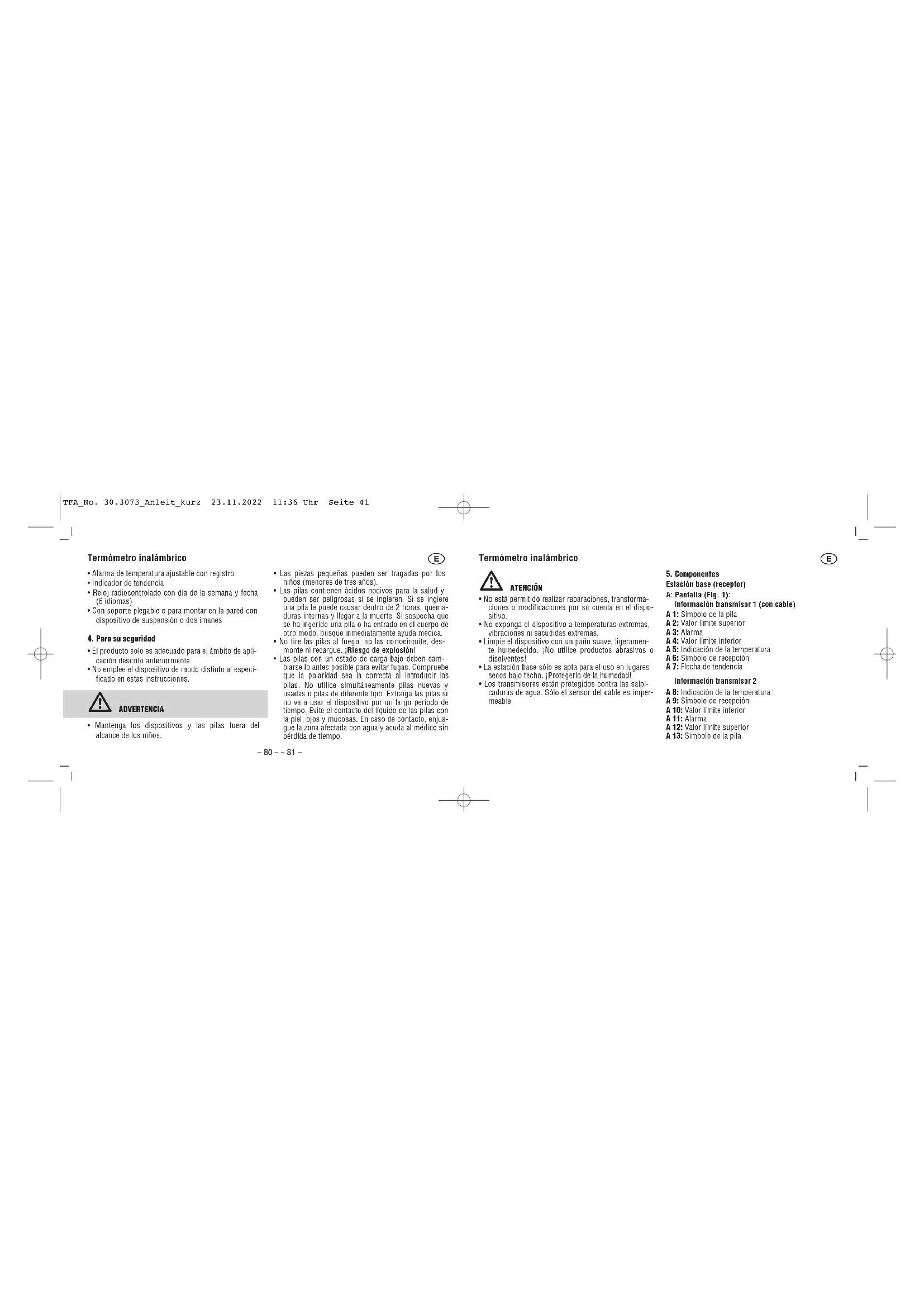 - Atención: Al cambiar las pilas, debe volver a establecerse el contacto entre el transmisor y el receptor; por esta razón, deben introducirse pilas nuevas en todos los dispositivos o iniciar la búsqueda manual de trans- misores. TFA_No. 30.3073_Anleit_kurz 23.11.2022 11:36 Uhr Seite 45– 90 – – 91 – Termómetro inalámbrico