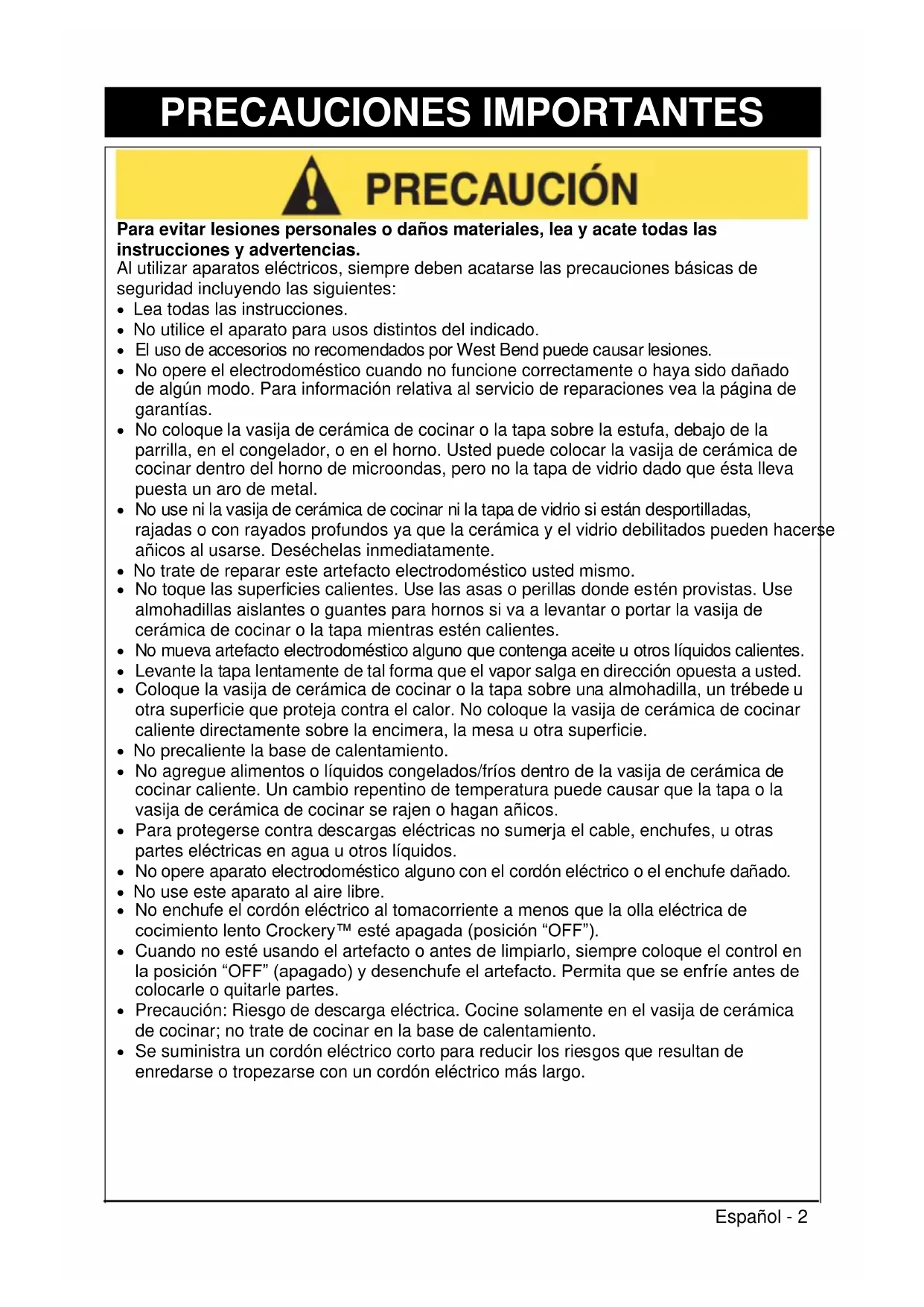 (“la Compañía”) garantiza que este aparato no presentará fallas de material ni fabricación durante un (1) año a partir de la fecha original de compra con prueba de dicha compra, siempre y cuando el aparato sea operado y mantenido tal como se indica en el Manual de Instrucciones. Toda pieza del aparato que presente fallas será reparada o reemplazada sin costo alguno a criterio de la Compañía. Esta garantía rige solamente para el uso domestico dentro de la casa. Esta garantía no cubre ningún daño, incluyendo la decoloración, de superficie antiadherente alguna del aparato electrodoméstico. Esta garantía es nula y sin efecto, a juicio exclusivo de la Compañía, si el aparato ha sido dañado por accidente, mal uso, abuso, negligencia, arañazos, o si el aparato ha sido alterado de alguna manera. ESTA GARANTÍA REEMPLAZA A TODAS LAS DEMÁS GARANTÍAS IMPLÍCITAS, INCLUYENDO AQUÉLLAS DE COMERCIABILIDAD, IDONEIDAD PARA UN FIN O USO EN PARTICULAR, DESEMPEÑO, U OTROS TIPOS, LAS CUALES QUEDAN EXCLUIDAS MEDIANTE EL PRESENTE DOCUMENTO. BAJO NINGUNA CIRCUNSTANCIA ASUMIRÁ LA COMPAÑÍA RESPONSABILIDAD POR DAÑOS, YA SEAN DIRECTOS, INMEDIATOS, INCIDENTALES, PREVISIBLES, CONSECUENTES O ESPECIALES QUE SURJAN DEL USO DEL APARATO ELECTRODOMÉSTICO O GUARDEN RELACIÓN CON EL MISMO. Si usted piensa que el aparato se ha dañado o requiere servicio dentro del período de garantía, por favor póngase en contacto con el Departamento de Atención al Cliente al (866) 290-1851, o envíenos un correo electrónico a customercare@westbend.com. Un recibo que acredite la fecha de compra original será requerido para todos los reclamos; los recibos escritos a mano no son aceptados. También se le podrá exigir devolver el aparato para su inspección y evaluación. Los gastos de envío no son reembolsables. La Compañía no se hace responsable de las devoluciones perdidas en tránsito. Válido sólo en EE.UU. y Canadá REPUESTOS Las piezas de repuesto, si están disponibles, se pueden pedir directamente a la Compañía de varias maneras. Ordene en línea en www.westbend.com, al correo electrónico customercare@westbend.com, o por teléfono llamando al (866) 290-1851, o escribiendo a: West Bend Atención: Customer Care Dept. P. O. Box 53 West Bend, WI 53095 Para hacer un pedido con un cheque o giro postal, sírvase primero ponerse en contacto con el Dept. de Atención al Cliente para solicitar el monto total del pedido. Envíe su pago junto con una carta en la que indique el modelo y número de catálogo del aparato, que se puede encontrar en la parte inferior o posterior del aparato, una descripción de la parte o partes que usted está pidiendo, y la cantidad que desea. Se sumará al total el impuesto de venta estatal/provincial que corresponda, más un cargo por despacho y procesamiento. Estime un lapso de dos semanas para el procesamiento y la entrega. Este manual contiene información importante y útil sobre el uso seguro y el cuidado de su producto. Para su propia referencia, archive aquí el recibo fechado que sirve de comprobante de compra para la garantía, y anote la siguiente información: Fecha en que compró o recibió la unidad como regalo:________________________________ Dónde se efectuó la compra y el precio, si lo sabe: ___________________________________ Número y código de fecha del producto (aparece en la parte inferior/posterior de la unidad):___________________________