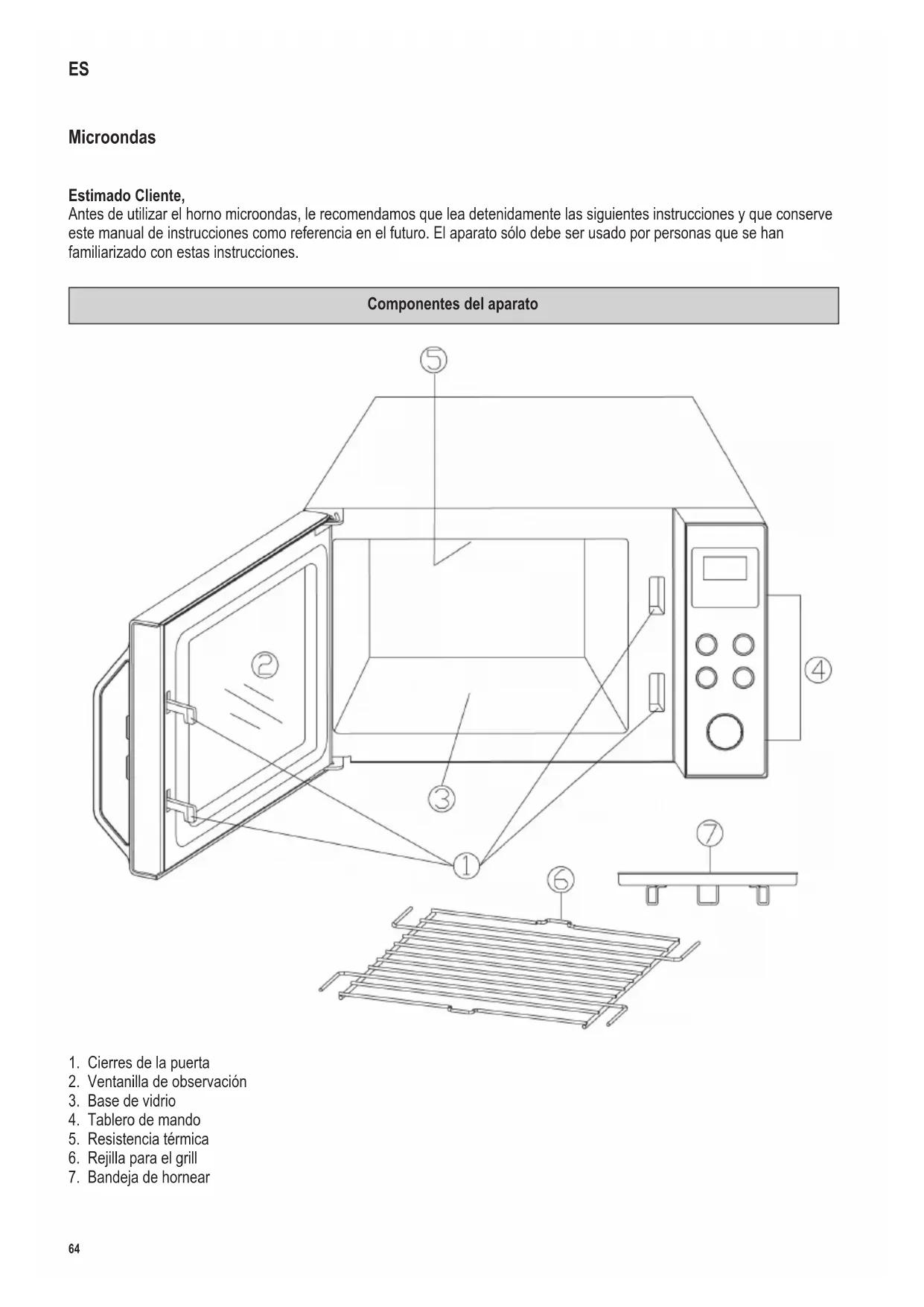 Atención: Las supercies exteriores del electrodoméstico pueden calentarse durante su funcionamiento. También existe peligro de emisión de vapor por las ranuras de ventilación: peligro de quemaduras. ∙ Espere hasta que el aparato se haya enfriado sucientemente para poder transportarlo. ∙ Asegúrese de que ni la carcasa ni el cable de conexión estén demasiado cerca de una placa de cocción caliente o de llamas abiertas. No deje que el cable de conexión cuelgue y manténgalo alejado de las piezas del aparato que se calienten.69 142 x 208 mm ∙ Si no se mantiene limpio el aparato y no se eliminan los restos de comida, la supercie puede deteriorarse, lo que a su vez puede reducir la vida útil del aparato y, posiblemente, representar un peligro para el usuario. Se deben limpiar las juntas de la puerta, la cámara de cocción con la base de vidrio y las piezas cercanas con un paño húmedo después de cada uso. La rejilla y la bandeja de hornear se pueden lavar en el lavavajillas. Consulte la sección “Limpieza” para obtener detalles sobre la limpieza y el mantenimiento por parte del usuario. ∙ Este aparato ha sido diseñado para el uso doméstico u otra aplicación similar, por ejemplo - en cocinas de personal, en ocinas y otros puntos comerciales, - en empresas agrícolas, - por los clientes de hoteles, pensiones, etc. y alojamientos similares, - en casas rurales. ∙ Atención: Cualquier trabajo de mantenimiento o reparación que precise la extracción de alguna cubierta protectora contra la radiación del microondas representa un serio peligro para personas no cualicadas. Esto incluye la sustitución del cable especial eléctrico o la bombilla del alumbrado interior. El aparato no debe ser abierto, excepto por personal cualicado. Para cualquier reparación, póngase en contacto con nuestro departamento de atención al cliente por teléfono o email (consulte el apéndice). ∙ Al calentar líquidos en su microondas, el líquido puede calentarse más allá del punto de ebullición sin burbujear visiblemente. Por lo tanto, es importante tener muchísimo cuidado al tocar los recipientes, p. ej. al sacarlos del horno. ∙ Los huevos con su cáscara o huevos enteros cocidos no deberán calentarse en un horno microondas, ya que podrían explotar incluso después de que el proceso de calentamiento en el microondas hubiera concluido. ∙ Atención: Es también sumamente peligroso calentar en el aparato líquidos o cualquier tipo de comida sólida dentro de recipientes cerrados, puesto que existe un riesgo real de explosión. ∙ El contenido de biberones o recipientes de vidrio con comida para niños deben ser revueltos o sacudidos para asegurar que el calor está distribuido de modo uniforme. Atención: Para evitar quemaduras dolorosas y peligrosas, controle siempre la temperatura antes de darle de comer al niño. ∙ Al calentar o cocer comida que está envuelta en materiales combustibles como plástico o papel, hay un riesgo de que estos ardan. También es posible que la comida se seque y hasta puede arder si el tiempo de cocción seleccionado es demasiado largo. La grasa y el aceite también son sustancias inamables. Por lo tanto, es importante controlar el aparato durante su funcionamiento. Por supuesto70 142 x 208 mm que los líquidos altamente inamables como el alcohol concentrado no deben ser calentados. ∙ Si observa que está saliendo humo durante el funcionamiento, mantenga la puerta cerrada para inhibir o apagar las llamas si hay. Apague la unidad inmediatamente y saque el enchufe de la toma de pared. ∙ Para evitar el peligro de quemaduras, hay que utilizar siempre un paño apropiado para el horno al extraer los alimentos del horno, dado que los utensilios y los recipientes de cocina se calientan no sólo durante la utilización de las funciones de grill y aire caliente, sino también durante el funcionamiento del microondas. ∙ Los termómetros especiales de cocina (como los que se emplean con un horno normal) no son indicados para el uso con los microondas. Antes de usarlo por primera vez ∙ Después de desembalarlo y cada vez que conecta la unidad a la red eléctrica, examine la unidad y el cable de alimentación por si hubiera indicios de desperfectos. ∙ Nota: Asegúrese también de que la puerta (incluyendo la ventanilla de observación, el sellado de la puerta y los cierres) no está dañada o torcida y ciérrela rmemente contra su marco. Esto es importante porque asegura que no haya escapes de energía de microondas durante el funcionamiento. Por la misma razón debe examinar cuidadosamente la caja entera junto con el interior del horno. En caso de avería, este aparato no debe ser usado hasta que haya sido reparado por un técnico cualicado. ∙ Retire todos los materiales de embalaje del interior y del exterior, y cualquier adhesivo si lo hubiera. Todos estos materiales están indicados para el reciclaje. ∙ Precaución: No retirar los tacos de goma de la rejilla. ∙ No extraiga la capa protectora que cubre el interior de la puerta. ∙ Precaución: Mantenga a los niños alejados del material de embalaje, porque podría ser peligroso, existe el peligro de asxia. ∙ Antes de utilizar el aparato por vez primera, o tras largos períodos de no utilización, se debe limpiar meticulosamente como viene indicado en la sección Limpieza. ∙ Antes de utilizar el horno microondas, ponga el aparato a calentar en el ajuste grill (sin activar la función microondas) por unos 10 minutos. Esto eliminará el olor típico que sale de un grill la primera vez que se enciende. Puede que salga un poco de humo; esto es normal, pero asegure una ventilación adecuada. ∙ Nota: No encienda el aparato a no ser que la comida a calentar o cocinar haya sido introducida en el horno. La utilización del electrodoméstico vacío podría dañar el aparato. Dispositivo ISM Este electrodoméstico es un aparato del grupo 2 de la clase B ISM. El grupo 2 incluye todos los aparatos ISM 