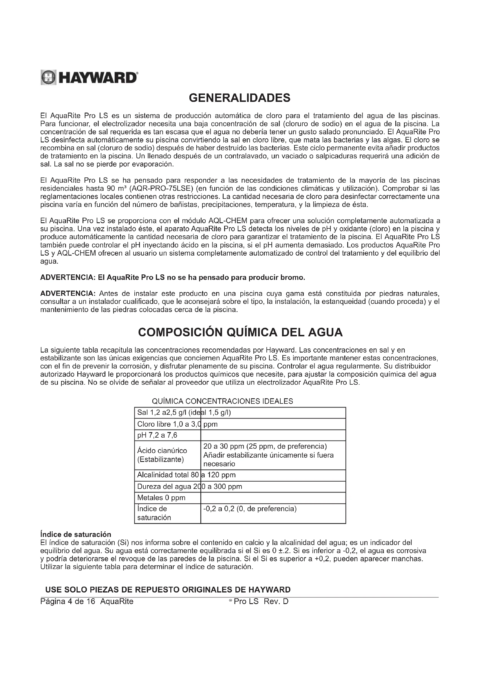 Sal 1,2 a2,5 g/l (ideal 1,5 g/l) Cloro libre 1,0 a 3,0 ppm pH 7,2 a 7,6 Ácido cianúrico (Estabilizante) 20 a 30 ppm (25 ppm, de preferencia) Añadir estabilizante únicamente si fuera necesario Alcalinidad total 80 a 120 ppm Dureza del agua 200 a 300 ppm Metales 0 ppm Índice de saturación -0,2 a 0,2 (0, de preferencia) Índice de saturación El índice de saturación (Si) nos informa sobre el contenido en calcio y la alcalinidad del agua; es un indicador del equilibrio del agua. Su agua está correctamente equilibrada si el Si es 0 ±.2. Si es inferior a -0,2, el agua es corrosiva y podría deteriorarse el revoque de las paredes de la piscina. Si el Si es superior a +0,2, pueden aparecer manchas. Utilizar la siguiente tabla para determinar el índice de saturación.USE SOLO PIEZAS DE REPUESTO ORIGINALES DE HAYWARD Página 5 de 16 AquaRite