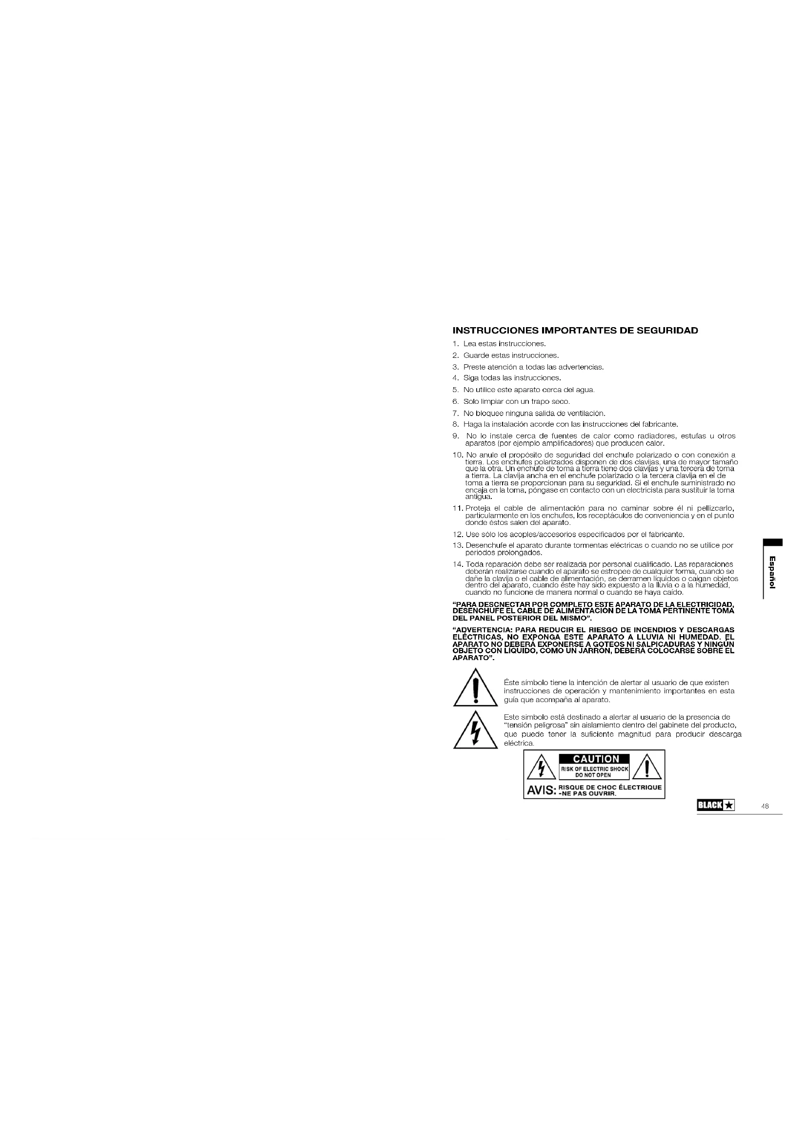 deberán realizarse cuando el aparato se estropee de cualquier forma, cuando se dañe la clavija o el cable de alimentación, se derramen líquidos o caigan objetos dentro del aparato, cuando éste hay sido expuesto a la lluvia o a la humedad, cuando no funcione de manera normal o cuando se haya caído. “PARA DESCNECTAR POR COMPLETO ESTE APARATO DE LA ELECTRICIDAD, DESENCHUFE EL CABLE DE ALIMENTACIÓN DE LA TOMA PERTINENTE TOMA DEL PANEL POSTERIOR DEL MISMO”. “ADVERTENCIA: PARA REDUCIR EL RIESGO DE INCENDIOS Y DESCARGAS ELÉCTRICAS, NO EXPONGA ESTE APARATO A LLUVIA NI HUMEDAD. EL APARATO NO DEBERÁ EXPONERSE A GOTEOS NI SALPICADURAS Y NINGÚN OBJETO CON LÍQUIDO, COMO UN JARRÓN, DEBERÁ COLOCARSE SOBRE EL APARATO”. Este símbolo está destinado a alertar al usuario de la presencia de “tensión peligrosa” sin aislamiento dentro del gabinete del producto, que puede tener la suciente magnitud para producir descarga eléctrica. Éste símbolo tiene la intención de alertar al usuario de que existen instrucciones de operación y mantenimiento importantes en esta guía que acompaña al aparato. Español5049 All electrical and electronic products should be disposed of separately from the municipal waste stream via designated collection facilities appointed by the government or the local authorities. La ocina Americana de Protección de la Salud ha especicado los siguientes niveles admisibles de exposición de ruido: DURACIÓN POR DÍA Y HORAS NIVEL DE SONIDO DBA BAJA RESPUESTA