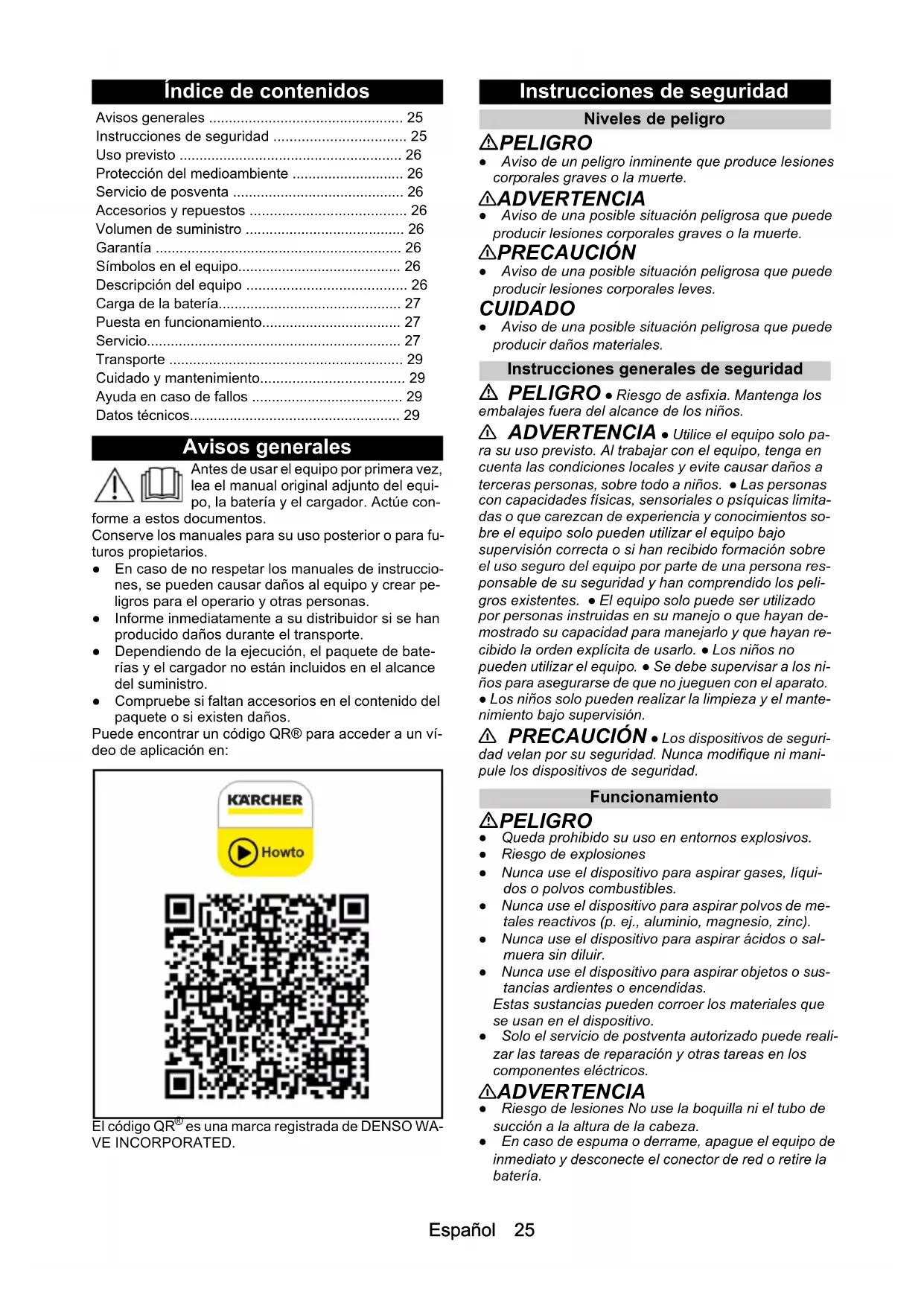 6,5 Dimensioni e pesi Peso kg 3,9 Lunghezza x larghezza x altezza mm 400x210 x245 Valori rilevati secondo norma EN 60335-2-69 Livello di pressione acustica dB(A) <70Español 25 Índice de contenidos Avisos generales Antes de usar el equipo por primera vez, lea el manual original adjunto del equi- po, la batería y el cargador. Actúe con- forme a estos documentos. Conserve los manuales para su uso posterior o para fu- turos propietarios. ● En caso de no respetar los manuales de instruccio- nes, se pueden causar daños al equipo y crear pe- ligros para el operario y otras personas. ● Informe inmediatamente a su distribuidor si se han producido daños durante el transporte. ● Dependiendo de la ejecución, el paquete de bate- rías y el cargador no están incluidos en el alcance del suministro. ● Compruebe si faltan accesorios en el contenido del paquete o si existen daños. Puede encontrar un código QR® para acceder a un ví- deo de aplicación en: El código QR