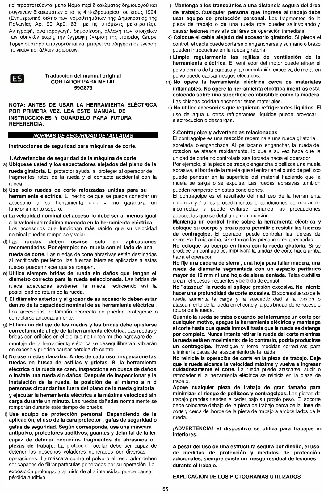 aplicación, el uso de la cara protector , gafas de seguridad o gafas de seguridad. Según corresponda, use una máscara antipolvo, protectores auditivos, guantes y delantal de taller capaz de detener pequeños fragmentos de abrasivos o piezas de trabajo. La protección ocular debe ser capaz de detener los desechos voladores generados por diversas operaciones. La máscara contra el polvo o el respirador deben ser capaces de filtrar partículas generadas por su operación. La exposición prolongada al ruido de alta intensidad puede causar pérdida auditiva. j) Mantenga a los transeúntes a una distancia segura del área de trabajo. Cualquier persona que ingrese al trabajo debe usar equipo de protección personal. Los fragmentos de la pieza de trabajo o de una rueda rota pueden salir volando y causar lesiones más allá del área de operación inmediata. k) Coloque el cable alejado del accesorio giratorio. Si pierde el control, el cable puede cortarse o engancharse y su mano o brazo pueden introducirse en la rueda giratoria. l) Limpie regularmente las rejillas de ventilación de la herramienta eléctrica. El ventilador del motor puede atraer el polvo dentro de la carcasa y la acumulación excesiva de metal en polvo puede causar riesgos eléctricos. m) No opere la herramienta eléctrica cerca de materiales inflamables. No opere la herramienta eléctrica mientras está colocada sobre una superficie combustible como la madera. Las chispas podrían encender estos materiales. n) No utilice accesorios que requieran refrigerantes líquidos. El uso de agua u otros refrigerantes líquidos puede provocar electrocución o descargas. 2.Contragolpe y advertencias relacionadas El contragolpe es una reacción repentina a una rueda giratoria apretada o enganchada. Al pellizcar o enganchar, la rueda de rotación se atasca rápidamente, lo que a su vez hace que la unidad de corte no controlada sea forzada hacia el operador; Por ejemplo, si la pieza de trabajo engancha o pellizca una muela abrasiva, el borde de la muela que al entrar en el punto de pellizco puede penetrar en la superficie del material haciendo que la muela se salga o se expulse. Las ruedas abrasivas también pueden romperse en estas condiciones. El contragolpe es el resultado del mal uso de la herramienta eléctrica y / o los procedimientos o condiciones de operación incorrectas y puede evitarse tomando las precauciones adecuadas que se detallan a continuación. Mantenga un control firme sobre la herramienta eléctrica y coloque su cuerpo y brazo para permitirle resistir las fuerzas de contragolpe. El operador puede controlar las fuerzas de retroceso hacia arriba, si se toman las precauciones adecuadas. No coloque su cuerpo en línea con la rueda giratoria. Si se produce un contragolpe, impulsará la unidad de corte hacia arriba hacia el operador. No fije una cadena de sierra , una hoja para tallar madera, una rueda de diamante segmentada con un espacio periférico mayor de 10 mm ni una hoja de sierra dentada. Tales cuchillas crean retrocesos frecuentes y pérdida de control. No "atasque" la rueda ni aplique presión excesiva. No intente hacer una profundidad de corte excesiva. El sobreesfuerzo de la rueda aumenta la carga y la susceptibilidad a la torsión o atascamiento de la rueda en el corte y la posibilidad de retroceso o rotura de la rueda. Cuando la rueda se traba o cuando se interrumpe un corte por cualquier motivo, apague la herramienta eléctrica y mantenga el corte hasta que quede inmóvil hasta que la rueda se detenga por completo. Nunca intente retirar la rueda del corte mientras la rueda está en movimiento; de lo contrario, podría producirse un contragolpe. Investigue y tome medidas correctivas para eliminar la causa del atascamiento de la rueda. No reinicie la operación de corte en la pieza de trabajo. Deje que la rueda alcance la velocidad máxima y vuelva a ingresar cuidadosamente el corte. La rueda puede atascarse, subir o retroceder si la herramienta eléctrica se reinicia en la pieza de trabajo. Apoye cualquier pieza de trabajo de gran tamaño para minimizar el riesgo de pellizcos y contragolpes. Las piezas de trabajo grandes tienden a ceder bajo su propio peso. El soporte debe colocarse debajo de la pieza de trabajo cerca de la línea de corte y cerca del borde de la pieza de trabajo a ambos lados de la rueda. ¡ADVERTENCIA! El dispositivo se utiliza para trabajos en interiores. A pesar del uso de una estructura segura por diseño, el uso de medidas de protección y medidas de protección adicionales, siempre existe un riesgo residual de lesiones durante el trabajo.