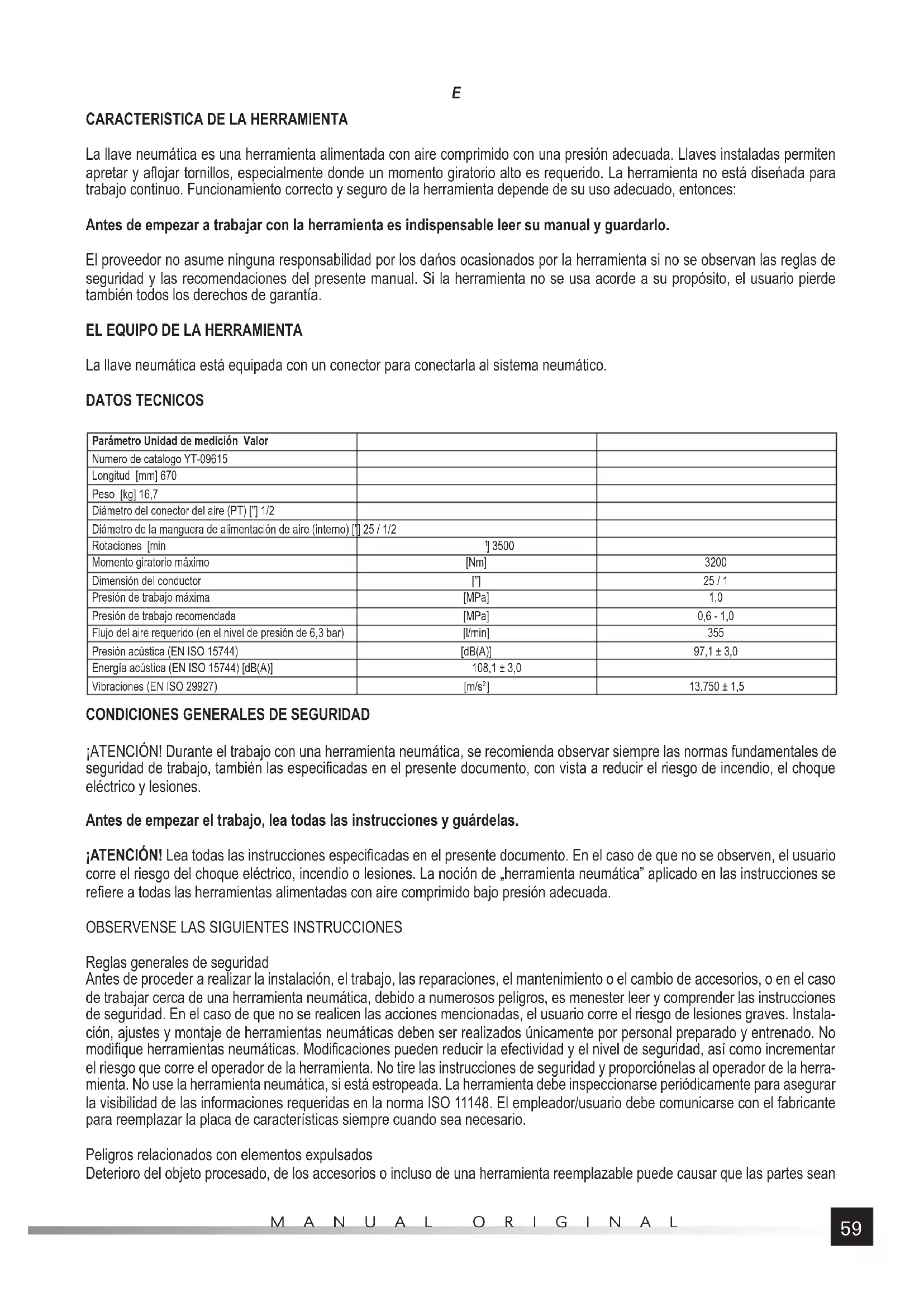 La llave neumática está equipada con un conector para conectarla al sistema neumático. DATOS TECNICOS Parámetro Unidad de medición Valor Numero de catalogo YT-09615 Longitud [mm] 670 Peso [kg] 16,7 Diámetro del conector del aire (PT) [”] 1/2 Diámetro de la manguera de alimentación de aire (interno) [”] 25 / 1/2 Rotaciones [min