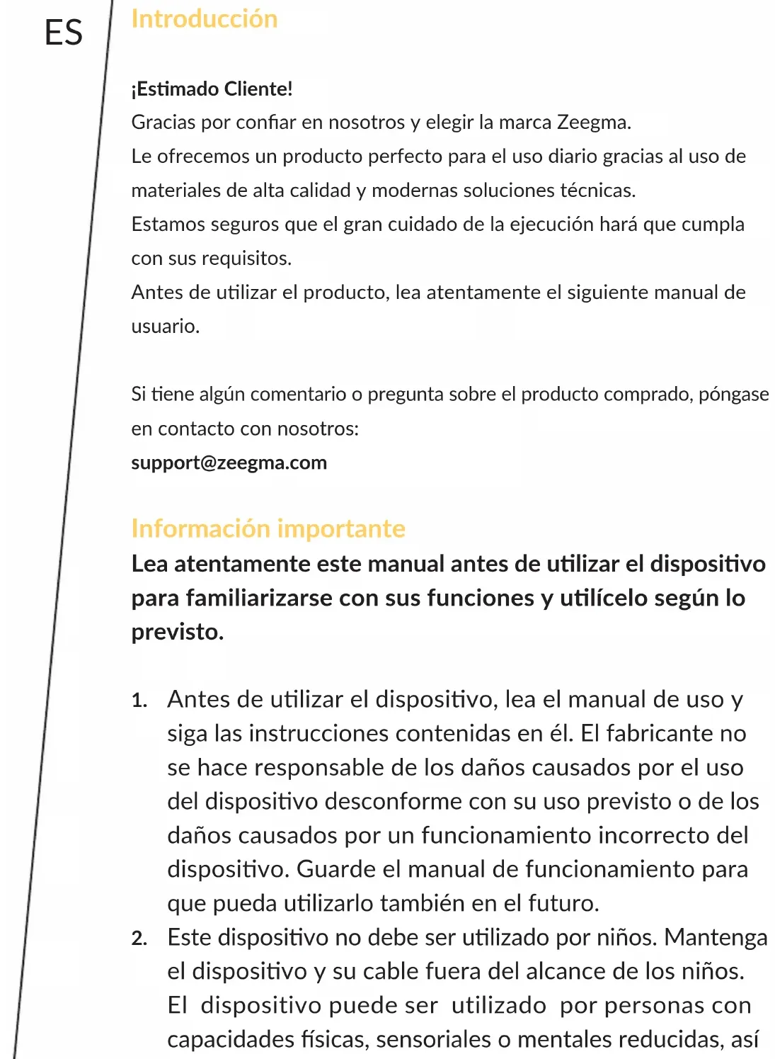 Veillez à ce que l’appareil et les accessoires soient complètement secs avant la prochaine ulisaon. Les photos sont fournies à tre d’illustraon uniquement, l’aspect réel des produits peut diérer de celui présenté sur les photos.ES Introducción ¡Esmado Cliente! Gracias por conar en nosotros y elegir la marca Zeegma. Le ofrecemos un producto perfecto para el uso diario gracias al uso de materiales de alta calidad y modernas soluciones técnicas. Estamos seguros que el gran cuidado de la ejecución hará que cumpla con sus requisitos. Antes de ulizar el producto, lea atentamente el siguiente manual de usuario. Si ene algún comentario o pregunta sobre el producto comprado, póngase en contacto con nosotros: support@zeegma.com Información importante Lea atentamente este manual antes de ulizar el disposivo para familiarizarse con sus funciones y ulícelo según lo previsto.