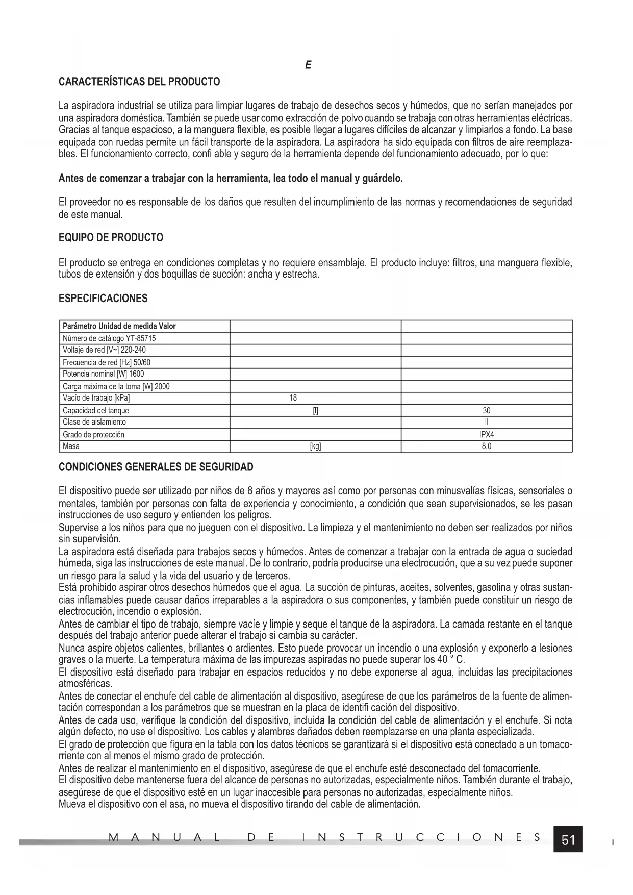 El producto se entrega en condiciones completas y no requiere ensamblaje. El producto incluye: fi ltros, una manguera fl exible, tubos de extensión y dos boquillas de succión: ancha y estrecha. ESPECIFICACIONES Parámetro Unidad de medida Valor Número de catálogo YT-85715 Voltaje de red [V~] 220-240 Frecuencia de red [Hz] 50/60 Potencia nominal [W] 1600 Carga máxima de la toma [W] 2000 Vacío de trabajo [kPa] 18 Capacidad del tanque [l] 30 Clase de aislamiento II Grado de protección IPX4 Masa [kg] 8,0