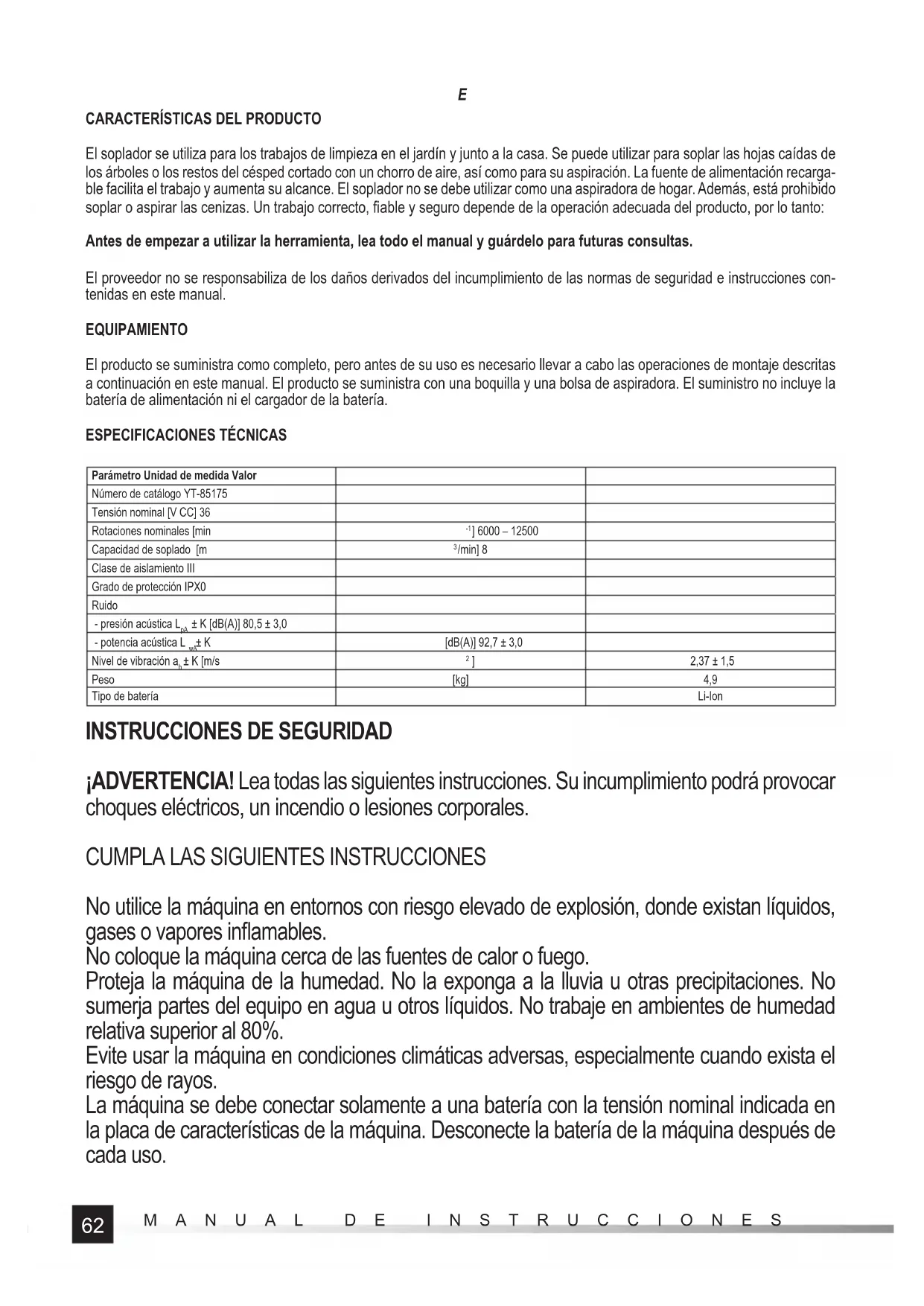 La boquilla está equipada con cierres que deben entrar en los agujeros de la boquilla (II). Asegure la conexión con un tornillo (II). Coloque el mango frontal en la posición más cómoda. La posición del mango se cambia pulsando y manteniendo simultáneamen- te ambos botones de bloqueo que se encuentran en la base del mango (III). Luego gire el mango a la posición deseada y suelte los botones de bloqueo. Asegúrese de que el mango esté bloqueado en la posición deseada. Preparación del producto para su uso como soplador Mueva la palanca de cambio del modo de trabajo a la posición inferior para que se encuentre junto al símbolo que indica la direc- ción del fl ujo de aire: soplado (IV). Asegúrese de que la bolsa no esté instalada en el soplador. El producto está preparado para el uso como soplador. Preparación del producto para su uso como aspiradora Mueva la palanca de cambio del modo de trabajo a la posición superior para que se encuentre junto al símbolo que indica la dirección del fl ujo de aire: aspiración (V). Instale la bolsa deslizando su brida a la boca de salida de aire para que la bloquee el cierre (VI). La brida solamente se puede desmontar manteniendo pulsado el botón de bloqueo y luego deslizando la brida fuera de la boca de salida de aire (VI). En la parte frontal de la bolsa hay una cinta con un ojal que se debe enganchar en el gancho de la parte inferior de la boquilla (VII). Esta instalación proporcionará dos puntos de sujeción de la bolsa y permitirá aprovechar toda su capacidad. La bolsa tiene un cierre en la parte inferior. El cierre sirve para vaciar fácilmente la bolsa. Antes de cada uso de la aspiradora, asegúrese de que la bolsa esté completamente vacía y cerrada. Cinta de apoyo La aspiradora está equipada con una cinta de apoyo adicional. La cinta reduce el esfuerzo de las manos al sostener la máquina, sobre todo durante un trabajo prolongado. Empuje el cierre de la cinta a través del agujero en la parte superior de la carcasa de la máquina. La cinta debe cruzar el cuerpo del operador en diagonal y ajustarse de tal manera que la mayor parte del peso de la máquina descanse sobre la cinta. Conexión a la red La máquina funciona con dos baterías. La máquina no se pondrá en marcha si una de las baterías no está instalada o está des- cargada. Las baterías de la máquina están conectadas en serie, lo que signifi ca que la máquina se alimenta con la suma de sus voltajes nominales. Se recomienda que ambas baterías tengan la misma capacidad y se carguen en el mismo grado. Las bate- rías utilizadas para alimentar la máquina también deben ser utilizadas de igual manera. No se recomienda conectar una batería desgastada con una nueva, aunque ambas se carguen en el mismo grado y tengan la misma capacidad. Si no se cumplen las recomendaciones anteriores, los tiempos de funcionamiento serán más cortos y las baterías utilizadas para alimentar la máquina se desgastarán más rápidamente. Para la alimentación de la herramienta solo se pueden utilizar las baterías de Li-Ion YATO de 18 V listadas: YT-82842, YT-82843, YT-82844 y YT-82845, que solo pueden cargarse con los cargadores YATO YT-82848 o YT-82849. Está prohibido utilizar otras baterías con una tensión diferente y que no coincidan con las ranuras de la herramienta. Está prohibido modifi car las ranuras y/o la batería para que coincidan. Introduzca las baterías cargadas en las ranuras del compartimento de la batería para que el cierre de la batería la mantenga en su lugar (IX). Compruebe que ninguna de las baterías no se pueda salir accidentalmente de la ranura de la herramienta. Arranque y parada del soplador El soplador está equipado con un interruptor giratorio. Si la perilla de interruptor se encuentra en la posición 0, la máquina se apaga. Cualquier otra posición indica el trabajo de la máquina. Cuanto más alto sea el número en la perilla del interruptor, mayor será la velocidad del motor y mayor la corriente de aire. La fuerza de la corriente de aire debe adaptarse al trabajo a realizar. Utilice siempre la mínima corriente sufi ciente para el trabajo deseado. También hay que tener en cuenta que cuanto mayor sea la corriente de aire, menor será el tiempo de funcionamiento con un juego de baterías. Después de terminar el trabajo, apague la máquina con el interruptor, espere a que las partes móviles se detengan por completo y desconecte ambas baterías. Instrucciones de uso Asegúrese siempre de que las bocas de entrada y salida y la boquilla no estén obstruidas. En caso de obstrucción parcial o total, el primer signo será un ruido más alto y la vibración más intensa. Las bocas de entrada y salida se deben desobstruir completa e inmediatamente. El trabajo con el producto obstruido es poco efi ciente y puede causar sobrecalentamiento y daños al mismo. Antes de comenzar a trabajar, revise el área de trabajo minuciosamente, retirando cualquier objeto que pueda causar un peligro si es lanzado por un soplo de aire. Además, retire cualquier objeto que pueda moverse de forma involuntaria bajo la infl uencia de la corriente de aire, por ejemplo, volcándose y causando un peligro. Se debe establecer una zona de seguridad de al menos 15 m de ancho desde el área de trabajo. La zona de seguridad no debe ser accesible a nadie, especialmente a los niños. Las personas que acceden a la zona de seguridad deben tener cuidado y usar66