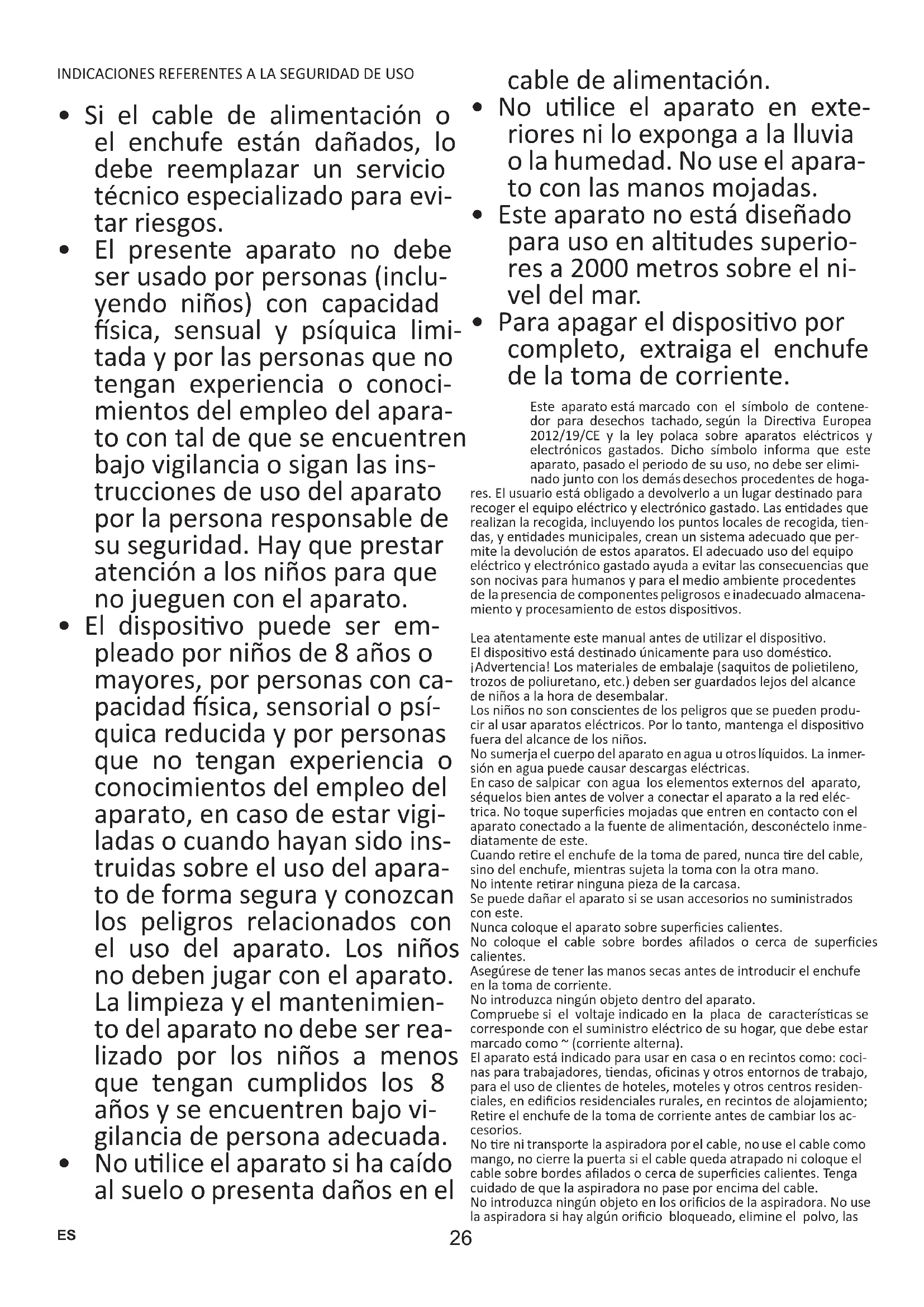 - Para apagar el disposivo por completo, extraiga el enchufe de la toma de corriente. Este aparato está marcado con el símbolo de contene- dor para desechos tachado, según la Direcva Europea 2012/19/CE y la ley polaca sobre aparatos eléctricos y electrónicos gastados. Dicho símbolo informa que este aparato, pasado el periodo de su uso, no debe ser elimi- nado junto con los demás desechos procedentes de hoga- res. El usuario está obligado a devolverlo a un lugar desnado para recoger el equipo eléctrico y electrónico gastado. Las endades que realizan la recogida, incluyendo los puntos locales de recogida, en- das, y endades municipales, crean un sistema adecuado que per- mite la devolución de estos aparatos. El adecuado uso del equipo eléctrico y electrónico gastado ayuda a evitar las consecuencias que son nocivas para humanos y para el medio ambiente procedentes de la presencia de componentes peligrosos e inadecuado almacena- miento y procesamiento de estos disposivos. Lea atentamente este manual antes de ulizar el disposivo. El disposivo está desnado únicamente para uso domésco. ¡Advertencia! Los materiales de embalaje (saquitos de polieleno, trozos de poliuretano, etc.) deben ser guardados lejos del alcance de niños a la hora de desembalar. Los niños no son conscientes de los peligros que se pueden produ- cir al usar aparatos eléctricos. Por lo tanto, mantenga el disposivo fuera del alcance de los niños. No sumerja el cuerpo del aparato en agua u otros líquidos. La inmer- sión en agua puede causar descargas eléctricas. En caso de salpicar con agua los elementos externos del aparato, séquelos bien antes de volver a conectar el aparato a la red eléc- trica. No toque supercies mojadas que entren en contacto con el aparato conectado a la fuente de alimentación, desconéctelo inme- diatamente de este. Cuando rere el enchufe de la toma de pared, nunca re del cable, sino del enchufe, mientras sujeta la toma con la otra mano. No intente rerar ninguna pieza de la carcasa. Se puede dañar el aparato si se usan accesorios no suministrados con este. Nunca coloque el aparato sobre supercies calientes. No coloque el cable sobre bordes alados o cerca de supercies calientes. Asegúrese de tener las manos secas antes de introducir el enchufe en la toma de corriente. No introduzca ningún objeto dentro del aparato. Compruebe si el voltaje indicado en la placa de caracteríscas se corresponde con el suministro eléctrico de su hogar, que debe estar marcado como ~ (corriente alterna). El aparato está indicado para usar en casa o en recintos como: coci- nas para trabajadores, endas, ocinas y otros entornos de trabajo, para el uso de clientes de hoteles, moteles y otros centros residen- ciales, en edicios residenciales rurales, en recintos de alojamiento; Rere el enchufe de la toma de corriente antes de cambiar los ac- cesorios. No re ni transporte la aspiradora por el cable, no use el cable como mango, no cierre la puerta si el cable queda atrapado ni coloque el cable sobre bordes alados o cerca de supercies calientes. Tenga cuidado de que la aspiradora no pase por encima del cable. No introduzca ningún objeto en los oricios de la aspiradora. No use la aspiradora si hay algún oricio bloqueado, elimine el polvo, las ES27 pelusas, el cabello y cualquier otra cosa que pueda reducir el ujo de aire. Mantenga el cabello, la ropa suelta, los dedos y otras partes del cuerpo alejados de los oricios y las piezas móviles. No use la aspiradora para aspirar sustancias inamables como gaso- lina y no la use en lugares donde pueda haber sustancias similares. Si el aparato dispone de un enrollador, sostenga el enchufe mien- tras enrolla el cable. No deje que el enchufe se suelte mientras se enrolla el cable. No aspire nada que esté ardiendo o humeando, como cigarrillos, fósforos o cenizas calientes. No use la aspiradora sin la bolsa para el polvo y/o los ltros en su lugar. Si el oricio que aspira aire, la manguera de succión o el tubo tele- scópico están obstruidos, debe apagar la aspiradora inmediatamen- te. Antes de volver a encender la aspiradora, rere primero el objeto que está obstruyendo. No ulice la aspiradora demasiado cerca de calentadores, radiado- res, colillas de cigarrillos, etc. Antes de usar la aspiradora, rere los objetos alados del suelo para evitar dañar la bolsa para el polvo. No aspire polvo no como: harina, yeso, tóner de impresora, etc., ya que puede obstruir los ltros y dañar la aspiradora. No aparque la aspiradora con el tubo telescópico completamente extendido vercal y horizontalmente. DATOS TÉCNICOS: Parámetros de potencia: AC 230V / 50Hz Potencia nominal: 850 W Potencia máxima: 900 W Peso neto: 5,4 kg/ 5,8 kg / 6,4 kg / 6,5 kg* SU DISPOSITIVO: