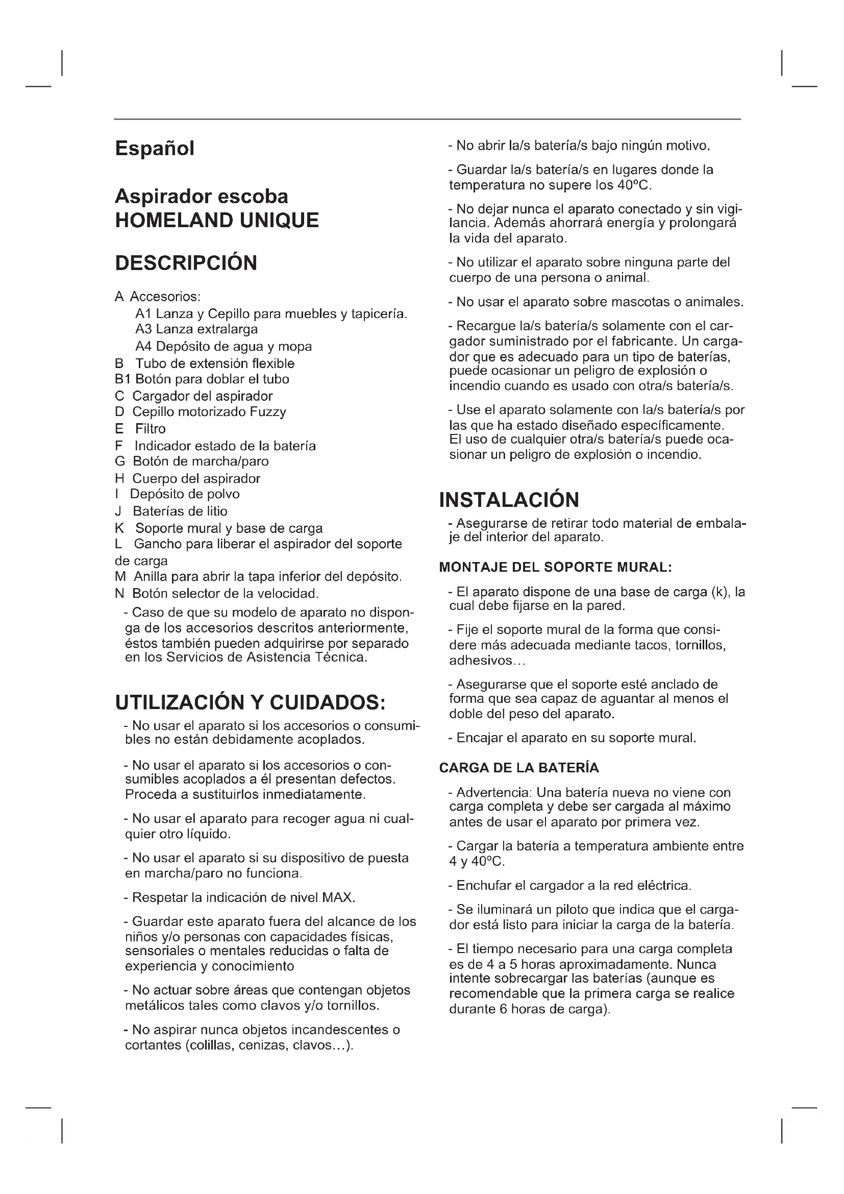 A1A3Fig.01 Fig.02 Fig.03 Fig.04 MAXFig.05 Fig.06 Fig.07 Fig.08Español Aspirador escoba HOMELAND UNIQUE DESCRIPCIÓN A Accesorios: A1 Lanza y Cepillo para muebles y tapicería. A3 Lanza extralarga A4 Depósito de agua y mopa B Tubo de extensión exible B1 Botón para doblar el tubo C Cargador del aspirador D Cepillo motorizado Fuzzy E Filtro F Indicador estado de la batería G Botón de marcha/paro H Cuerpo del aspirador I Depósito de polvo J Baterías de litio K Soporte mural y base de carga L Gancho para liberar el aspirador del soporte de carga M Anilla para abrir la tapa inferior del depósito. N Botón selector de la velocidad. - Caso de que su modelo de aparato no dispon- ga de los accesorios descritos anteriormente, éstos también pueden adquirirse por separado en los Servicios de Asistencia Técnica. UTILIZACIÓN Y CUIDADOS: - No usar el aparato si los accesorios o consumi- bles no están debidamente acoplados. - No usar el aparato si los accesorios o con- sumibles acoplados a él presentan defectos. Proceda a sustituirlos inmediatamente. - No usar el aparato para recoger agua ni cual- quier otro líquido. - No usar el aparato si su dispositivo de puesta en marcha/paro no funciona. - Respetar la indicación de nivel MAX. - Guardar este aparato fuera del alcance de los niños y/o personas con capacidades físicas, sensoriales o mentales reducidas o falta de experiencia y conocimiento - No actuar sobre áreas que contengan objetos metálicos tales como clavos y/o tornillos. - No aspirar nunca objetos incandescentes o cortantes (colillas, cenizas, clavos…). - No abrir la/s batería/s bajo ningún motivo. - Guardar la/s batería/s en lugares donde la temperatura no supere los 40ºC. - No dejar nunca el aparato conectado y sin vigi- lancia. Además ahorrará energía y prolongará la vida del aparato. - No utilizar el aparato sobre ninguna parte del cuerpo de una persona o animal. - No usar el aparato sobre mascotas o animales. - Recargue la/s batería/s solamente con el car- gador suministrado por el fabricante. Un carga- dor que es adecuado para un tipo de baterías, puede ocasionar un peligro de explosión o incendio cuando es usado con otra/s batería/s. - Use el aparato solamente con la/s batería/s por las que ha estado diseñado especícamente. El uso de cualquier otra/s batería/s puede oca- sionar un peligro de explosión o incendio. INSTALACIÓN - Asegurarse de retirar todo material de embala- je del interior del aparato. MONTAJE DEL SOPORTE MURAL: - El aparato dispone de una base de carga (k), la cual debe jarse en la pared. - Fije el soporte mural de la forma que consi- dere más adecuada mediante tacos, tornillos, adhesivos… - Asegurarse que el soporte esté anclado de forma que sea capaz de aguantar al menos el doble del peso del aparato. - Encajar el aparato en su soporte mural.