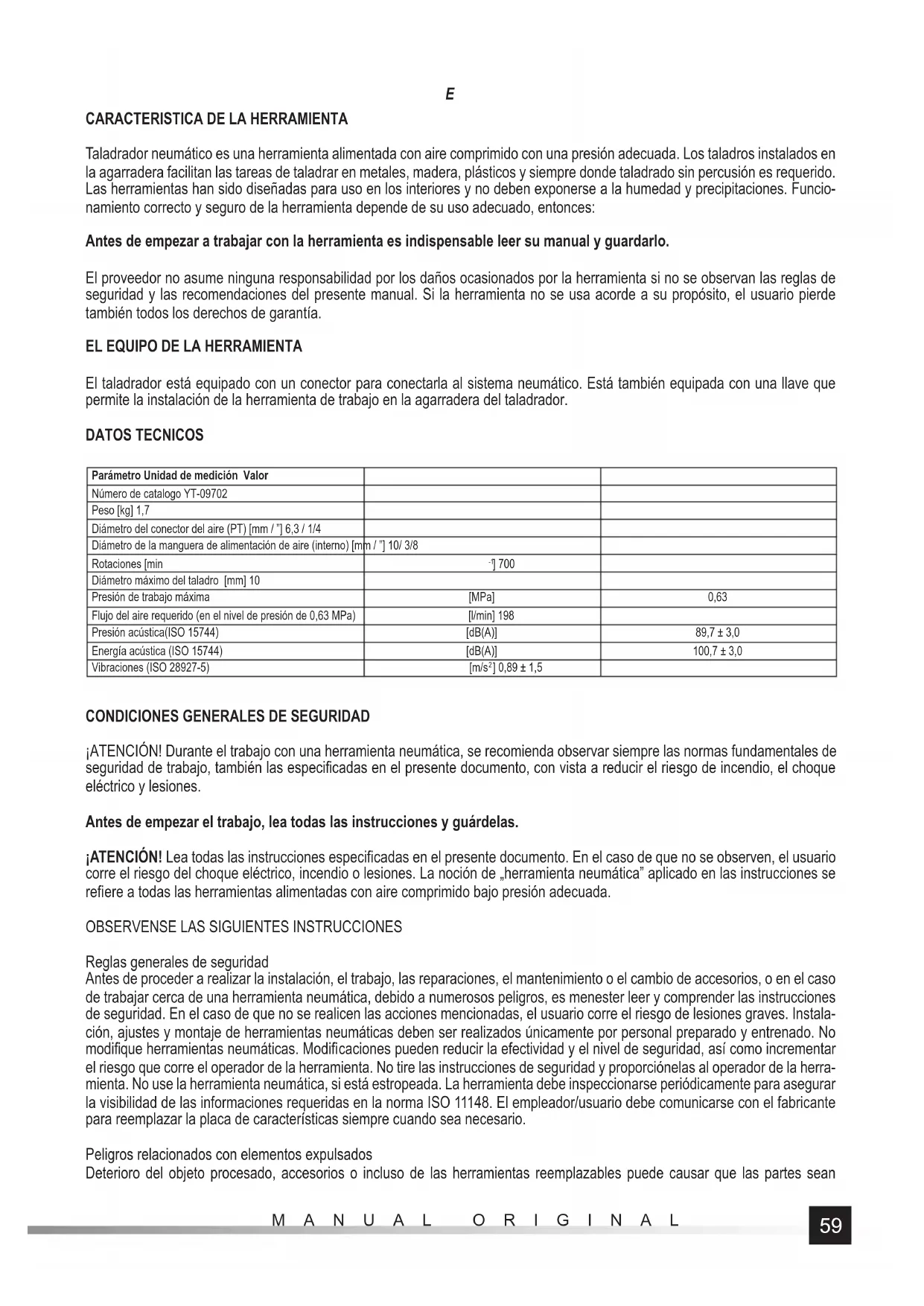 ¡ATENCIÓN! Durante el trabajo con una herramienta neumática, se recomienda observar siempre las normas fundamentales de seguridad de trabajo, también las especifi cadas en el presente documento, con vista a reducir el riesgo de incendio, el choque eléctrico y lesiones. Antes de empezar el trabajo, lea todas las instrucciones y guárdelas. ¡ATENCIÓN! Lea todas las instrucciones especifi cadas en el presente documento. En el caso de que no se observen, el usuario corre el riesgo del choque eléctrico, incendio o lesiones. La noción de „herramienta neumática” aplicado en las instrucciones se refi ere a todas las herramientas alimentadas con aire comprimido bajo presión adecuada.