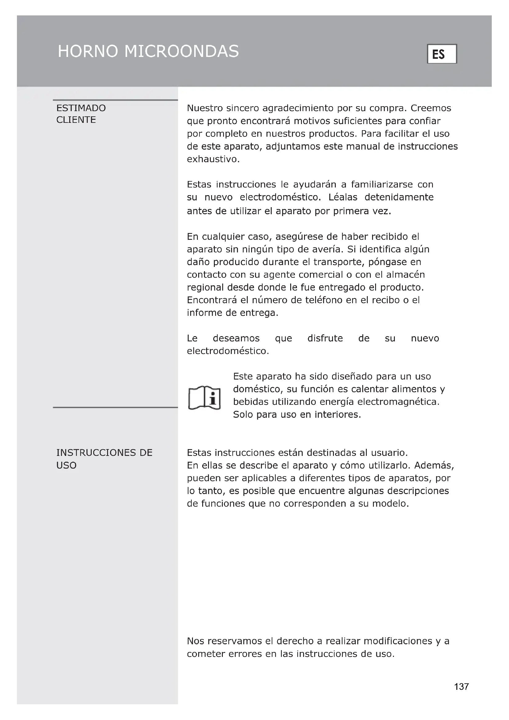 Wenn Sie Informationen benötigen oder ein Problem haben, wenden Sie sich bitte an das Hisense- Kundendienstzentrum in Ihrem Land (die Telefonnummer finden Sie in der weltweiten Garantieleiste). Wenn es in Ihrem Land kein Customer Care Centre gibt, wenden Sie sich an Ihren Hisense- Händler vor Ort oder an die Kundendienstabteilung von Hisense-Haushaltsgeräten. Nur für den persönlichen Gebrauch! WÜNSCHT IHNEN VIEL VERGNÜGEN BEI DER VERWENDUNG IHRES GERÄTS 136HORNO MICROONDAS ESTIMADO CLIENTE Nuestro sincero agradecimiento por su compra. Creemos que pronto encontrará motivos suficientes para confiar por completo en nuestros productos. Para facilitar el uso de este aparato, adjuntamos este manual de instrucciones exhaustivo. Estas instrucciones le ayudarán a familiarizarse con su nuevo electrodoméstico. Léalas detenidamente antes de utilizar el aparato por primera vez. En cualquier caso, asegúrese de haber recibido el aparato sin ningún tipo de avería. Si identifica algún daño producido durante el transporte, póngase en contacto con su agente comercial o con el almacén regional desde donde le fue entregado el producto. Encontrará el número de teléfono en el recibo o el informe de entrega. Le deseamos que disfrute de su nuevo electrodoméstico. Este aparato ha sido diseñado para un uso doméstico, su función es calentar alimentos y bebidas utilizando energía electromagnética. Solo para uso en interiores. INSTRUCCIONES DE USO Estas instrucciones están destinadas al usuario. En ellas se describe el aparato y cómo utilizarlo. Además, pueden ser aplicables a diferentes tipos de aparatos, por lo tanto, es posible que encuentre algunas descripciones de funciones que no corresponden a su modelo. Nos reservamos el derecho a realizar modificaciones y a cometer errores en las instrucciones de uso.