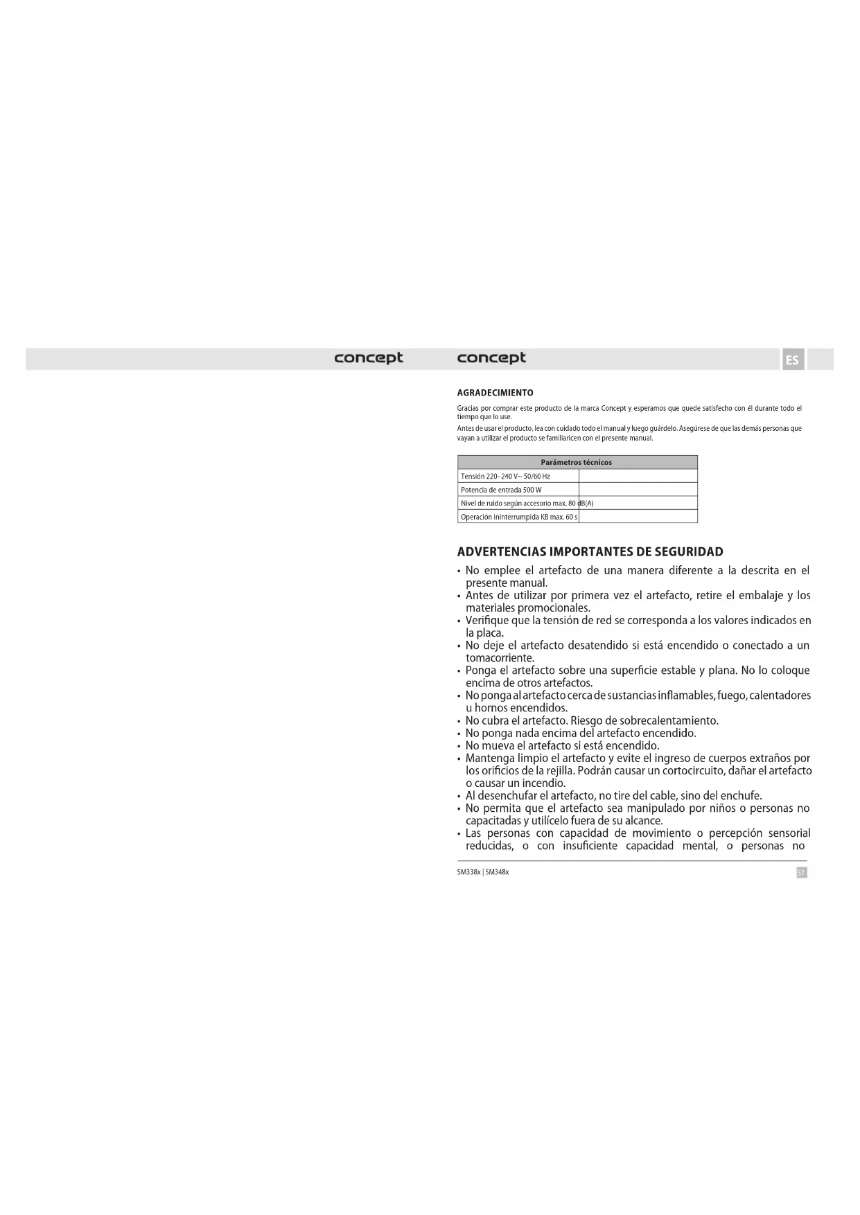 SM338x | SM348x AGRADECIMIENTO Gracias por comprar este producto de la marca Concept y esperamos que quede satisfecho con él durante todo el tiempo que lo use. Antes de usar el producto, lea con cuidado todo el manual y luego guárdelo. Asegúrese de que las demás personas que vayan a utilizar el producto se familiaricen con el presente manual. Parámetros técnicos Tensión 220–240 V~ 50/60 Hz Potencia de entrada 500 W Nivel de ruido según accesorio max. 80 dB(A) Operación ininterrumpida KB max. 60 s