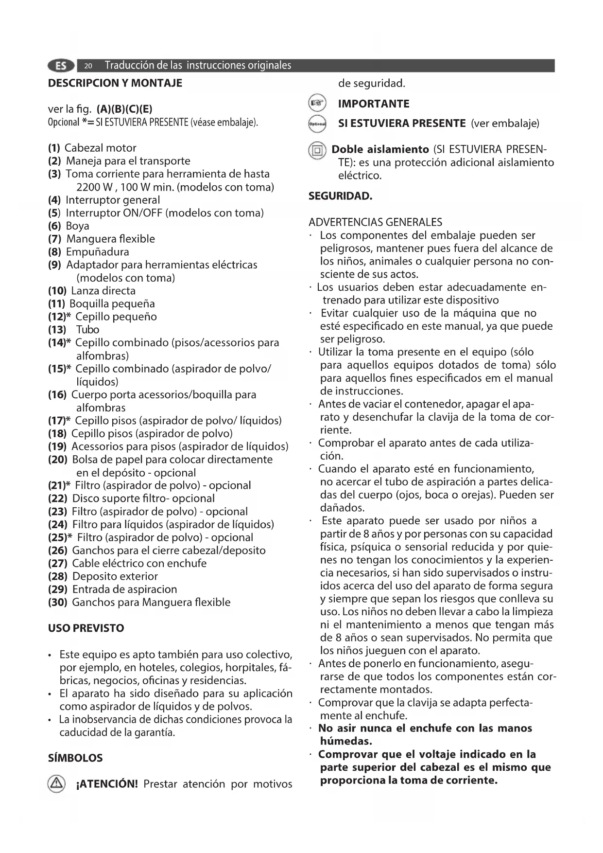 ver la g. (A)(B)(C)(E) Opcional *= SI ESTUVIERA PRESENTE (véase embalaje). (1) Cabezal motor (2) Maneja para el transporte (3) Toma corriente para herramienta de hasta 2200 W , 100 W min. (modelos con toma) (4) Interruptor general (5) Interruptor ON/OFF (modelos con toma) (6) Boya (7) Manguera exible (8) Empuñadura (9) Adaptador para herramientas eléctricas (modelos con toma) (10) Lanza directa (11) Boquilla pequeña (12)* Cepillo pequeño (13) Tubo (14)* Cepillo combinado (pisos/acessorios para alfombras) (15)* Cepillo combinado (aspirador de polvo/ líquidos) (16) Cuerpo porta acessorios/boquilla para alfombras (17)* Cepillo pisos (aspirador de polvo/ líquidos) (18) Cepillo pisos (aspirador de polvo) (19) Acessorios para pisos (aspirador de líquidos) (20) Bolsa de papel para colocar directamente en el depósito - opcional (21)* Filtro (aspirador de polvo) - opcional (22) Disco suporte ltro- opcional (23) Filtro (aspirador de polvo) - opcional (24) Filtro para líquidos (aspirador de líquidos) (25)* Filtro (aspirador de polvo) - opcional (26) Ganchos para el cierre cabezal/deposito (27) Cable eléctrico con enchufe (28) Deposito exterior (29) Entrada de aspiracion (30) Ganchos para Manguera exible USO PREVISTO