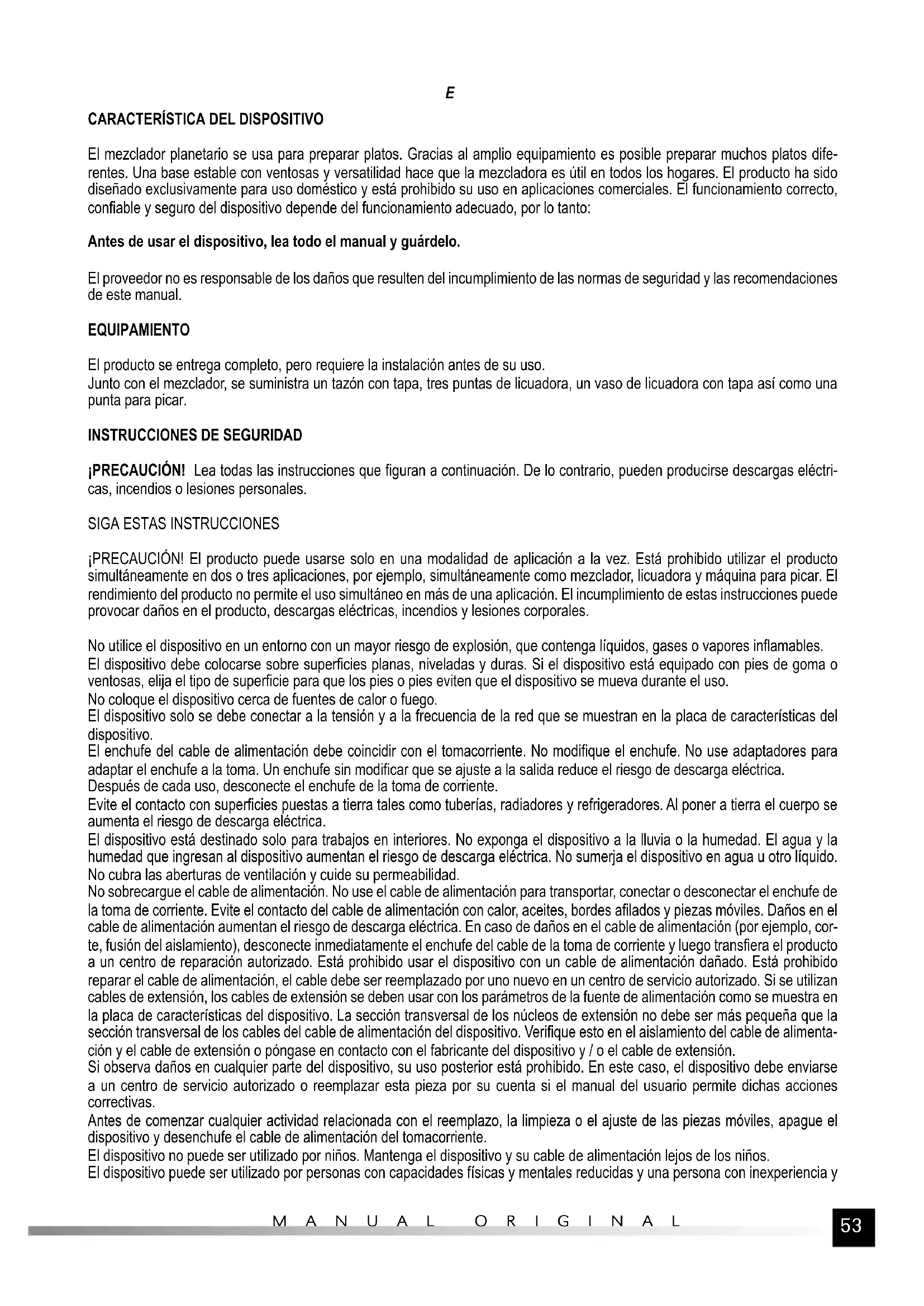 ¡PRECAUCIÓN! El producto puede usarse solo en una modalidad de aplicación a la vez. Está prohibido utilizar el producto simultáneamente en dos o tres aplicaciones, por ejemplo, simultáneamente como mezclador, licuadora y máquina para picar. El rendimiento del producto no permite el uso simultáneo en más de una aplicación. El incumplimiento de estas instrucciones puede provocar daños en el producto, descargas eléctricas, incendios y lesiones corporales. No utilice el dispositivo en un entorno con un mayor riesgo de explosión, que contenga líquidos, gases o vapores inflamables. El dispositivo debe colocarse sobre superficies planas, niveladas y duras. Si el dispositivo está equipado con pies de goma o ventosas, elija el tipo de superficie para que los pies o pies eviten que el dispositivo se mueva durante el uso. No coloque el dispositivo cerca de fuentes de calor o fuego. El dispositivo solo se debe conectar a la tensión y a la frecuencia de la red que se muestran en la placa de características del dispositivo. El enchufe del cable de alimentación debe coincidir con el tomacorriente. No modifique el enchufe. No use adaptadores para adaptar el enchufe a la toma. Un enchufe sin modificar que se ajuste a la salida reduce el riesgo de descarga eléctrica. Después de cada uso, desconecte el enchufe de la toma de corriente. Evite el contacto con superficies puestas a tierra tales como tuberías, radiadores y refrigeradores. Al poner a tierra el cuerpo se aumenta el riesgo de descarga eléctrica. El dispositivo está destinado solo para trabajos en interiores. No exponga el dispositivo a la lluvia o la humedad. El agua y la humedad que ingresan al dispositivo aumentan el riesgo de descarga eléctrica. No sumerja el dispositivo en agua u otro líquido. No cubra las aberturas de ventilación y cuide su permeabilidad. No sobrecargue el cable de alimentación. No use el cable de alimentación para transportar, conectar o desconectar el enchufe de la toma de corriente. Evite el contacto del cable de alimentación con calor, aceites, bordes afilados y piezas móviles. Daños en el cable de alimentación aumentan el riesgo de descarga eléctrica. En caso de daños en el cable de alimentación (por ejemplo, cor- te, fusión del aislamiento), desconecte inmediatamente el enchufe del cable de la toma de corriente y luego transfiera el producto a un centro de reparación autorizado. Está prohibido usar el dispositivo con un cable de alimentación dañado. Está prohibido reparar el cable de alimentación, el cable debe ser reemplazado por uno nuevo en un centro de servicio autorizado. Si se utilizan cables de extensión, los cables de extensión se deben usar con los parámetros de la fuente de alimentación como se muestra en la placa de características del dispositivo. La sección transversal de los núcleos de extensión no debe ser más pequeña que la sección transversal de los cables del cable de alimentación del dispositivo. Verifique esto en el aislamiento del cable de alimenta- ción y el cable de extensión o póngase en contacto con el fabricante del dispositivo y / o el cable de extensión. Si observa daños en cualquier parte del dispositivo, su uso posterior está prohibido. En este caso, el dispositivo debe enviarse a un centro de servicio autorizado o reemplazar esta pieza por su cuenta si el manual del usuario permite dichas acciones correctivas. Antes de comenzar cualquier actividad relacionada con el reemplazo, la limpieza o el ajuste de las piezas móviles, apague el dispositivo y desenchufe el cable de alimentación del tomacorriente. El dispositivo no puede ser utilizado por niños. Mantenga el dispositivo y su cable de alimentación lejos de los niños. El dispositivo puede ser utilizado por personas con capacidades físicas y mentales reducidas y una persona con inexperiencia y54 MANUAL ORIGINAL