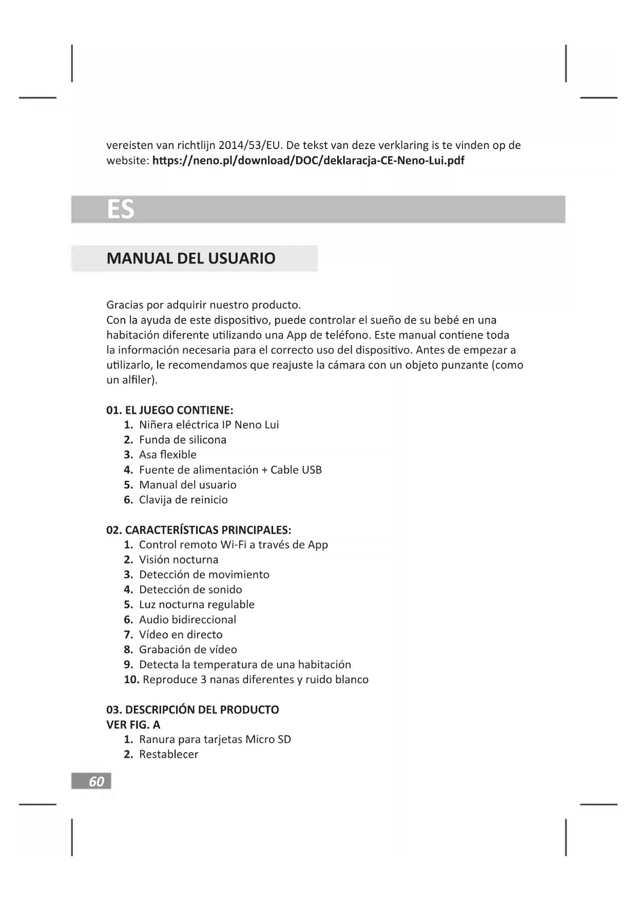 vereisten van richtlijn 2014/53/EU. De tekst van deze verklaring is te vinden op de website: hps://neno.pl/download/DOC/deklaracja-CE-Neno-Lui.pdf Gracias por adquirir nuestro producto. Con la ayuda de este disposivo, puede controlar el sueño de su bebé en una habitación diferente ulizando una App de teléfono. Este manual conene toda la información necesaria para el correcto uso del disposivo. Antes de empezar a ulizarlo, le recomendamos que reajuste la cámara con un objeto punzante (como un aller).