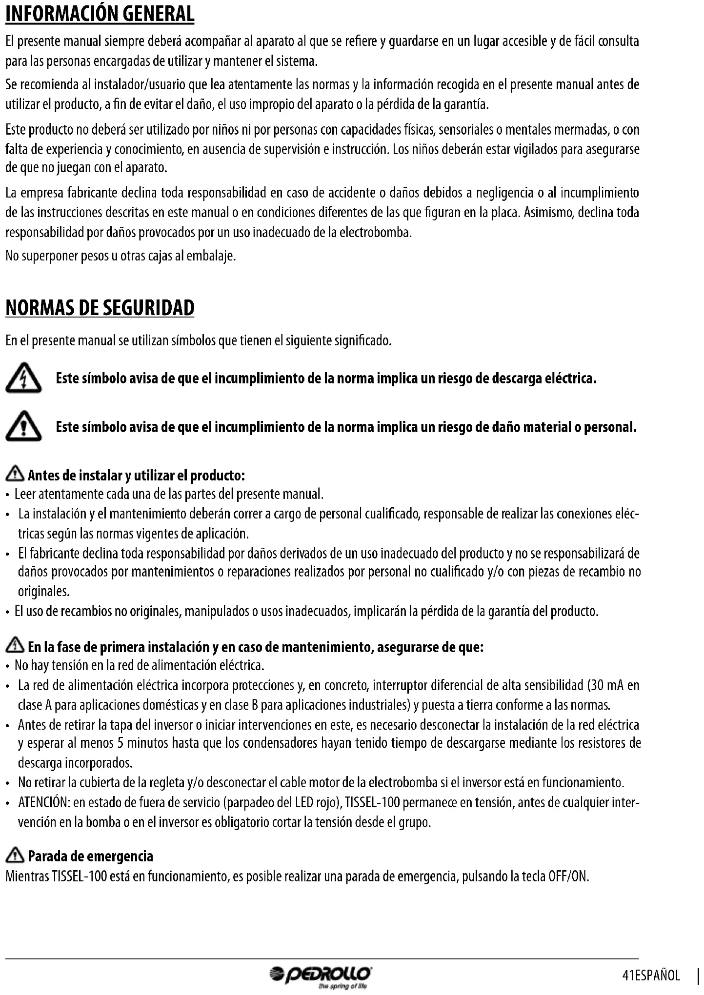 - Comprobar que todos los cables y las conexiones funcionan. PROBLEMA La bomba no se enciende Mensaje Causa Intervención Ninguno Interrupción de la alimentación eléctrica Restablecer la alimentación eléctrica Ninguno Fusibles quemados Sustituir los fusibles Ninguno Intervención de las protecciones de línea Comprobar la correcta calibración de las protecciones INPUT ERROR (solo modelos T/T) - Ias conexiones LÍNEA y MOTOR han sido invertidas Comprobar las conexiones LÍNEA y MOTOR y conectarlas de nuevo correctamente PROBLEMA Intervención del interruptor diferencial para proteger la línea de alimentación del inversor Mensaje Causa Intervención Ninguno El interruptor diferencial es inadecuado para la alimentación del inversor Sustituir el interruptor diferencial con un modelo adecuado a los componentes pulsadores y de corriente continua (clase A) PROBLEMA La bomba no arranca Mensaje Causa Intervención OFF La bomba está fuera de servicio (puesta fuera de servicio manual) Poner la bomba nuevamente en servicio pulsando la tecla ON/OFF PROBLEMA La bomba se ha detenido y no arranca Mensaje Causa Intervención OVER CURRENT Exceso de absorción de corriente respecto al valor congurado (parámetro A en PARÁMETROS BÁSICOS (BASIC) - Comprobar el correcto ajuste de la corriente - Comprobar que la tensión bajo carga no sea nunca demasiado baja (mín. – 15 %) - Que la electrobomba gire libre - Que el sentido de rotación sea correcto - Que los cables estén correctamente dimensionados CURRENT LIMIT Grave exceso de absorción de corriente, que excede la capacidad del módulo inversor - Comprobar que la electrobomba no esté bloqueada - Reducir la aceleración del motor (parámetro de fábrica) DRY RUNNING (DRY RUNNING PF) - Falta de agua en aspiración - Bomba no cebada - Aspiración obstruida - Rotación inversa del motor - Comprobar la presencia de agua en aspiración - Cebar la bomba - Comprobar la aspiración - Invertir el sentido de rotación del motor de la bomba LOW PRESS El sistema no alcanza la presión mínima Comprobar que no haya roturas en las tuberías. LOW VOLTAGE Desviación de la tensión superior a – 15 % del voltaje de placa Estabilizar la tensión para mantenerla dentro de la tolerancia ±15 % HIGH VOLTAGE Desviación de la tensión superior a + 15 % del voltaje de placa Estabilizar la tensión para mantenerla dentro de la tolerancia ±15 % OVER TEMP MODULE Sobretemperatura no tolerable del módulo inversor por sobrecarga o excesiva temperatura ambiente - Comprobar que no haya sobrecargas accidentales - Mejorar la refrigeración del ambiente Continúa i56 | ESPAÑOL PROBLEMA La bomba no se enciende Mensaje Causa Intervención COM ERROR La comunicación entre la tarjeta de control y la tarjeta de potencia se ha suspendido Si el mensaje persiste, pueden estar dañadas las tarjetas electrónicas LOW LEVEL Señal de nivel ausente con Entrada Señal de nivel activa Comprobar la presencia de agua en aspiración o el funcionamiento de la señal de nivel EXT OFF Puesta fuera de servicio mediante señal externa, con entrada Señal externa activa Restablecer el servicio mediante la señal externa Ninguno Avería del sensor de presión Comprobar la lectura en el visor con un manómetro de referencia, volver a calibrar o sustituir el sensor de presión. PROBLEMA Bomba siempre en funcionamiento, también sin ser solicitada Mensaje Causa Intervención Ninguno Pérdidas en el sistema superiores a 2 l/min Localizar las pérdidas y bloquearlas Ninguno Avería u obstrucción en el sensor de caudal Inspeccionar y limpiar el sensor de caudal PROBLEMA La bomba se detiene demasiado rápido, estando solicitada Mensaje Causa Intervención Ninguno Sensor de ujo averiado Comprobar el funcionamiento del sensor de ujo PROBLEMA Rendimiento de la bomba inferior al indicado en la placa Mensaje Causa Intervención Ninguno Presencia de aire en el colector de aspiración Purgar la aspiración Ninguno Bomba obstruida o dañada Inspeccionar la bomba y eliminar el problema57ESPAÑOL | GARANTÍA Antes de instalar y utilizar el producto leer atentamente todas las partes del presente manual. La instalación y el mantenimiento deberán correr a cargo de personal cualicado, responsable de realizar las conexiones eléctricas según las normas vigentes de aplicación. El fabricante declina toda responsabilidad por daños derivados de un uso inadecuado del producto y no se responsabilizará de daños provocados por mantenimientos o reparaciones realizados por personal no cualicado y/o con piezas de recambio no origi- nales. El uso de recambios no originales, manipulados o usos inadecuados implicarán la extinción de la garantía del producto que cubre un periodo de 24 meses desde la fecha de compra. ELIMINACIÓN Para eliminar las piezas que componen los cuadros TISSEL-100, atenerse a las normas y a las leyes vigentes en los países de uso del grupo. No dispersar partes contaminantes en el medioambiente. Correcta eliminación de los RAEE (DIRECTIVA 2012/19/UE)