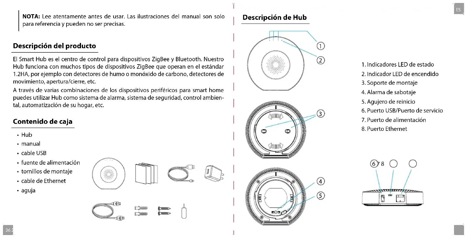 NOTA: Lee atentamente antes de usar. Las ilustraciones del manual son solo para referencia y pueden no ser precisas. Descripción del producto El Smart Hub es el centro de control para dispositivos ZigBee y Bluetooth. Nuestro Hub funciona con muchos tipos de dispositivos ZigBee que operan en el estándar 1.2HA, por ejemplo con detectores de humo o monóxido de carbono, detectores de movimiento, apertura/cierre, etc. A través de varias combinaciones de los dispositivos periféricos para smart home puedes utilizar Hub como sistema de alarma, sistema de seguridad, control ambien- tal, automatización de su hogar, etc. Contenido de caja