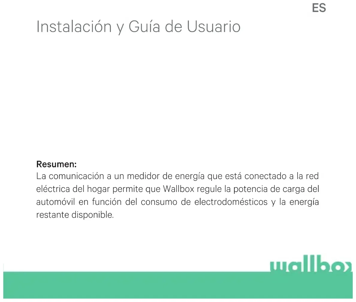 GND 12VEN Annex A.326 Fig. A3.1 Setting the RS485 switch to “T” In the cover of your Pulsar Plus remember to set the RS485 switch to “T”EN Fig. A3.2 Setting the RS485 switch to “T” In the cover of your Commander 2 remember to set the RS485 switch to “T”28Resumen: La comunicación a un medidor de energía que está conectado a la red eléctrica del hogar permite que Wallbox regule la potencia de carga del automóvil en función del consumo de electrodomésticos y la energía restante disponible. Instalación y Guía de Usuario ES30 El cargador debe instalarse siguiendo el manual de instalación correspondiente, que se entrega con el cargador. Solo los medidores de energía suministrados por Wallbox son compatibles con esta función. Solo personas cualificadas pueden realizar la instalación como se describe en este documento. Antes de la instalación del sistema Power Boost, el cargador Wallbox debe estar apagado y su cubierta debe retirarse. Después, el Wallbox debe estar correctamente cerrado, como se define en su manual de instalación.