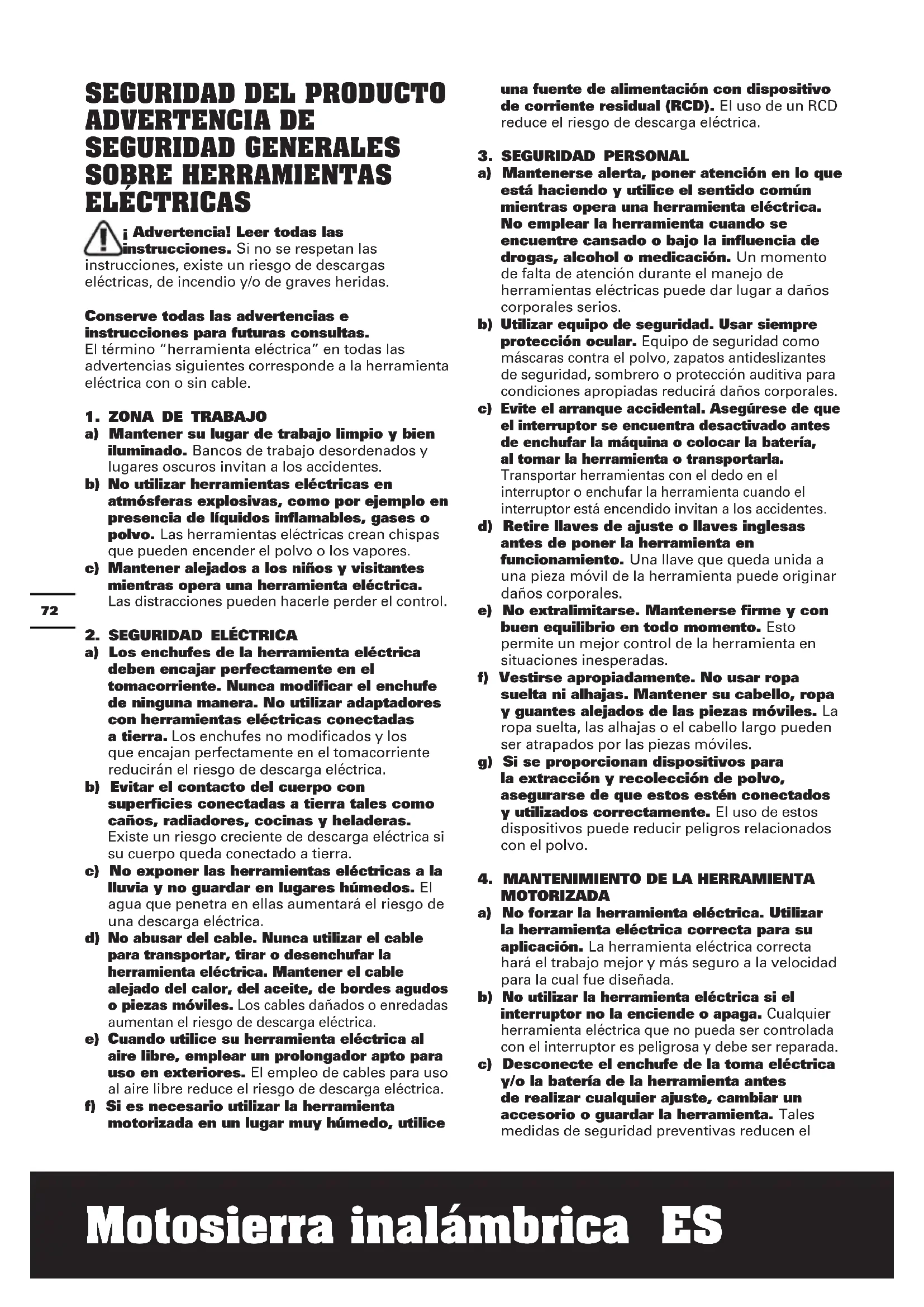 ADVERTENCIA DE SEGURIDAD GENERALES SOBRE HERRAMIENTAS ELÉCTRICAS ¡ Advertencia! Leer todas las instrucciones. Si no se respetan las instrucciones, existe un riesgo de descargas eléctricas, de incendio y/o de graves heridas. Conserve todas las advertencias e instrucciones para futuras consultas. El término “herramienta eléctrica” en todas las advertencias siguientes corresponde a la herramienta eléctrica con o sin cable.