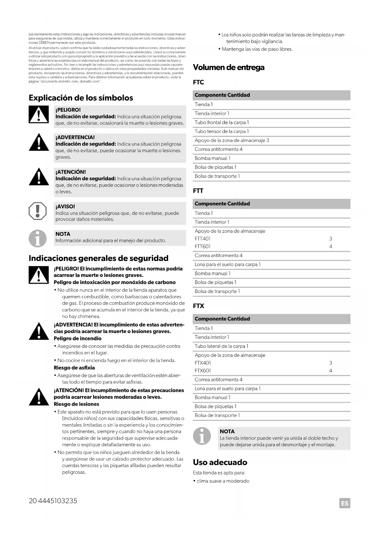 - clima suave a moderado ¡PELIGRO! Indicación de seguridad: Indica una situación peligrosa que, de no evitarse, ocasionará la muerte o lesiones graves. ¡ADVERTENCIA! Indicación de seguridad: Indica una situación peligrosa que, de no evitarse, puede ocasionar la muerte o lesiones graves. ¡ATENCIÓN! Indicación de seguridad: Indica una situación peligrosa que, de no evitarse, puede ocasionar o lesiones moderadas o leves. ¡AVISO! Indica una situación peligrosa que, de no evitarse, puede provocar daños materiales. NOTA Información adicional para el manejo del producto. Componente Cantidad Tienda 1 Tienda interior 1 Tubo frontal de la carpa 1 Tubo tensor de la carpa 1 Apoyo de la zona de almacenaje 3 Correa antitormenta 4 Bomba manual 1 Bolsa de piquetas 1 Bolsa de transporte 1 Componente Cantidad Tienda 1 Tienda interior 1 Apoyo de la zona de almacenaje FTT401 FTT601