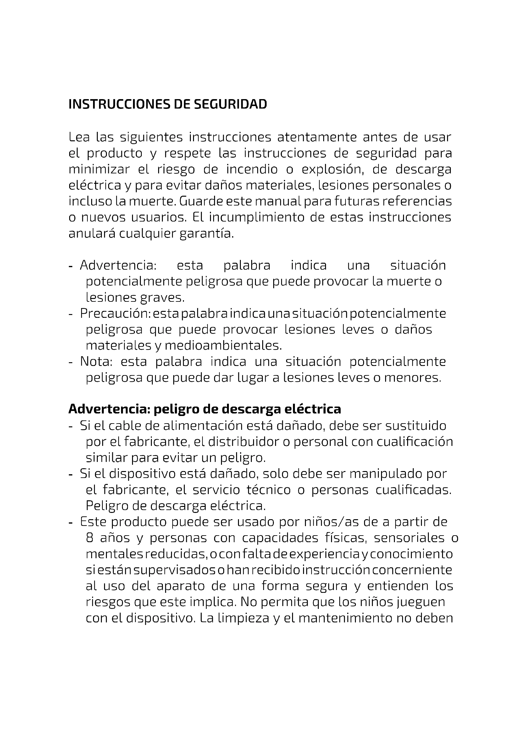 02380_Bolero DressCode Top 80 Inverter_Manual_YV_01220209.indd 302380_Bolero DressCode Top 80 Inverter_Manual_YV_01220209.indd 3 10/2/22 9:4310/2/22 9:43INSTRUCCIONES DE SEGURIDAD Lea las siguientes instrucciones atentamente antes de usar el producto y respete las instrucciones de seguridad para minimizar el riesgo de incendio o explosión, de descarga eléctrica y para evitar daños materiales, lesiones personales o incluso la muerte. Guarde este manual para futuras referencias o nuevos usuarios. El incumplimiento de estas instrucciones anulará cualquier garantía. - Advertencia: esta palabra indica una situación potencialmente peligrosa que puede provocar la muerte o lesiones graves. - Precaución: esta palabra indica una situación potencialmente peligrosa que puede provocar lesiones leves o daños materiales y medioambientales. - Nota: esta palabra indica una situación potencialmente peligrosa que puede dar lugar a lesiones leves o menores. Advertencia: peligro de descarga eléctrica - Si el cable de alimentación está dañado, debe ser sustituido por el fabricante, el distribuidor o personal con cualicación similar para evitar un peligro. - Si el dispositivo está dañado, solo debe ser manipulado por el fabricante, el servicio técnico o personas cualicadas. Peligro de descarga eléctrica. - Este producto puede ser usado por niños/as de a partir de 8 años y personas con capacidades físicas, sensoriales o mentales reducidas, o con falta de experiencia y conocimiento si están supervisados o han recibido instrucción concerniente al uso del aparato de una forma segura y entienden los riesgos que este implica. No permita que los niños jueguen con el dispositivo. La limpieza y el mantenimiento no deben 02380_Bolero DressCode Top 80 Inverter_Manual_YV_01220209.indd 402380_Bolero DressCode Top 80 Inverter_Manual_YV_01220209.indd 4 10/2/22 9:4310/2/22 9:43llevarse a cabo por niños sin supervisión. - Mantenga a los niños menores de 3 años alejados del aparato o bajo supervisión continua. - Animales y niños podrían trepar a la máquina. Compruébela antes de cada lavado. - No trepe ni se siente sobre la unidad. Lugar de instalación y entorno - No instale la lavadora sobre una supercie que impida la ventilación de la base, como una alfombra. La obstrucción de las aberturas puede dañar la máquina. - Mantenga el aparato alejado de fuentes de calor y de la luz solar directa para evitar que las piezas de plástico y goma se dañen. - No utilice el aparato en entornos húmedos o en habitaciones que contengan gases explosivos o cáusticos. En caso de fugas o salpicaduras de agua, deje que el aparato se seque solo. - No instale el aparato detrás de puertas con cerradura, puertas correderas o puertas con bisagras en la parte contraria a la del dispositivo. - No utilice la máquina en habitaciones con una temperatura inferior a 5°C. Esto puede causar daños en las partes de la misma. Si es inevitable, asegúrese de vaciar completamente el agua del aparato después de cada uso (revise la sección de "Mantenimiento - Limpieza del ltro de la bomba de desagüe") para evitar daños causados por heladas. - No utilice nunca aerosoles o sustancias inamables cerca del aparato. Instalación - Retire todo el material de embalaje y los pernos de transporte antes de utilizar el aparato. De lo contrario, 02380_Bolero DressCode Top 80 Inverter_Manual_YV_01220209.indd 502380_Bolero DressCode Top 80 Inverter_Manual_YV_01220209.indd 5 10/2/22 9:4310/2/22 9:43pueden producirse daños graves. - ATENCIÓN: no conecte la lavadora a una red de agua caliente. - La clavija del enchufe debe quedar accesible tras la instalación. - La lavadora se debe calibrar antes de ponerla en funcionamiento. - No coloque objetos excesivamente pesados sobre el aparato, como recipientes de agua o aparatos calefactores. - Debe utilizar los nuevos juegos de mangueras suministrados con el aparato, no reutilice las mangueras viejas. - La presión máxima admisible del agua de entrada es de 1 MPa. La presión mínima admisible del agua de entrada es de 0,1 MPa. Conexiones eléctricas - Asegúrese de que el voltaje de red coincida con el voltaje especicado en el producto y de que el enchufe tenga toma de tierra. - Inspeccione el cable de alimentación regularmente en busca de daños visibles. Si el cable presenta daños, debe ser reparado por el Servicio de Asistencia Técnica ocial de Cecotec para evitar cualquier peligro. - No use el producto si el cable, el enchufe o la estructura presentan daños o no funcionan correctamente. - En caso de anomalías (ruidos anormales, olor a quemado, humo, etc.), desconecte inmediatamente del enchufe para detener la máquina y póngase en contacto con el Servicio de Atención al Cliente de Cecotec. - Asegúrese de que el cable de alimentación no queda atrapado bajo la máquina, ya que podría dañarse. - La instalación de la toma de tierra debe ser realizada por un electricista cualicado. 02380_Bolero DressCode Top 80 Inverter_Manual_YV_01220209.indd 602380_Bolero DressCode Top 80 Inverter_Manual_YV_01220209.indd 6 10/2/22 9:4310/2/22 9:43- Asegúrese de que la máquina está instalada de acuerdo con la normativa local. - Es recomendable que lo dispositivos eléctricos y de agua sean conectados por técnicos cualicados de acuerdo con las regulaciones locales y nacionales de seguridad especicadas por el fabricante. No utilice enchufes múltiples o cables alargadores - Este dispositivo no debe ser controlado por medio de elementos de conmutación externos como temporizadores, ni conectado a circuitos eléctricos que se conectan y desconectan continuamente. - No desconecte el enchufe de la toma de corriente si hay gas inamable cerca. - No tire del cable para desconectarlo, tire del enchufe. No manipule el enchufe o el aparato con las manos mojadas. Conexión de agua - Compruebe las conexiones de las mangueras de entrada de agua, el grifo y la manguera de desagüe para detectar posibles pr