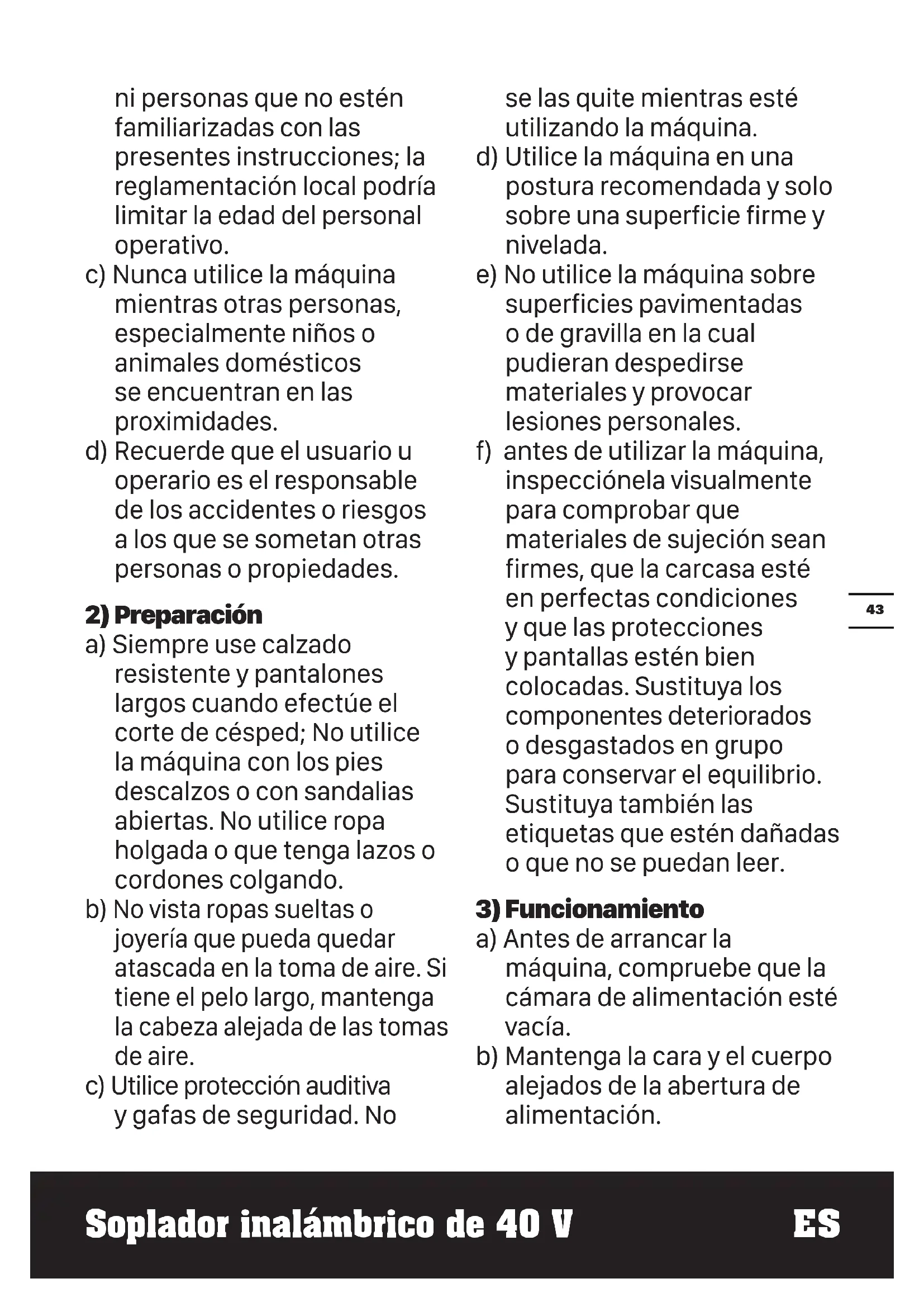 a) Lea cuidadosamente las instrucciones. Familiarícese con los controles y el uso apropiado de la herramienta. b) No permita nunca que utilicen la máquina niños, personas con limitaciones físicas, sensoriales o intelectuales o que no posean la experiencia o los conocimientos necesarios,Soplador inalámbrico de 40 V