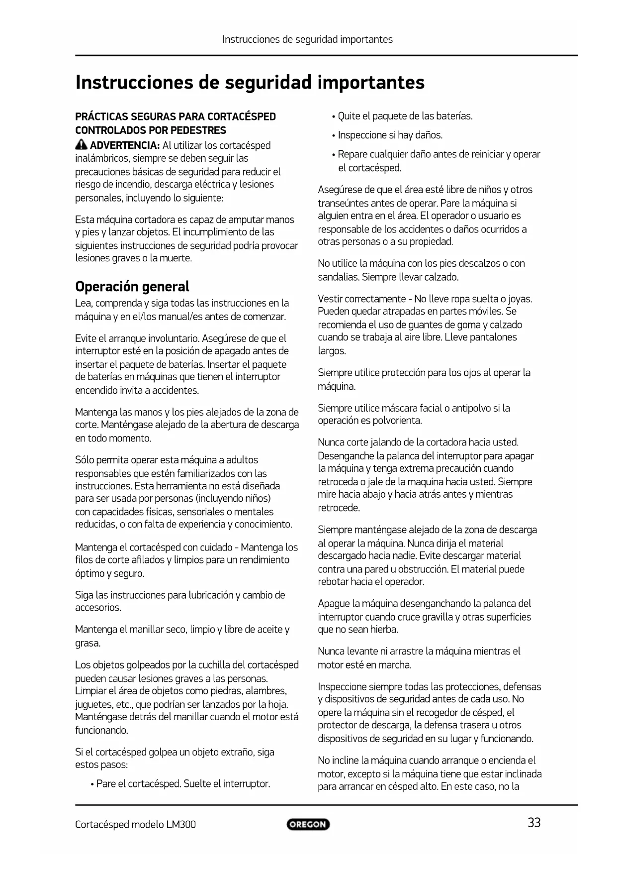 - Figures Precios y especificaciones de © Blount, Inc. sujetos a cambios sin previo aviso. Todos los derechos reservados. Oregon® es una marca registrada de Blount, Inc. en los Estados Unidos y/o en otros países.33 Instrucciones de seguridad importantes Cortacésped modelo LM300 p. 60