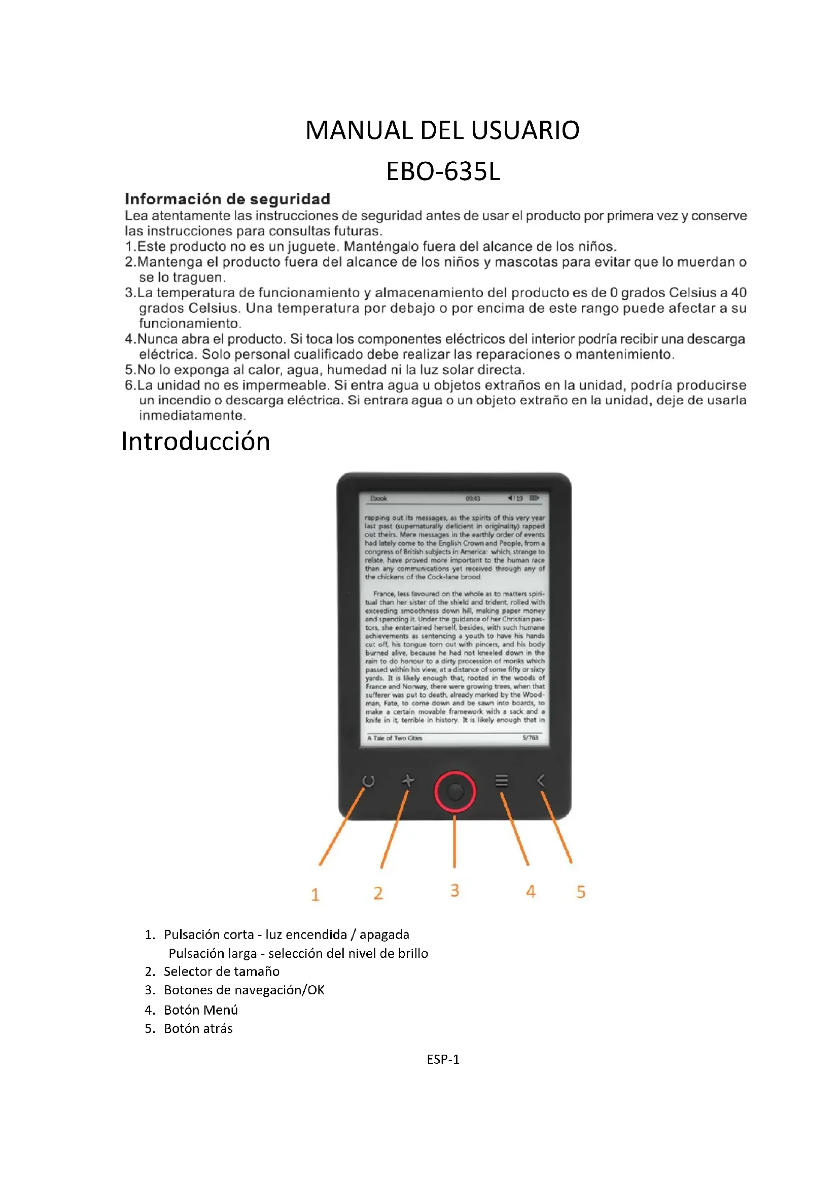 que la función está deshabilitada). 2.Fuentes El dispositivo no garantiza que se muestre adecuadamente cada archivo de este dispositivo. La muestra correcta de fuentes, en especial, las marcas diacríticas, en este lector depende únicamente del formato de archivo del libro electrónico y su se ha preparado para mostrarse en un lector de libros electrónicos. Para archivos en formato .txt, sugerimos que se asegure de que el archivo está en formato UTF para que se muestren las fuentes de forma óptima. Cuando lea libros electrónicos en formatos .rtf/.txt/.fb2/.mobi en un idioma con marcas diacríticas, sugerimos que no use la Fuente predeterminada para una muestra óptima de las fuentes. Imágenes Abra la sección para mostrar todas las imágenes (tanto en la memoria interna como en la tarjeta microSD si está insertada). Para ver las funciones disponibles cuando abra una imagen, pulse el botón Menú para abrir el submenú de imágenes. La primera página del submenú ofrece las siguientes opciones: Configurar la imagen como salvapantallas, restaurar el salvapantallas predeterminado, configurar la imagen como pantalla inactive, restaurar la pantalla inactive predeterminada, girar la imagen, acercar / alejar. Pulse los botones “Izquierda”/“Derecha” para mostrar la segunda página del submenú, donde puede fijar el intervalo de diapositivas: Off / 5 segundos /10 segundos / 20 segundos / 30 segundos / 1 minuto, así como la información en pantalla de la imagen (nombre y formato) y salir del submenú. Explorer Entre en la pestaña Explorer para mostrar el navegador del archivo del lector. Mientras está en la subcarpeta de memoria, pulse el botón “Menú” para mostrar una lista de opciones adicionales: Buscar, eliminar, y ver el contenido de la memoria interna o externa. Búsqueda Entre en la pestaña Búsqueda. La pantalla mostrará el menú de búsqueda. Use los botones direccionales Para introducir una frase de búsqueda, pulse HECHO y pulse OK para iniciar la búsqueda. El dispositivo mostrará todos los libros electrónicos disponibles que contengan el término de búsqueda. Puede buscar los archivos por nombre de archivo o autor. Otros La sección Otros consta de 2 submenús: Pestañas de calendario y juegos. 1.Calendario. Entre en esta pestaña para mostrar el calendario. El calendario se abrirá en el mes actual, con el día actual marcado (recuerde configurar la fecha correcta en Configuración). 2.Juegos. El lector lleva preinstalados dos juegos: Sokoban y Jigsaw. Ajustes 1.Modo actualización Entre en esta pestaña para configurar la frecuencia de actualización de la pantalla: Tras cada página / tras cada 3 páginas / tras cada 5 páginas. 2.Ajustes de alimentación Entre en esta pestaña para fijar el cierre automático y la hora en espera. ESP-42.1. Cierre automático: El usuario puede bien deshabilitar la función de cierre automático o fijarla en 1 / 2 / 3 / 4 horas (el dispositivo se apagará automáticamente tras el tiempo fijado para ahorrar energía). Nota: El usuario puede personalizar la pantalla inactiva conforme a sus necesidades: Abra una imagen precargada, pulse el botón Menú y seleccione "Fijar como pantalla inactiva ". 2.2. En espera: Deshabilite o seleccione 5 / 10 / 15 / 30 minutos / 1 hora. Cuando está habilitado, la función cambia al lector al modo en espera para ahorrar energía. Nota: El usuario puede personalizar el salvapantallas conforme a sus necesidades: Abra una imagen precargada, pulse el botón “Menú” y seleccione "Establecer como salvapantallas ".