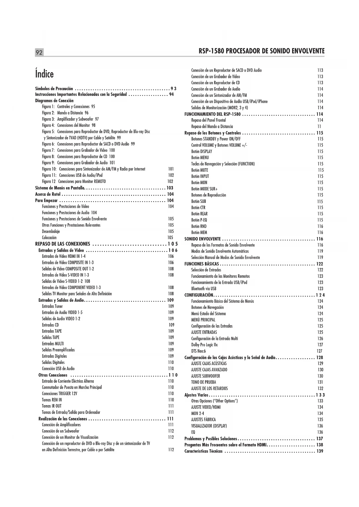 - Diagramas de ConexiónFigura 1: Controles y Conexiones 95Figura 2: Mando a Distancia 96Figura 3: Amplificador y Subwoofer 97Figura 4: Conexiones del Monitor 98Figura 5: Conexiones para Reproductor de DVD, Reproductor de Blu-ray Disc y Sintonizador de TVAD (HDTV) por Cable y Satélite 99Figura 6: Conexiones para Reproductor de SACD o DVD Audio 99Figura 7: Conexiones para Grabador de Vídeo 100Figura 8: Conexiones para Reproductor de CD 100Figura 9: Conexiones para Grabador de Audio 101Figura 10: Conexiones para Sintonizador de AM/FM y Radio por Internet 101Figura 11: Conexiones USB de Audio/iPod 102Figura 12 Conexiones para Monitor REMOTO 102Sistema de Menús en Pantalla p. 103