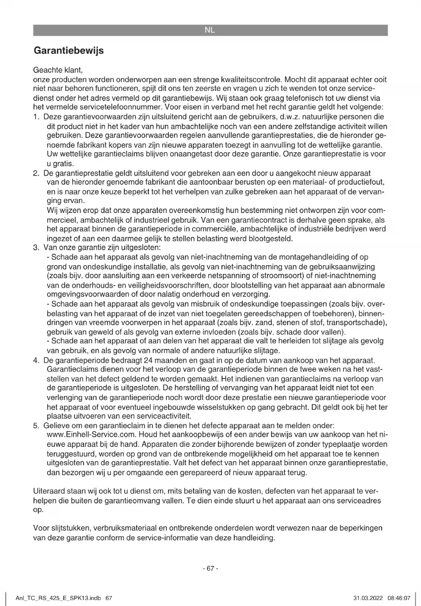 www.Einhell-Service.com. Tenga a mano el recibo de compra o cualquier otro comprobante que acredite la compra del aparato nuevo. La garantía no cubre aquellos aparatos que se envíen sin el comprobante pertinente o sin la placa de identifi cación puesto que resulta difícil clasifi carlos del modo correspondiente. Si nuestra prestación de garantía incluye el defecto aparecido en el aparato, recibirá de inmediato un aparato reparado o nuevo de vuelta. Naturalmente, también solucionaremos los defectos del aparato que no se encuentren comprendidos o ya no se encuentren comprendidos en la garantía, en este caso contra reembolso de los costes. Para ello, envíe el aparato a nuestra dirección de servicio técnico. Para piezas de desgaste, de repuesto y falta de piezas nos remitimos a las limitaciones de esta garantía conforme a la información de servicio de este manual de instrucciones. Anl_TC_RS_425_E_SPK13.indb 74Anl_TC_RS_425_E_SPK13.indb 74 31.03.2022 08:46:1031.03.2022 08:46:10FIN